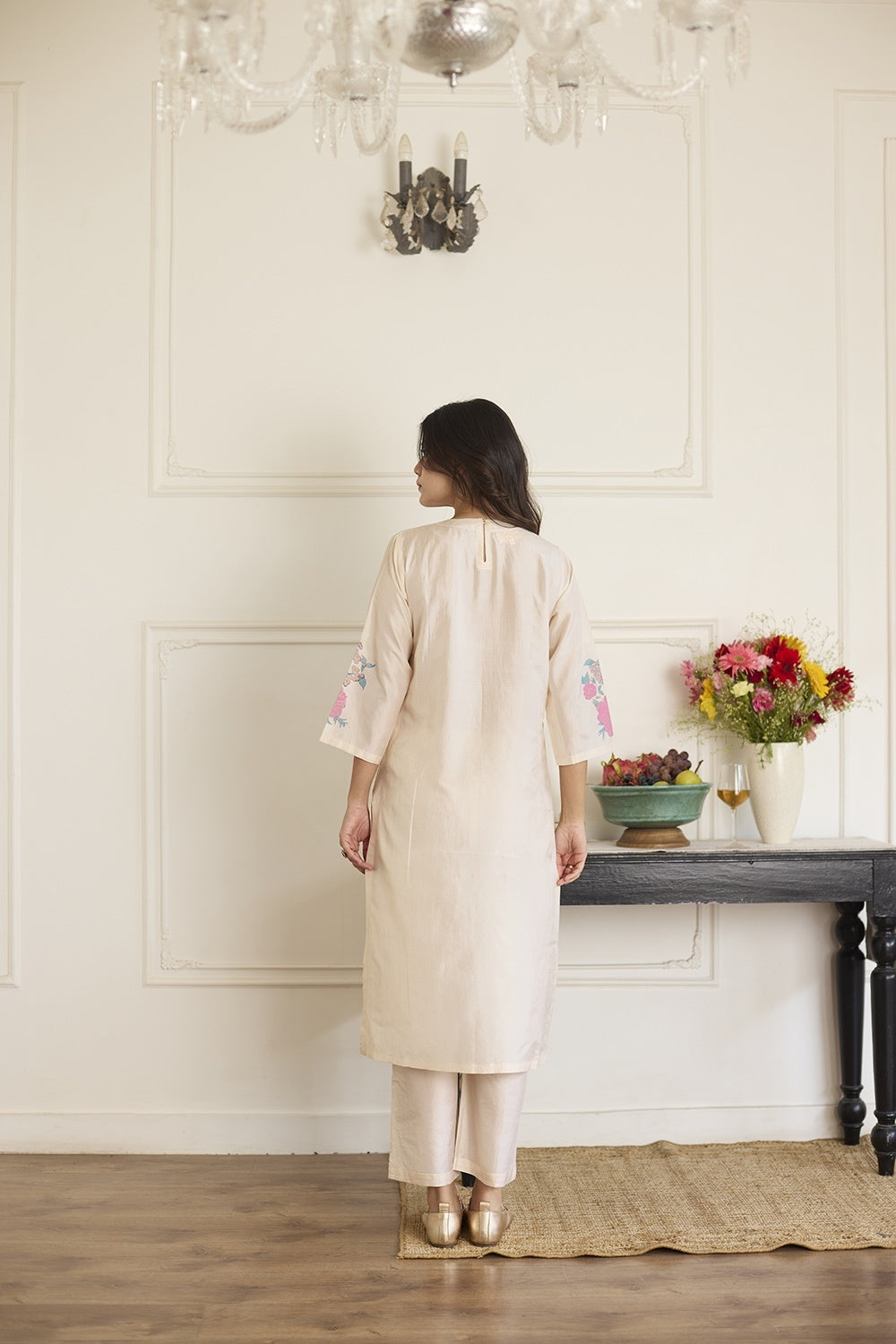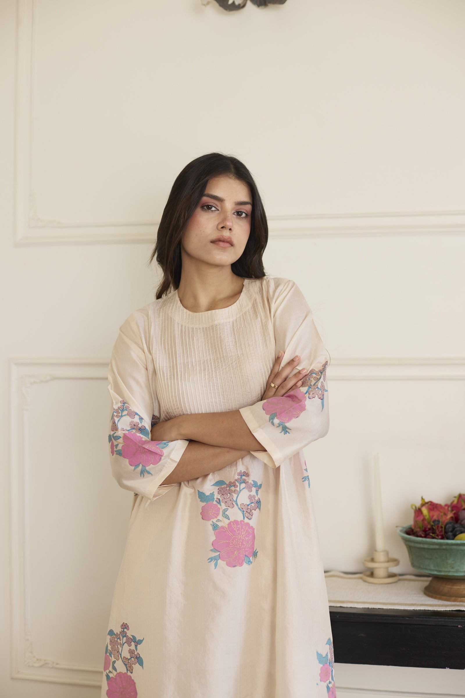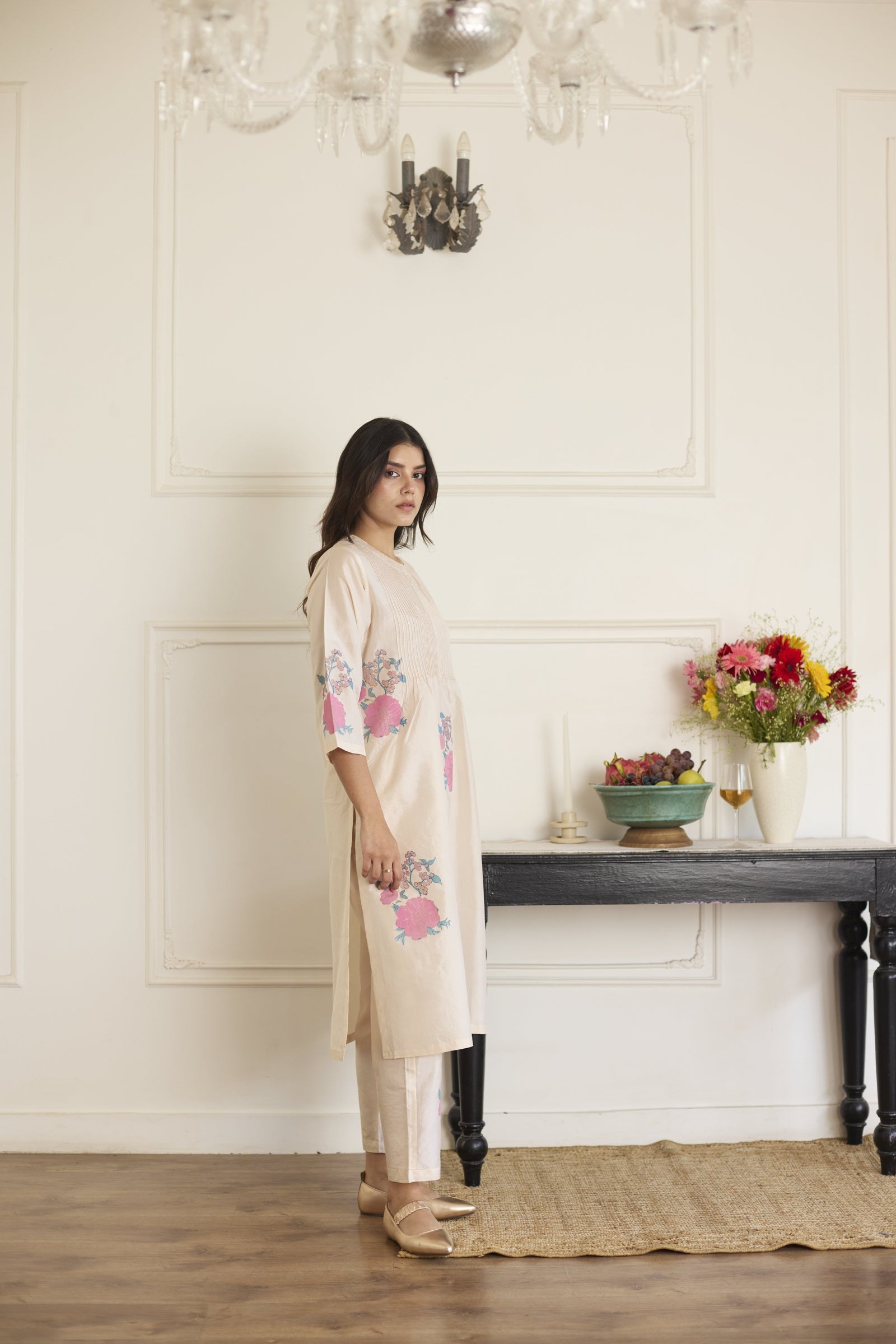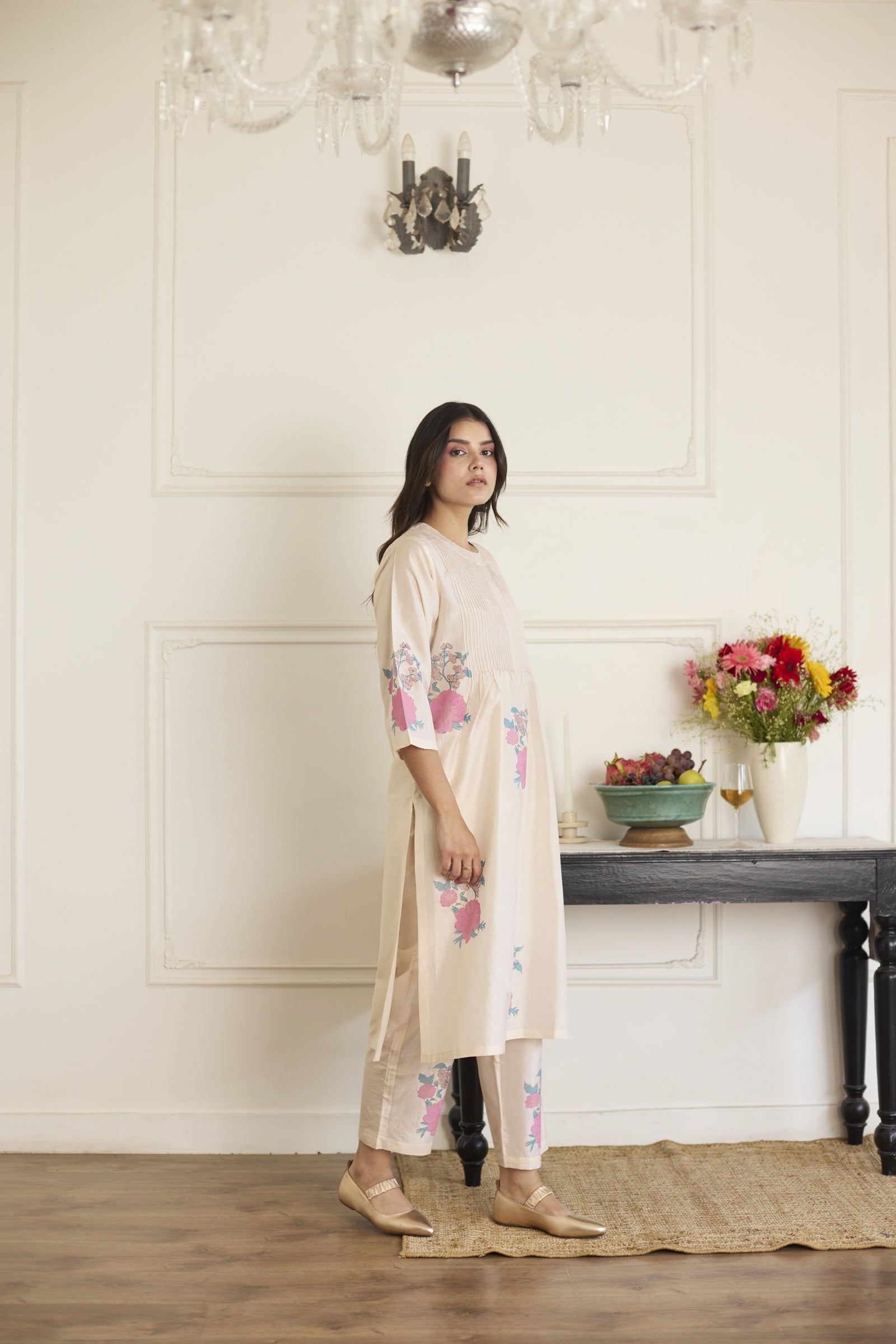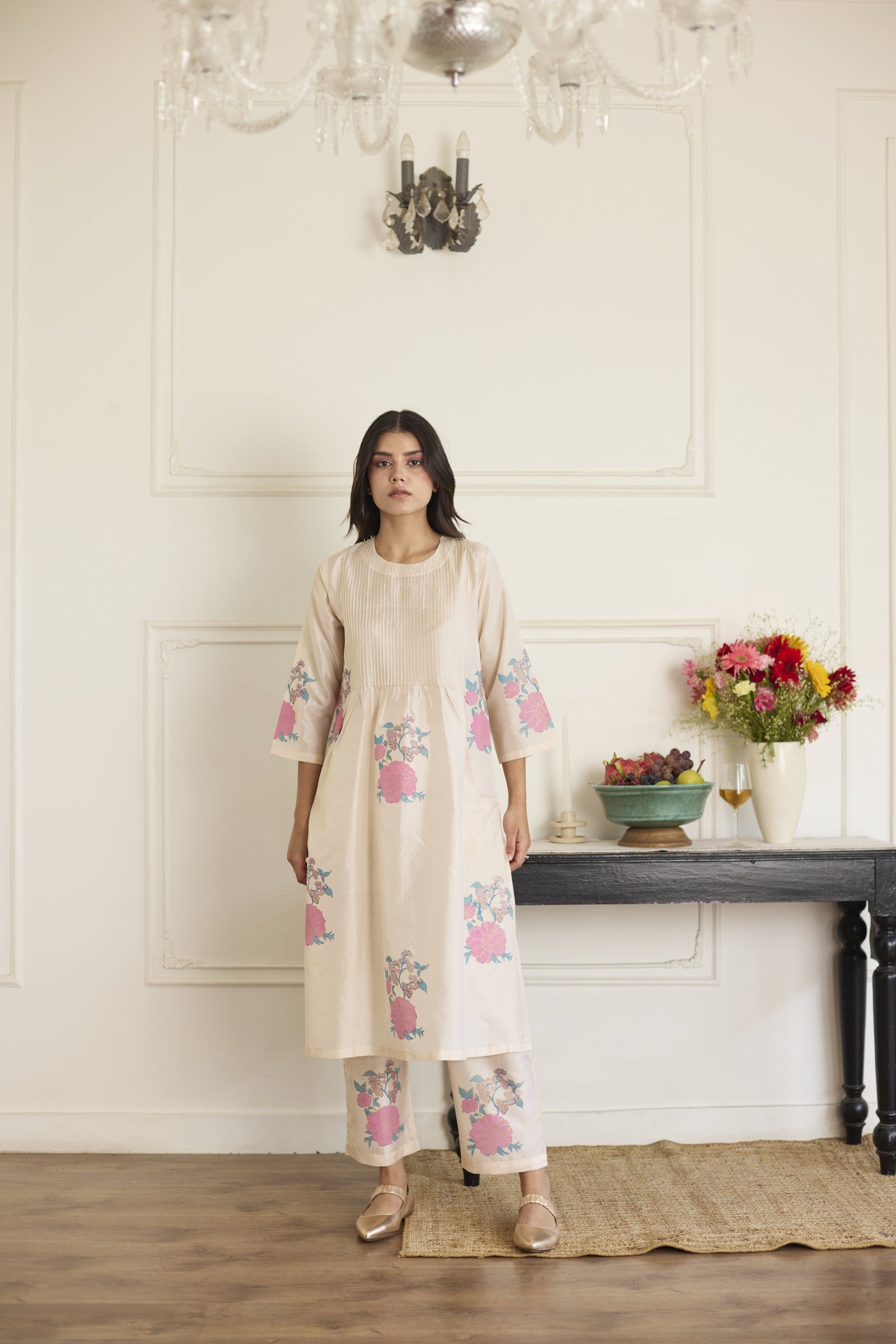 This relaxed-fit handcrafted silk co-ord features hand block prints and delicate pintuck detailing along the neckline, with the tunic pairing seamlessly with matching silk trousers for a graceful, comfortable fit. Each handcrafted piece showcases unique variations in print and color, reflecting the artisan's dedication and the authentic beauty of handmade silk garments.