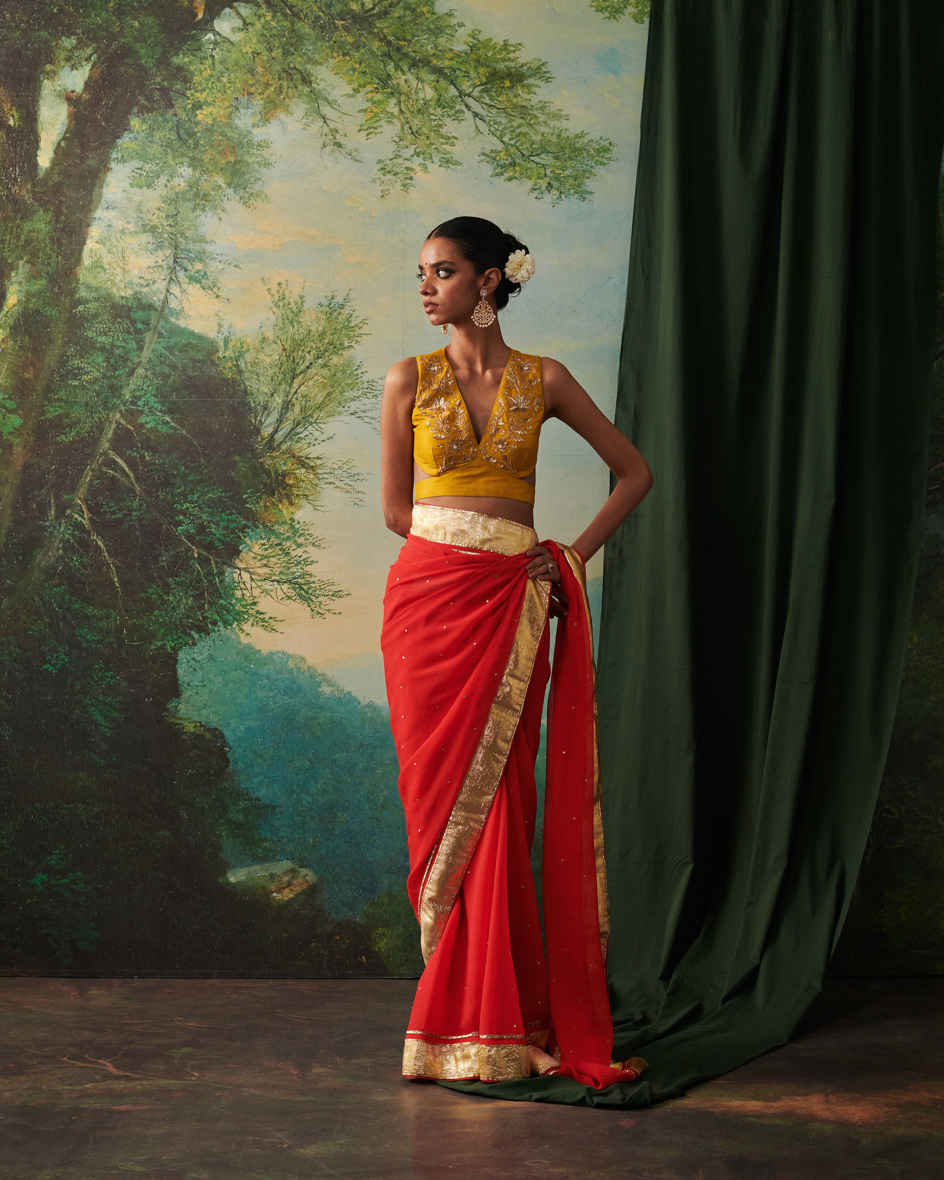 Aafiya' blouse in pure silk, featuring a sharp V-neckline and back-tie detailing. The front is hand-embroidered with floral vines using sequins, cutdana, and bead work-creating a glimmering surface that catches light with every movement. The placement of embroidery flows from the shoulder into the bust, balancing bold craftsmanship with gentle restraint.