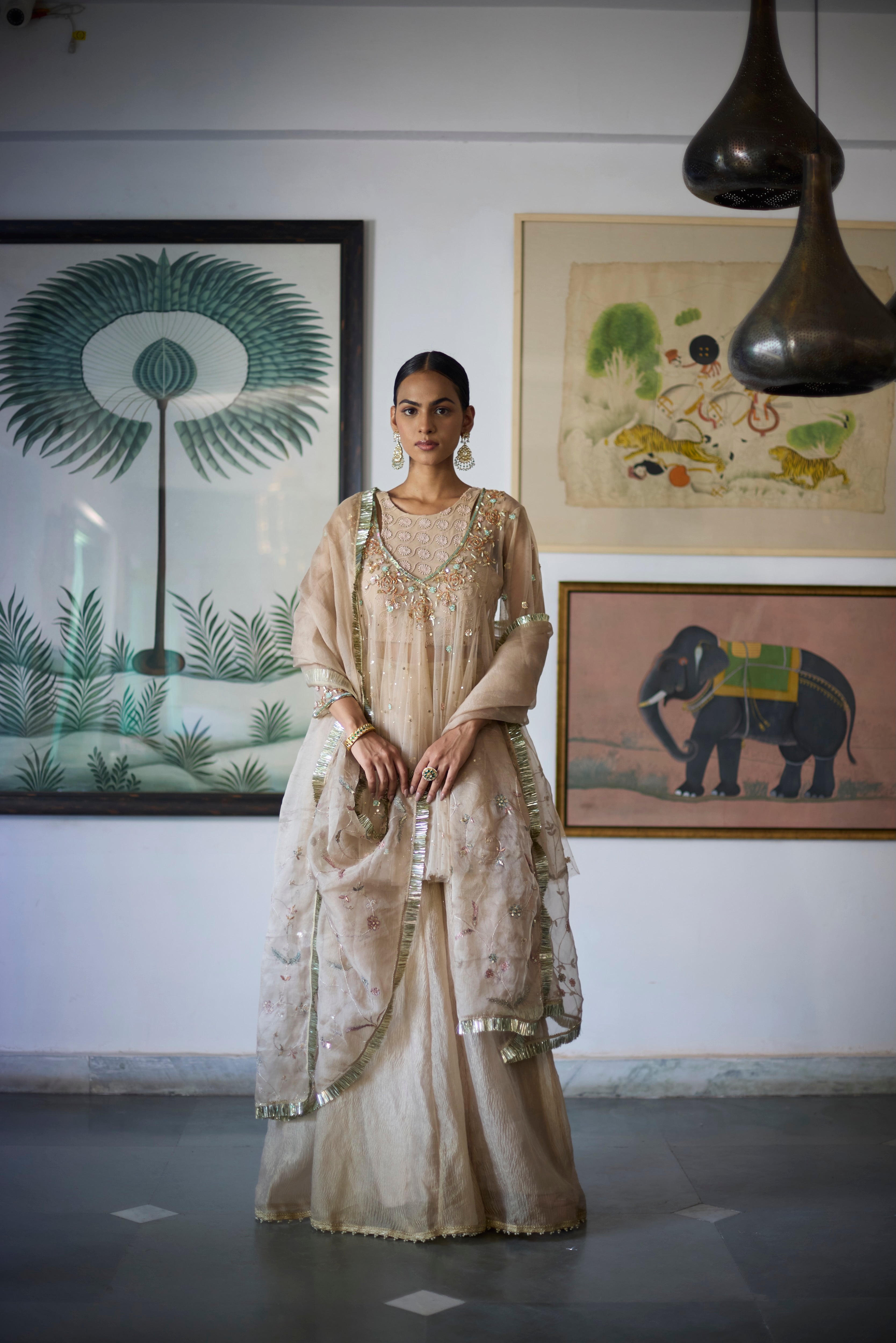 Gracefully blend tradition and modernity with this almond Mukaish tulle short embroidered Anarkali, paired with a silk tissue crinkled sharara and a delicate organza odhani. A luxurious and ethereal look, perfect for festive celebrations and elegant occasions.