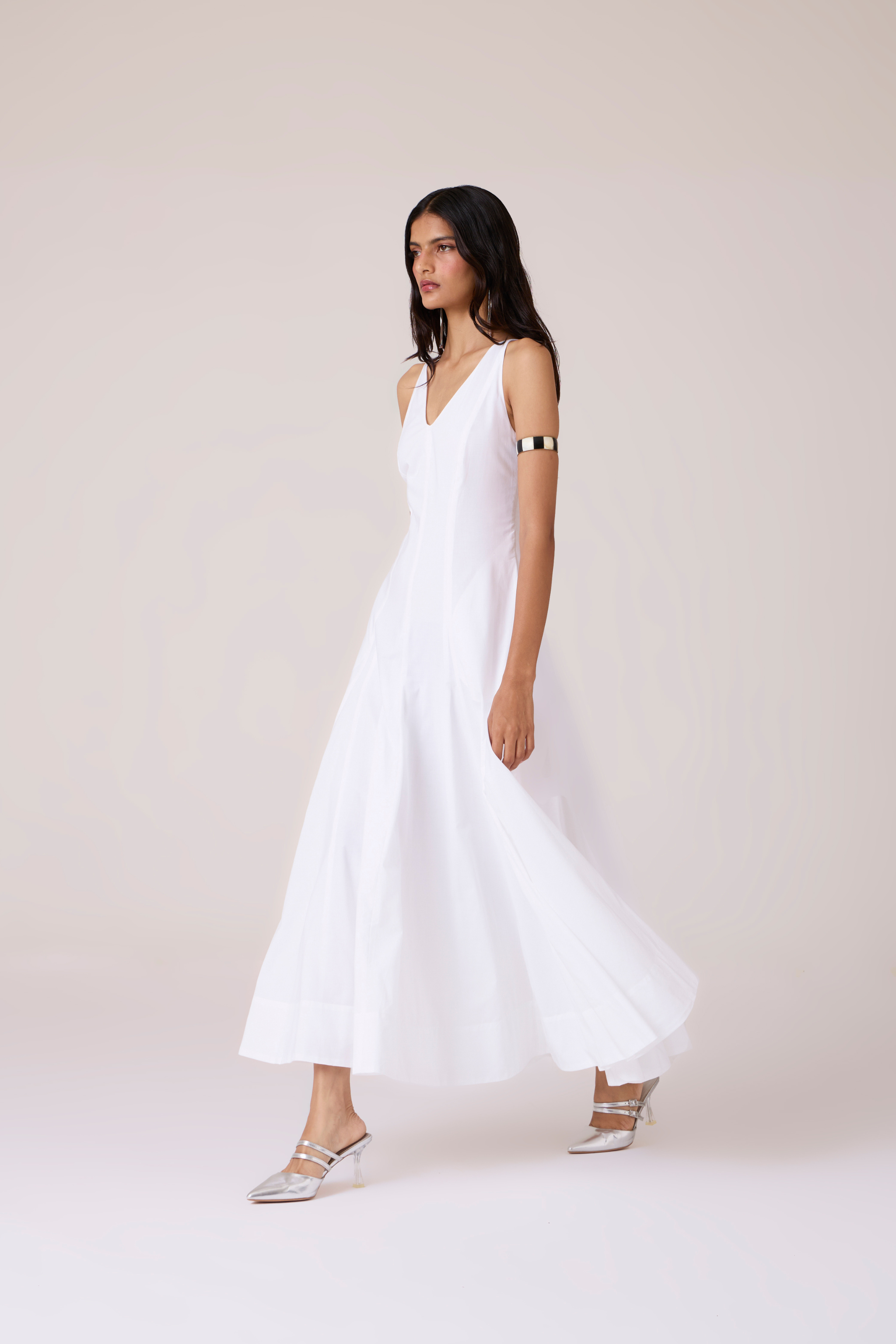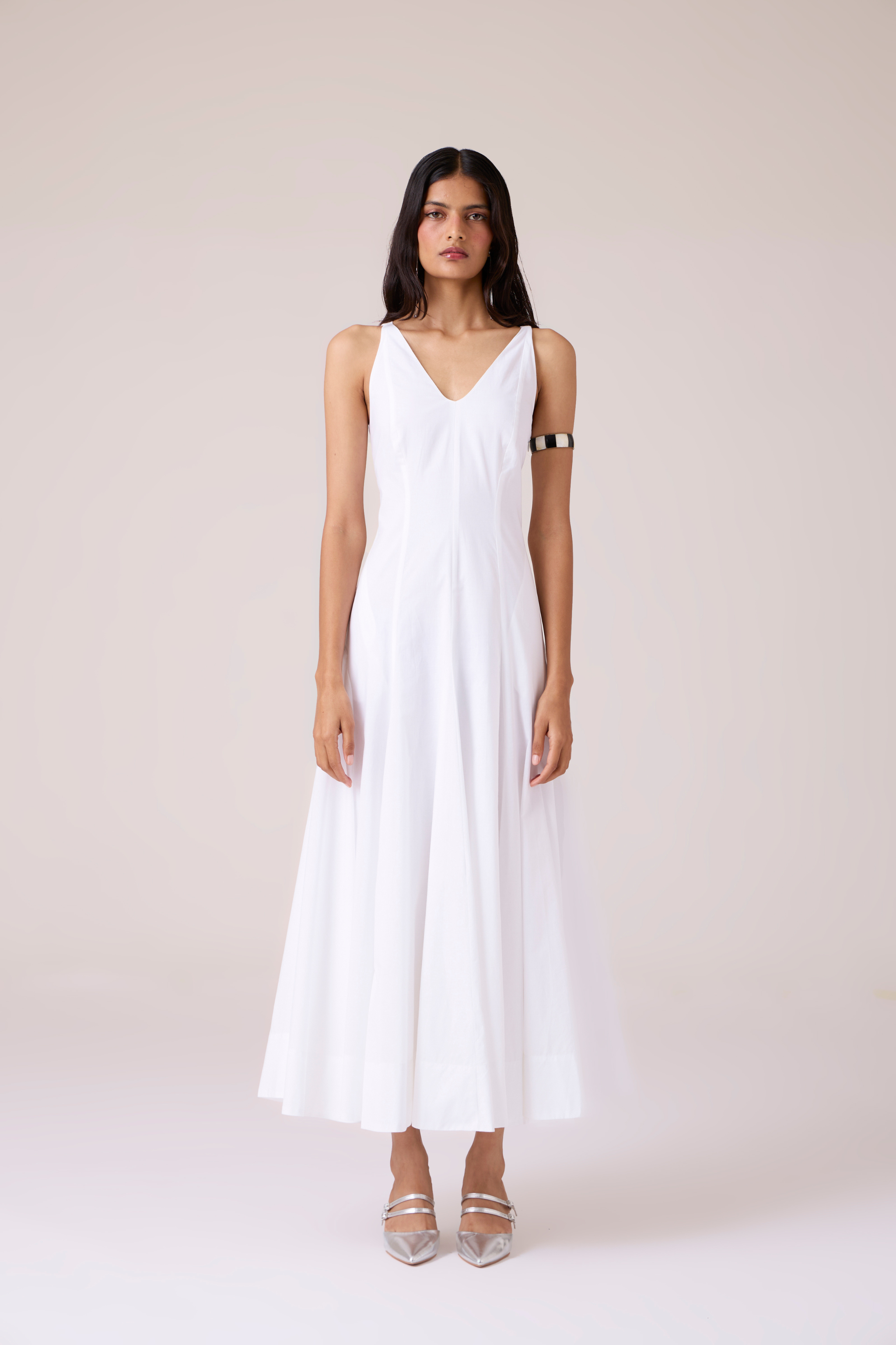 This maxi dress celebrates purity of line through precise paneling. Crafted in pure white organic cotton cambric, the silhouette is defined by proportion alone. Front and back V-neck construction creates clean lines, while the fully lined interior ensures proper fall and coverage. A concealed side zip fastening maintains the uninterrupted aesthetic. Articulated simplicity where form becomes the ornament.