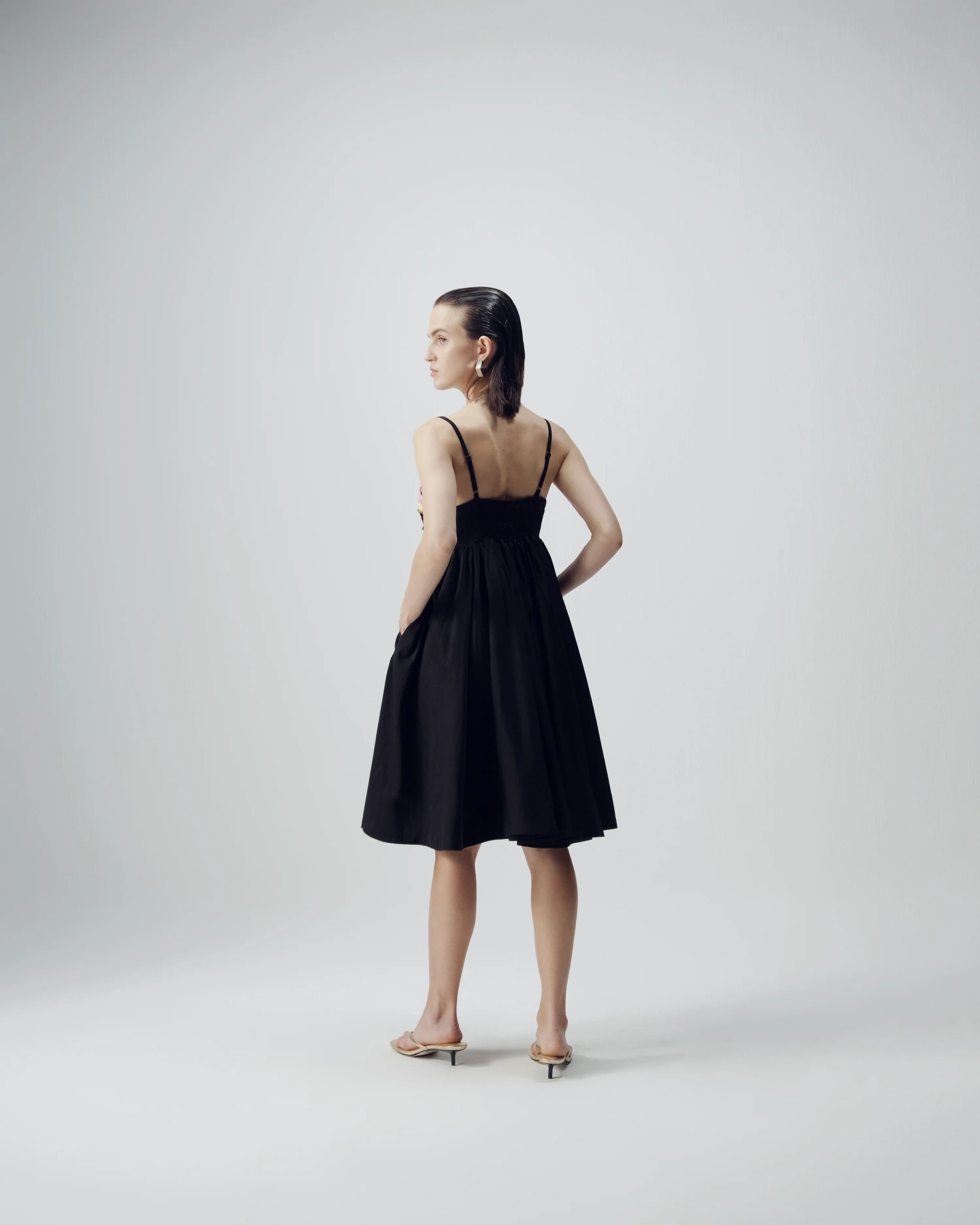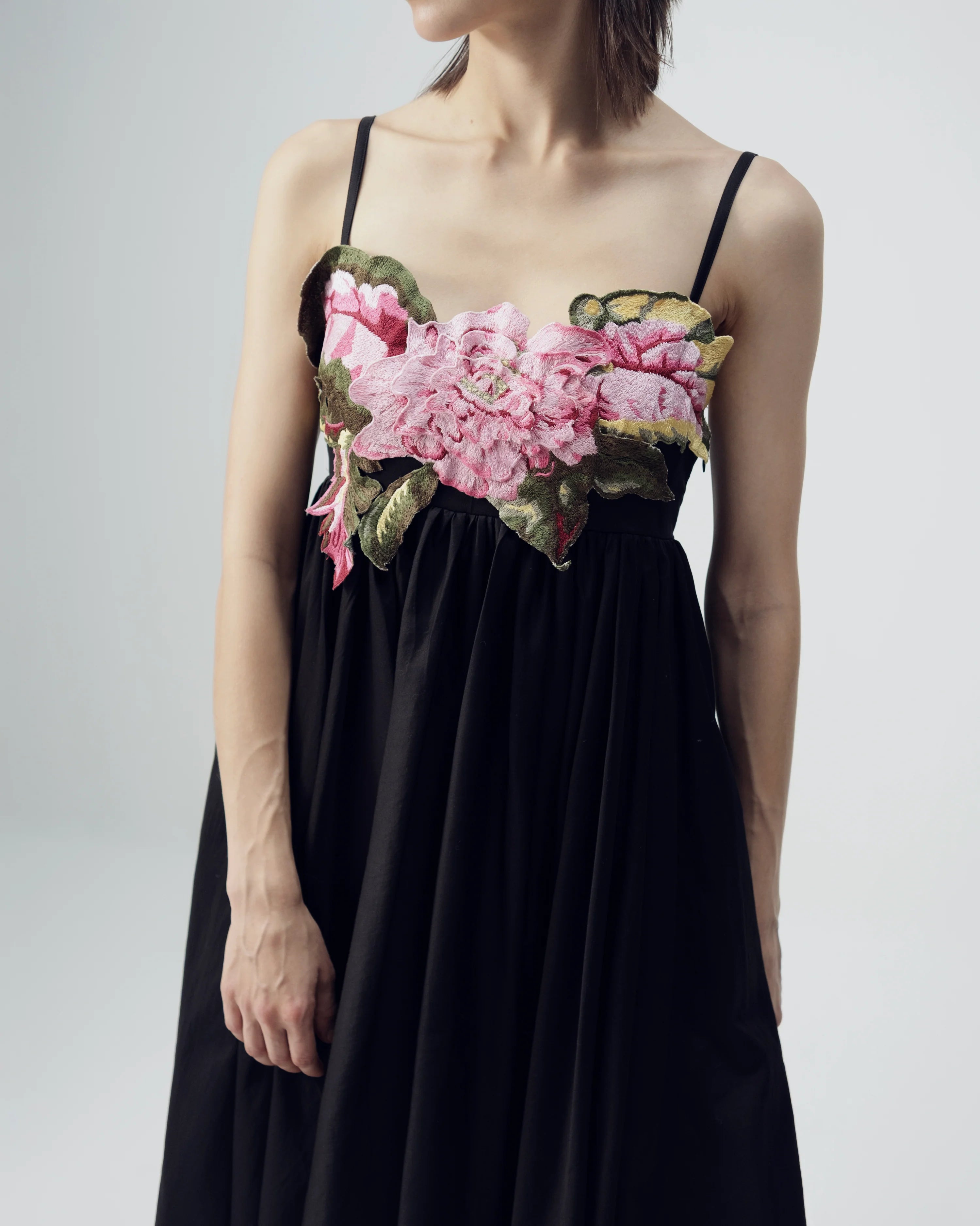 This chic black midi dress features delicate adjustable shoulder straps, a soft, flowy A-line silhouette, and a beautifully machine-embroidered floral patch on the bodice with pink blossoms and lush green leaves, combining minimal elegance with artisanal charm; crafted in lightweight cotton satin with an elasticated back panel for comfort and structure, it is perfect for brunches, intimate gatherings, evening outings, or elevated daywear.