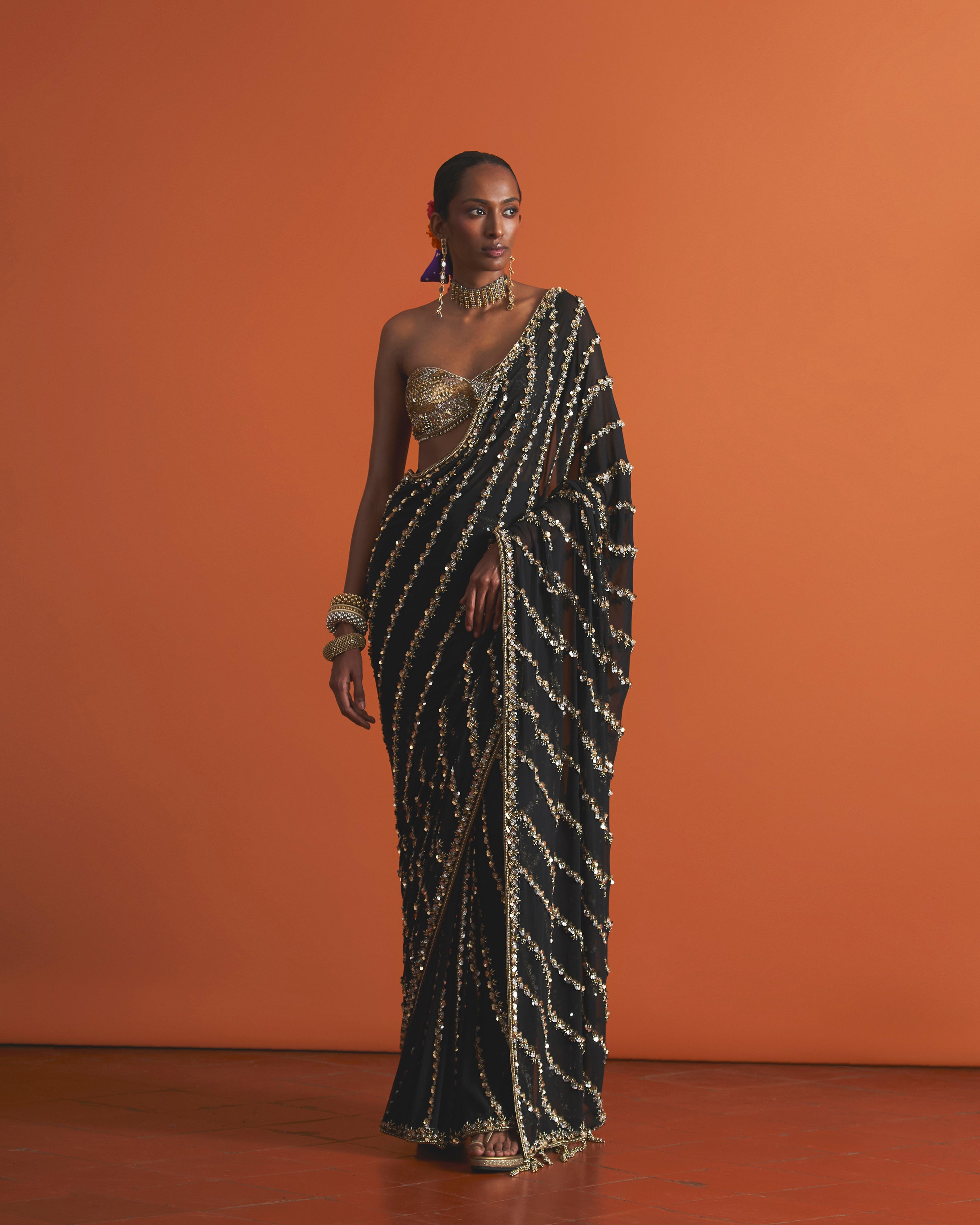 This glamorous two-piece ensemble features a black sequin saree crafted in flowing georgette, elegantly paired with a contemporary bandeau blouse in luxurious crepe.