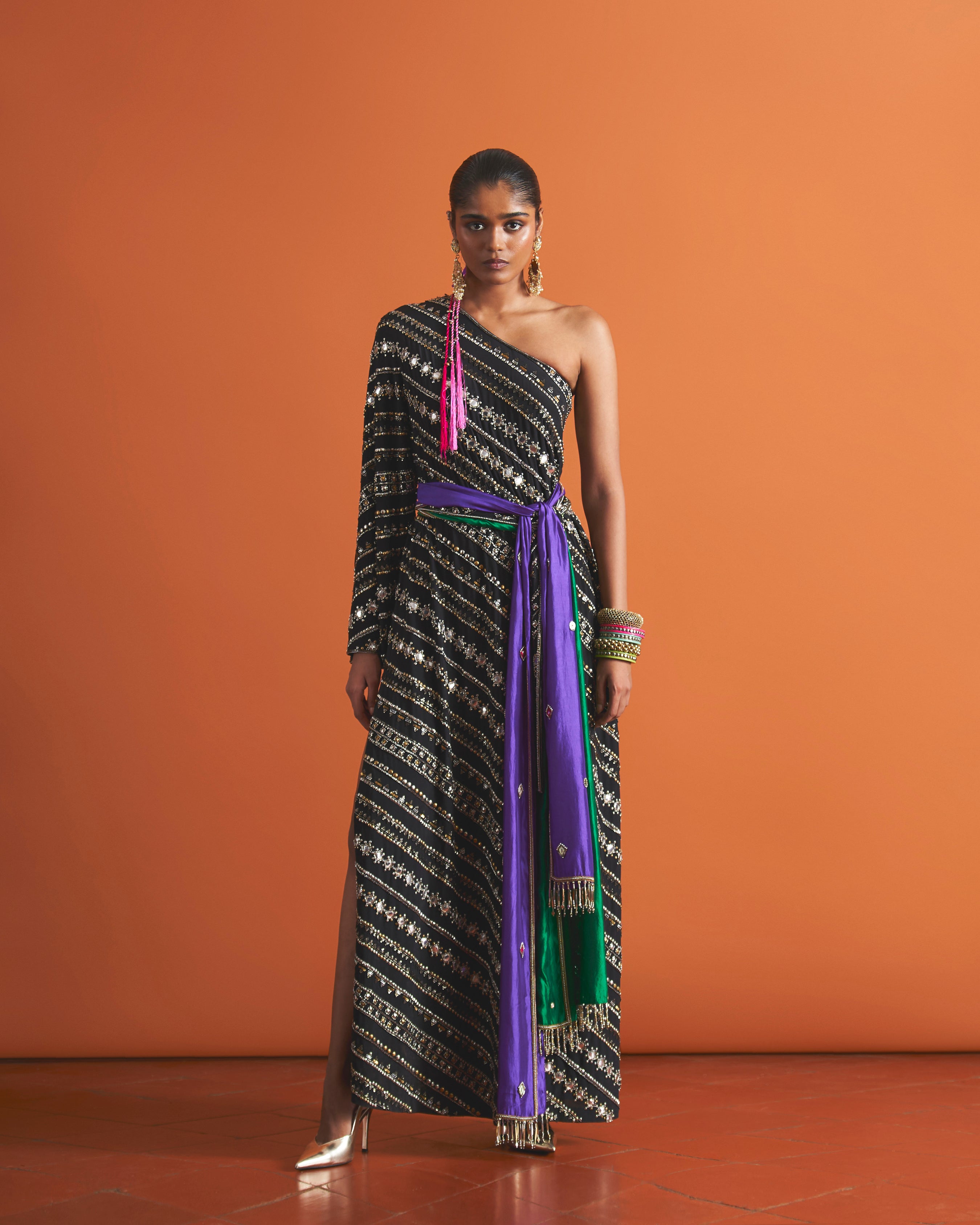 This chic two-piece ensemble features a black studded one-shoulder top crafted in luxurious silk crepe, elegantly paired with a coordinating stole in delicate silk organza.