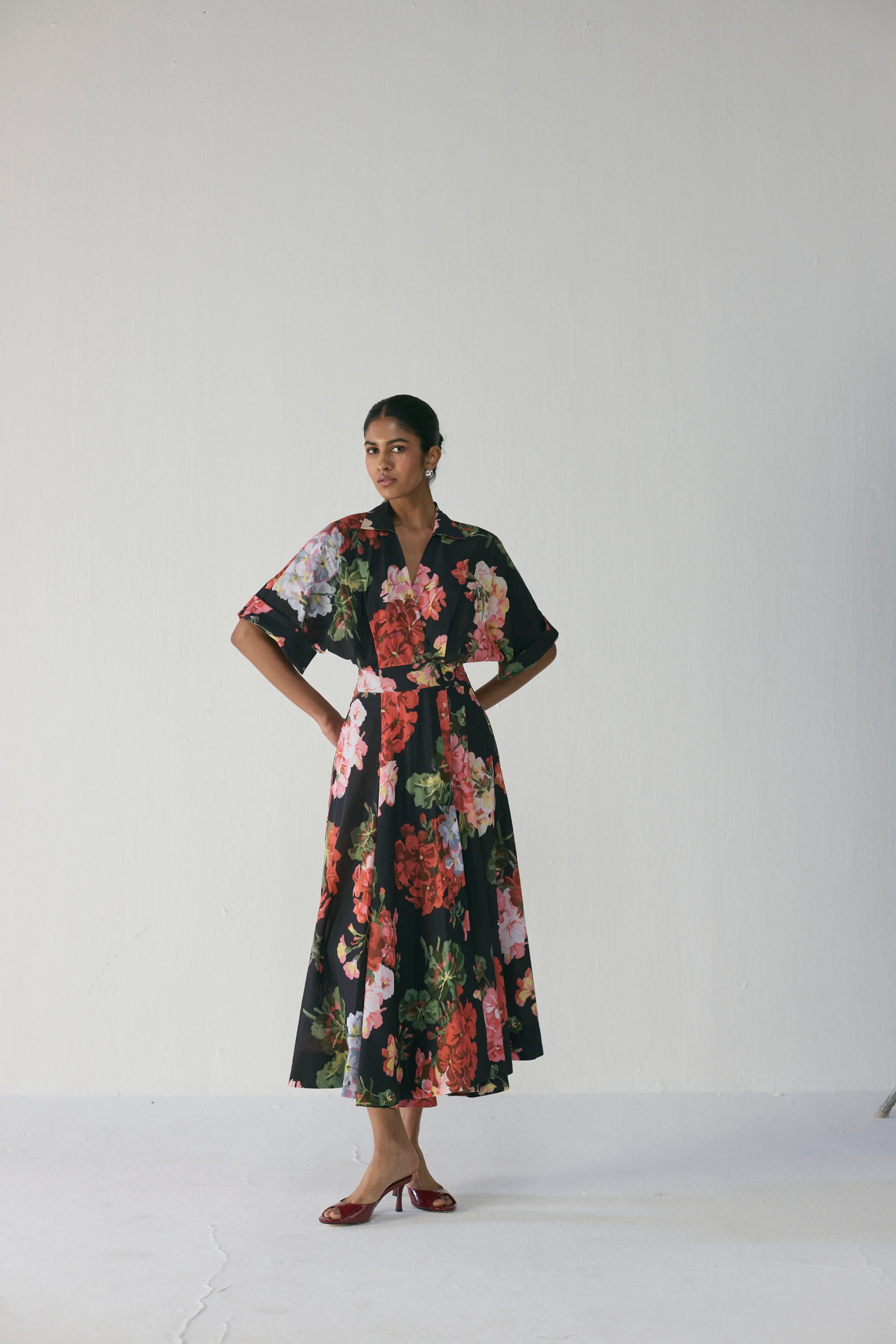 This floral shirt dress, crafted in crisp poplin that balances structure with fluidity, features a vivid red, blush, and green print on a deep black base, a collared V-cut neckline, half sleeves with rolled cuffs, a front button placket, a cinched waist with a belt, and a fit-and-flare midi silhouette with a feminine flared hem, making it perfect for day events or evening soirées when paired with heeled sandals, mules, or strappy heels and minimal accessories, as seen on the model who is 5'9" and wearing a size small.