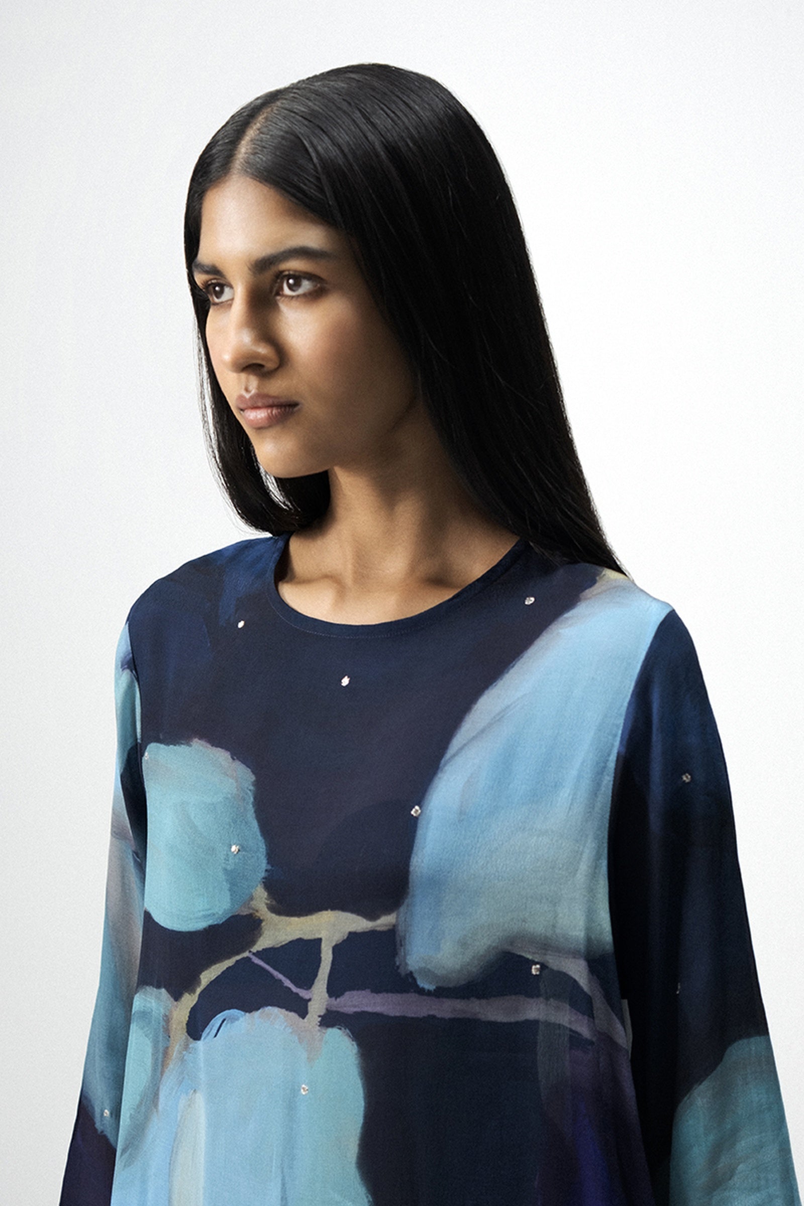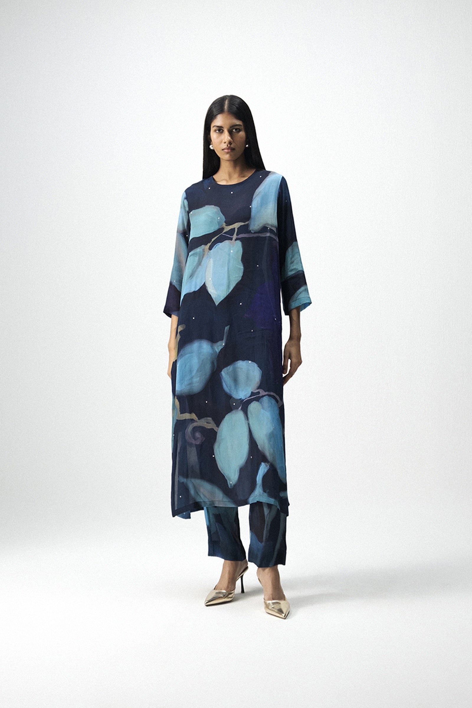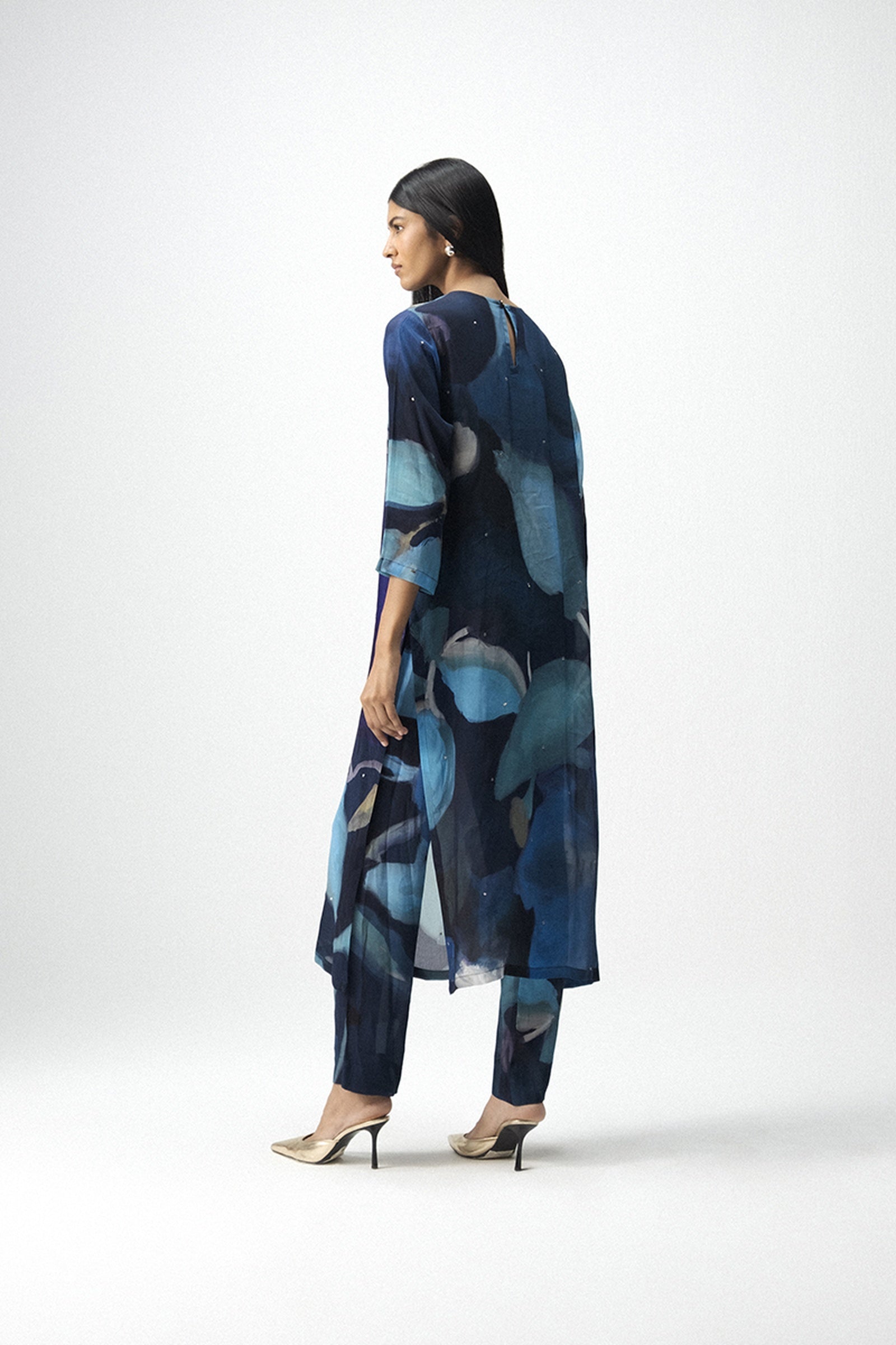 This elegant kurta set captures a perfect balance between contemporary artistry and timeless craftsmanship, crafted in a soft, fluid crepe fabric featuring a striking hand-painted-inspired abstract print in rich indigo and turquoise shades that evoke a serene artistic appeal, while the straight-cut kurta is adorned with delicate mukaish embroidery on the front, back, and sleeves and paired with matching straight pants in coordinated hues to create a cohesive, modern look, further enhanced by its relaxed silhouette, side slits, 18" sleeves, round neckline, and practical side pockets, making it ideal for festive gatherings or elegant daywear, and beautifully styled with metallic heels or embroidered juttis, minimal jewelry, statement earrings, and a sleek clutch for evening occasions—perfectly exemplified by the model, who is 5'9" and wearing a size small.