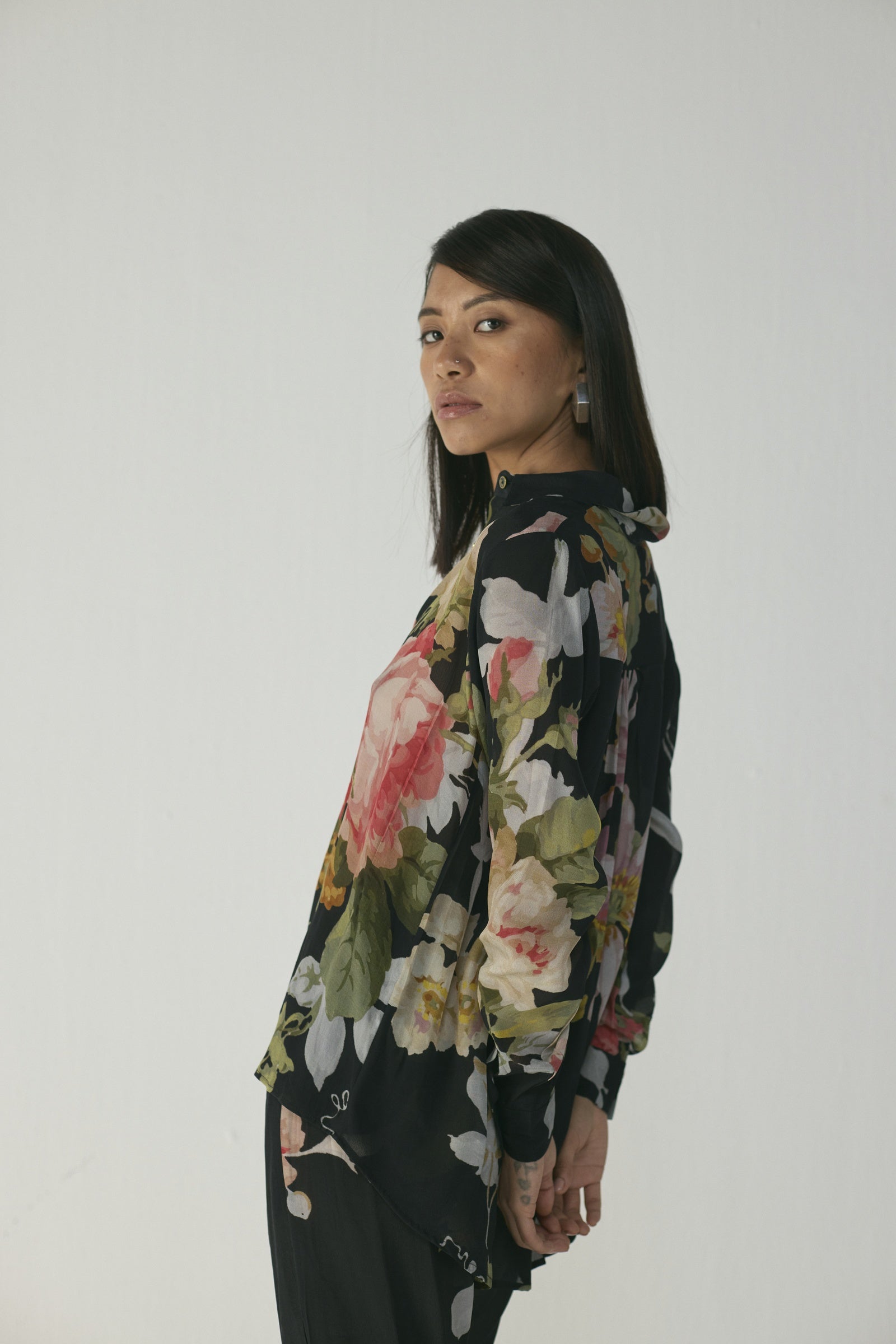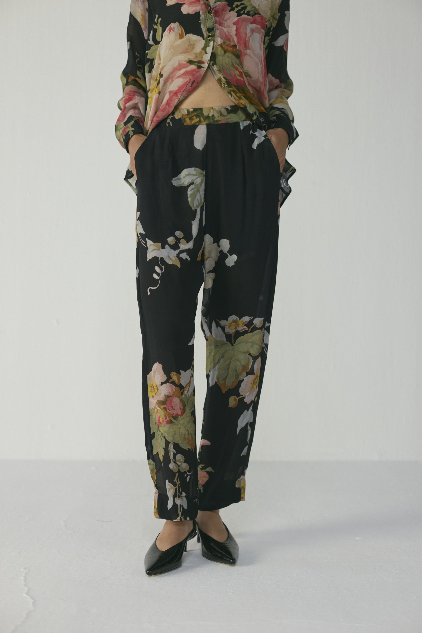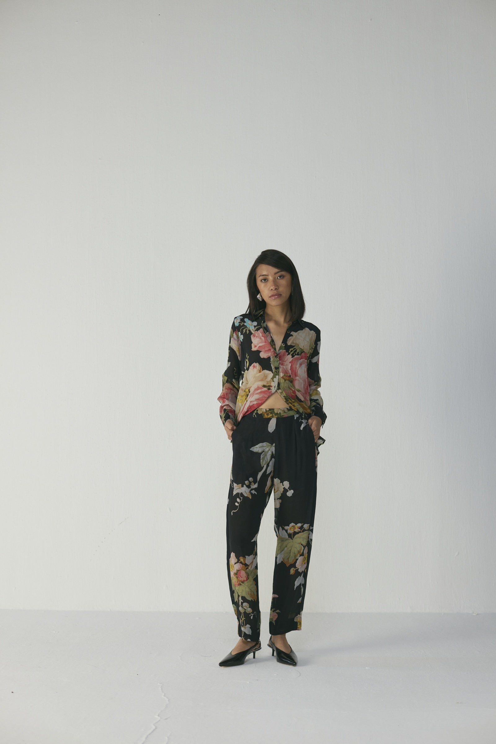 This elegant co-ord set features a sheer, relaxed-fit collared button-down shirt and matching straight-leg trousers, both adorned with a refined watercolor floral print in soft pinks, greens, and creams set against a deep black base, crafted in a soft, breathable fabric that drapes fluidly for day-to-night versatility, allowing the pieces to be worn together for a bold, cohesive statement or styled separately for understated everyday elegance; the model is 5'9" and wearing a size small.