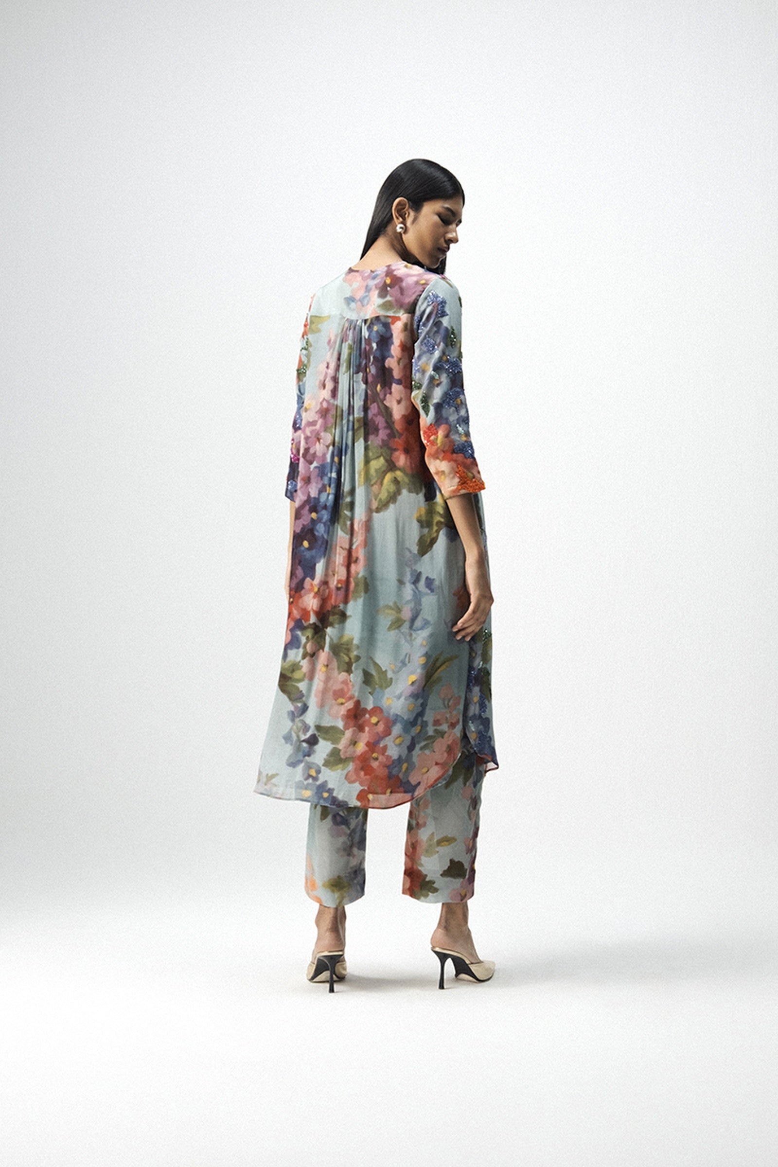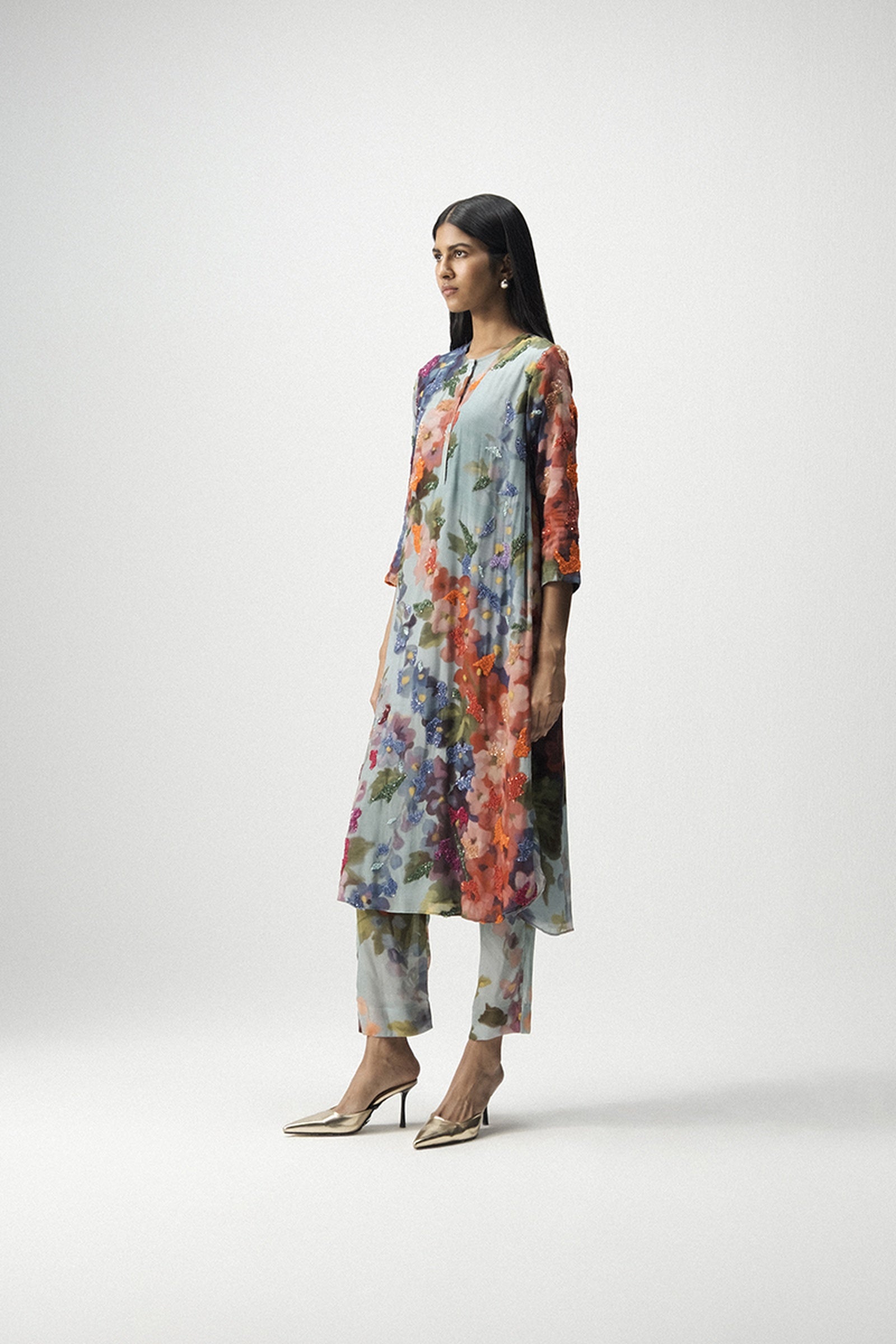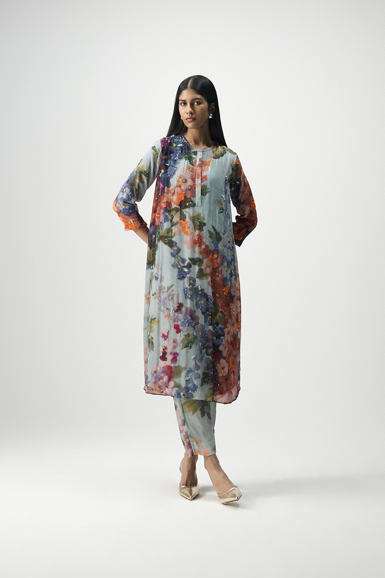 The kurta set captures the essence of effortless elegance with its painterly floral design and fluid silhouette, crafted from lightweight crepe fabric featuring a knee-length kurta adorned with vibrant, hand-painted-inspired florals in shades of coral, lilac, sapphire, and green, paired with coordinated straight-cut pants that mirror the delicate print for a cohesive, contemporary look, with a relaxed yet refined silhouette, 3/4-length sleeves, side slits, soft cotton lining for comfort, and straight-fit trousers with an elasticated back waistband and hidden placket with fine detailing, making it perfect for daytime celebrations or festive gatherings, and can be styled with delicate gold or pearl jewelry and metallic heels to elevate its artistic charm, with juttis and a soft pastel dupatta for a daytime soiree, or bold earrings and a sleek clutch for evening wear, as demonstrated by the model who is 5'9" and wearing a size small.