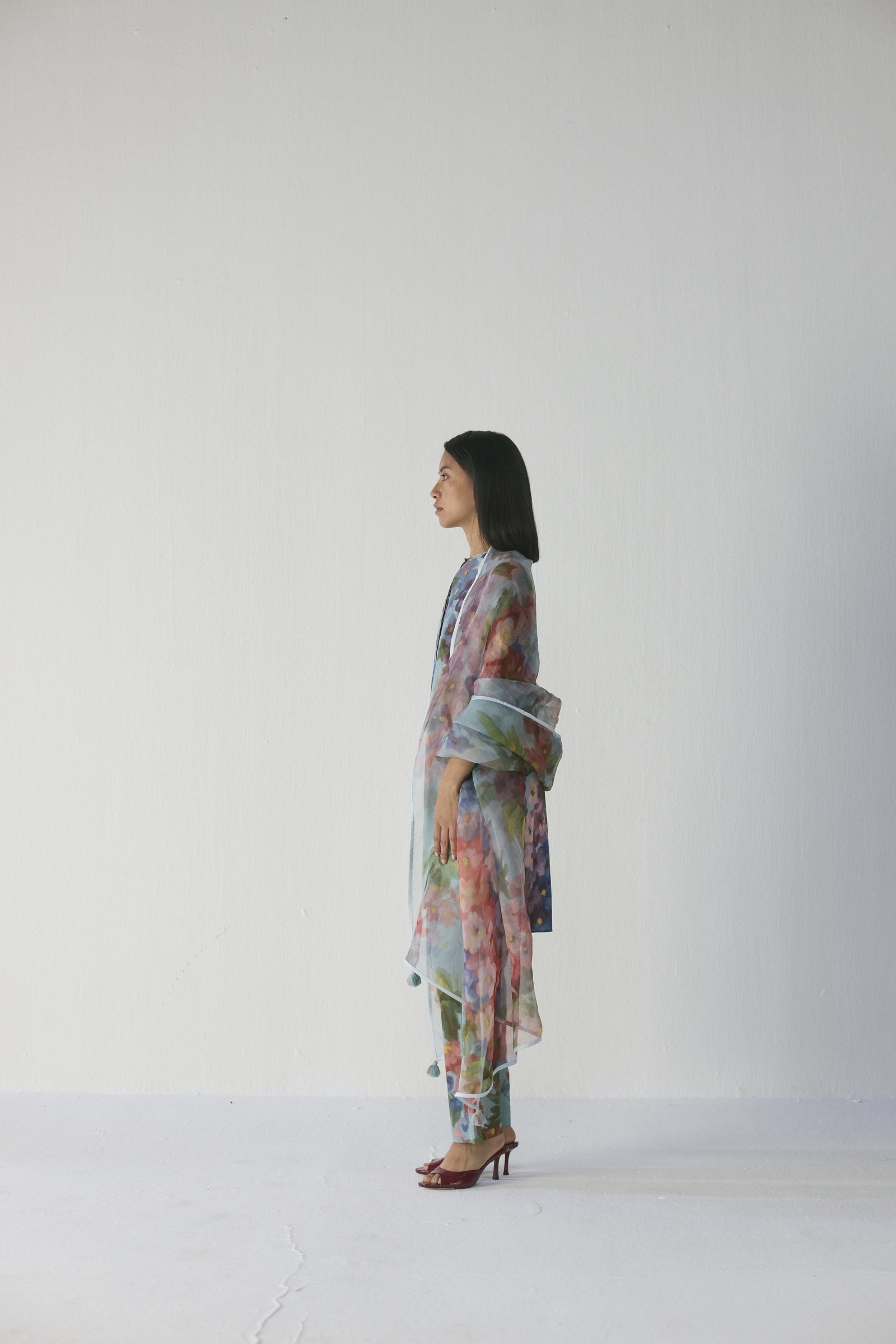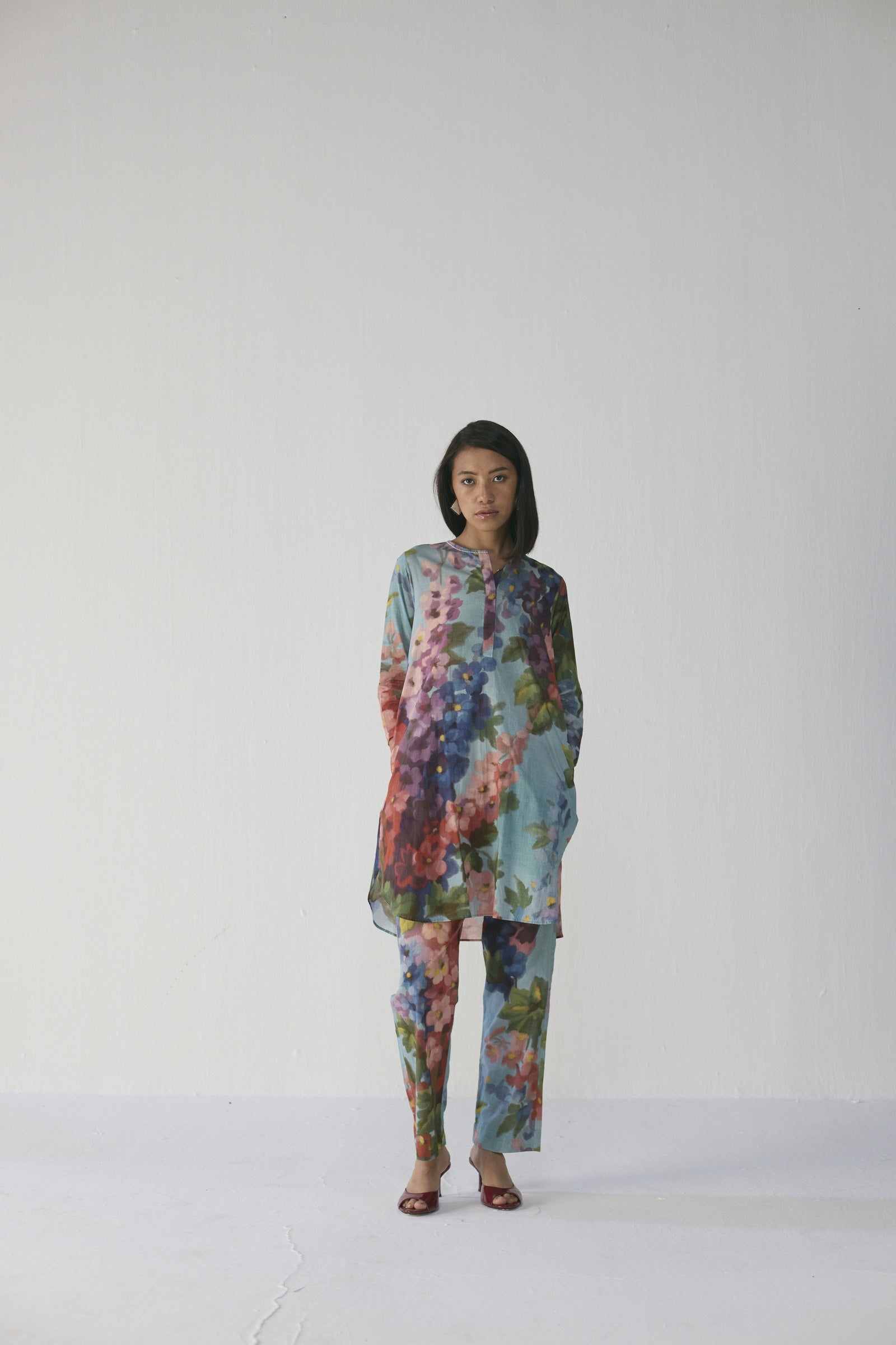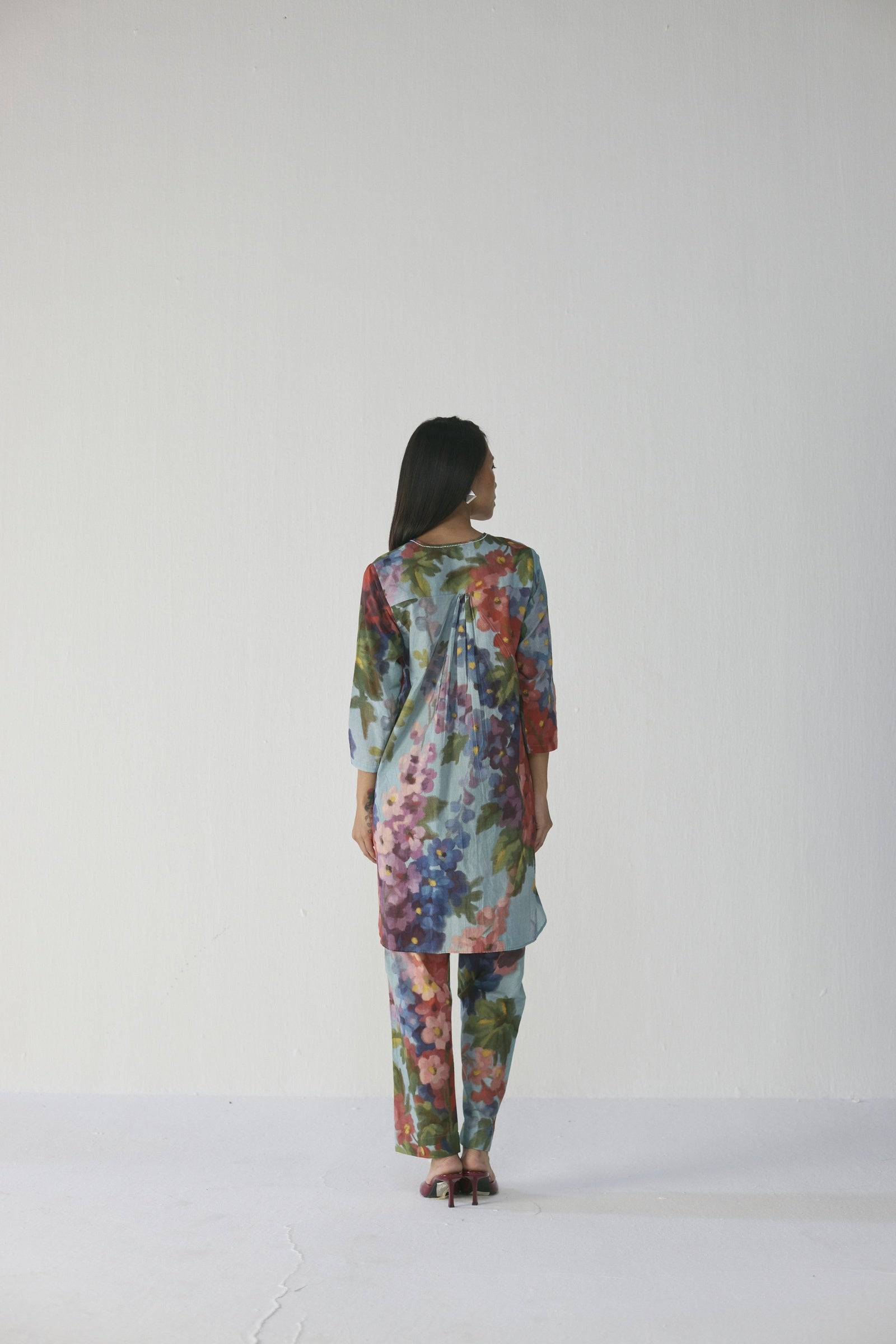 This kurta set is crafted from cotton fabric and features a straight-cut knee-length kurta with three-quarter sleeves and a round neckline with a concealed placket, paired with coordinated straight-fit trousers with an elasticated back waistband, both adorned with an impressionist-style floral print in shades of jade, rose, violet, and moss for a seamless, graceful look, with a relaxed silhouette perfect for brunches, intimate celebrations, or artful evenings, and can be styled with strappy heels or block sandals and minimal gold jewelry for a refined, feminine statement, or paired with the matching Botanic Dream Dupatta for a festive, airy, coordinated ensemble, complemented by dewy makeup and sleek hair, as demonstrated by the model who is 5'9" and wearing a size small.