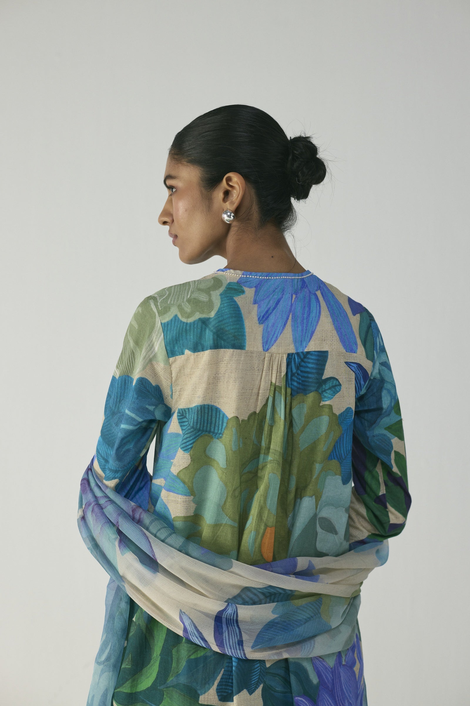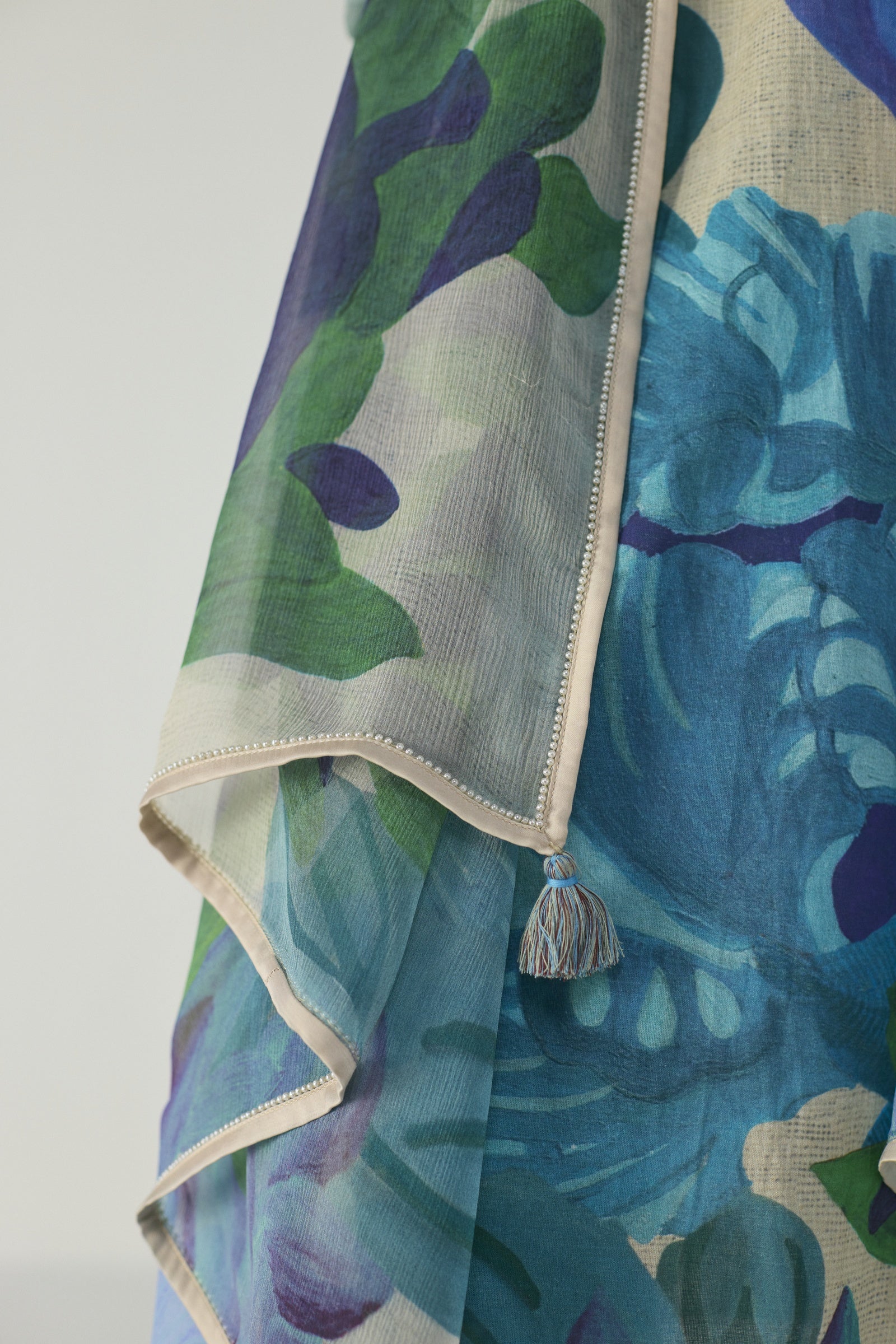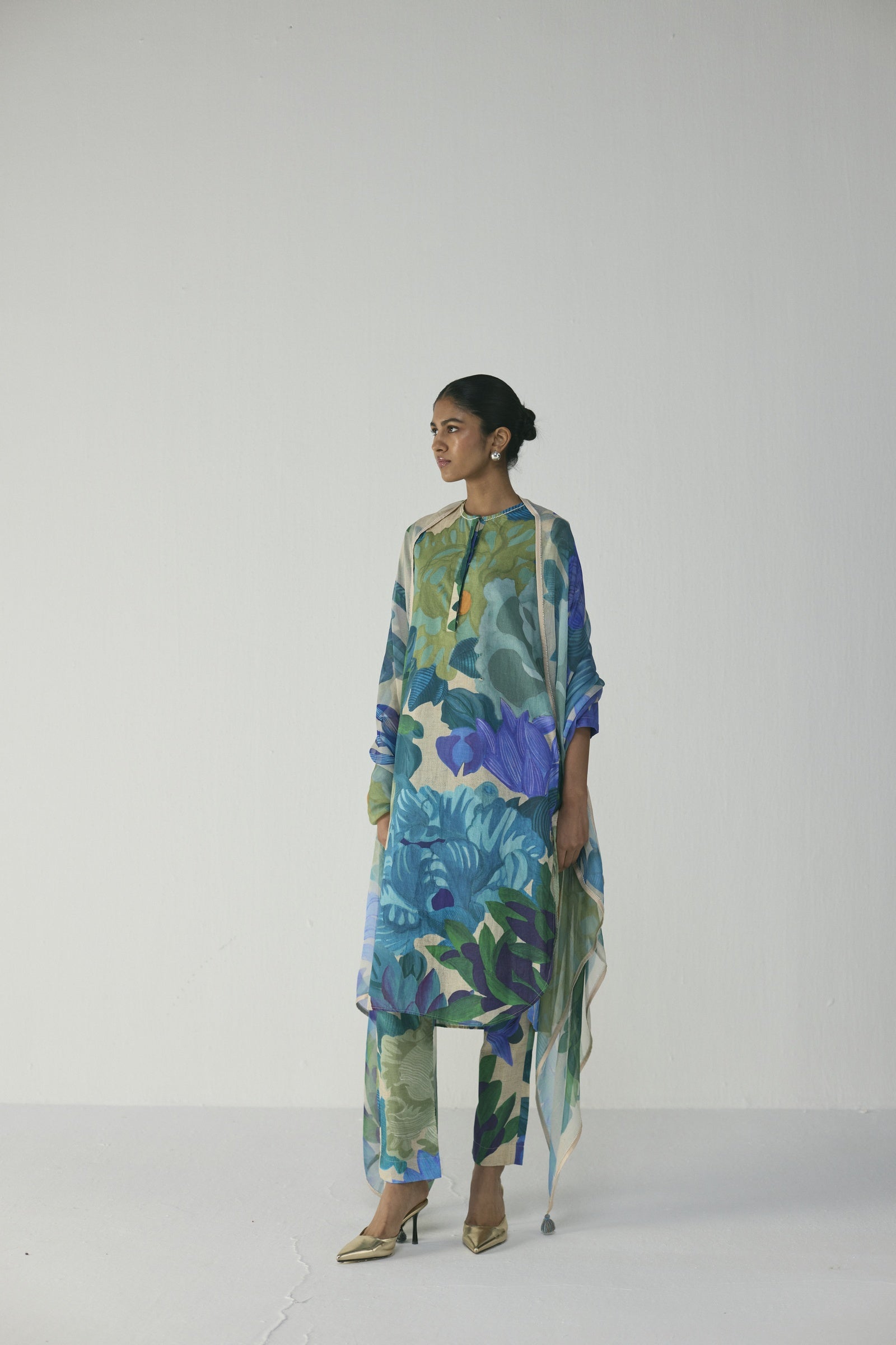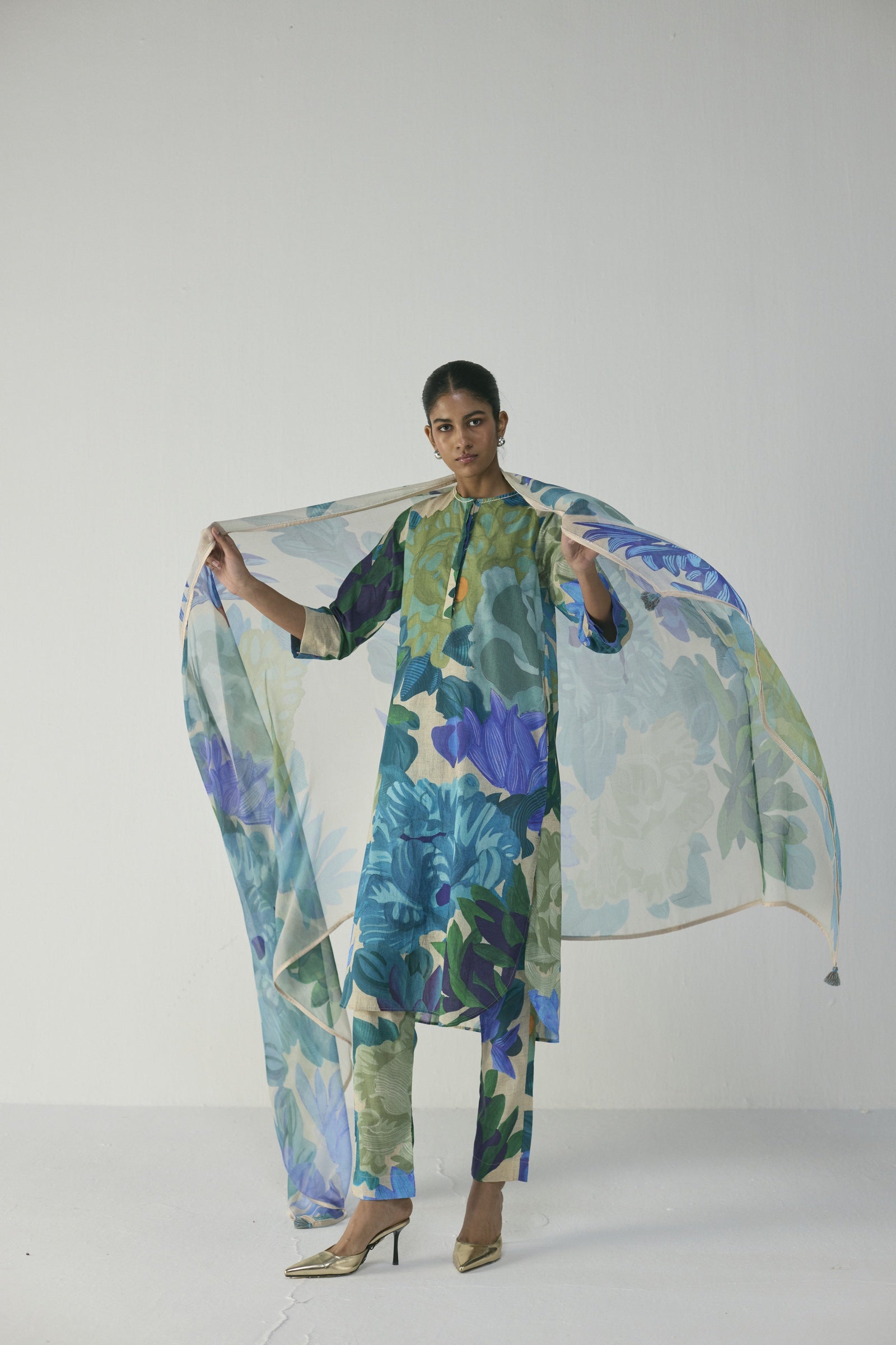 This three-piece coordinated set features a long straight-cut kurta, comfortable straight-leg trousers, and a sheer dupatta, all adorned with a lush hand-painted botanical print in soft shades of teal, blue, aqua, lilac, and sage that create a layered watercolor effect; crafted from breathable, flowy fabric, the ensemble blends effortless comfort with ethereal, nature-inspired elegance, making it perfect for daytime celebrations, resort escapes, festive gatherings, or polished everyday wear, while the dupatta adds graceful movement and the pieces can be styled together or separately for versatile, contemporary looks.
