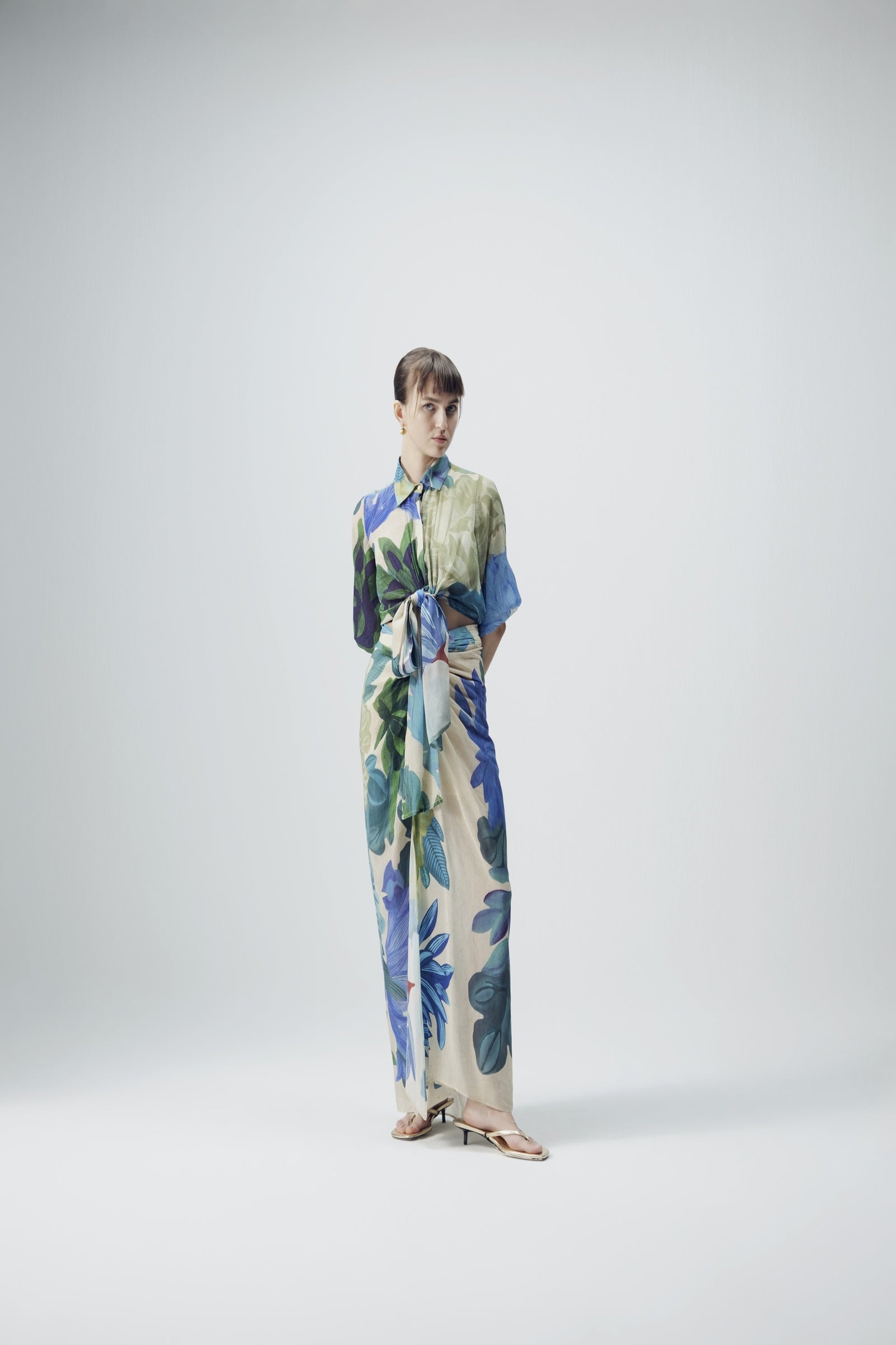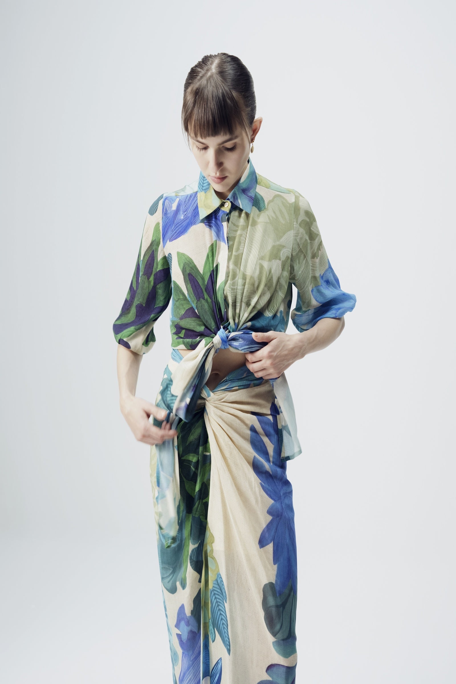 This tie-up top and skirt set features a lightweight printed shirt with a classic collar and relaxed sleeves, styled in a knotted fashion, paired with a fluid drape skirt, all adorned in a vibrant tropical botanical print of oversized leaves and abstract florals in teal, cobalt, emerald, sage, and deep violet on a soft beige base, crafted in breathable crepe for soft, airy comfort—perfect for vacations, beachside evenings, brunches, or elevated summer dressing; the model is 5'9" and wearing a size small.