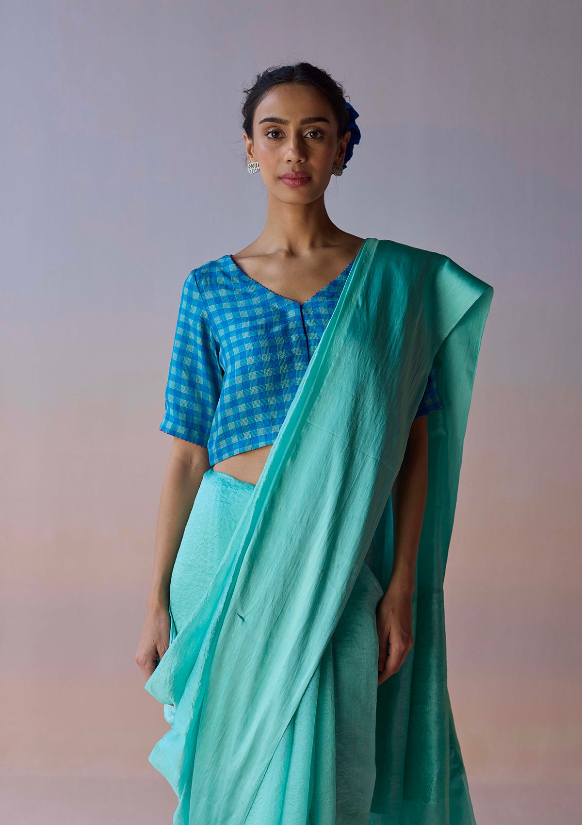 The Infinite Grace Sari, handwoven in ethereal organza mulberry silk that feels light as breath and fluid as water, is crafted by skilled West Bengal artisans whose generational expertise is reflected in every thread, and features satin weave borders—wider at the bottom for added weight and grace and narrower at the top for effortless ease—offering a drape that is tender, refined, and quietly elegant; pair it with the LightWoven Blue Blouse to complete the look, and note that the model is 5'7" tall.