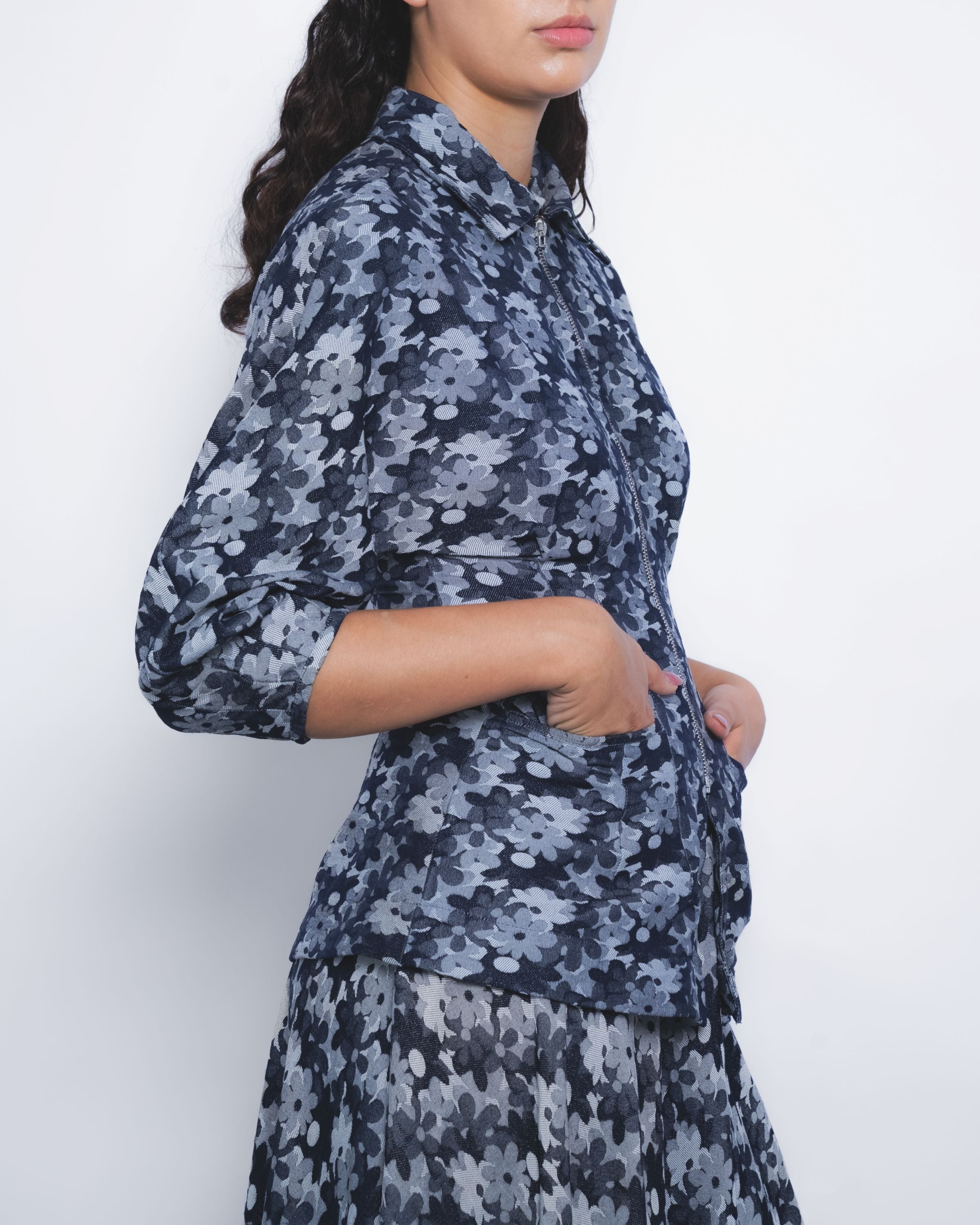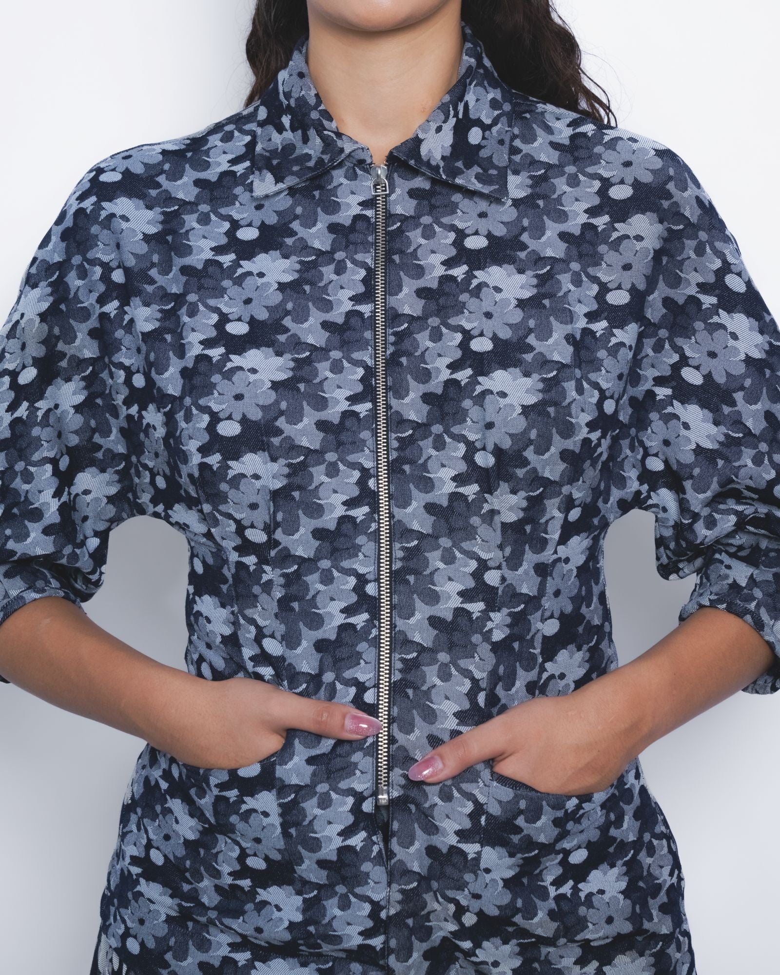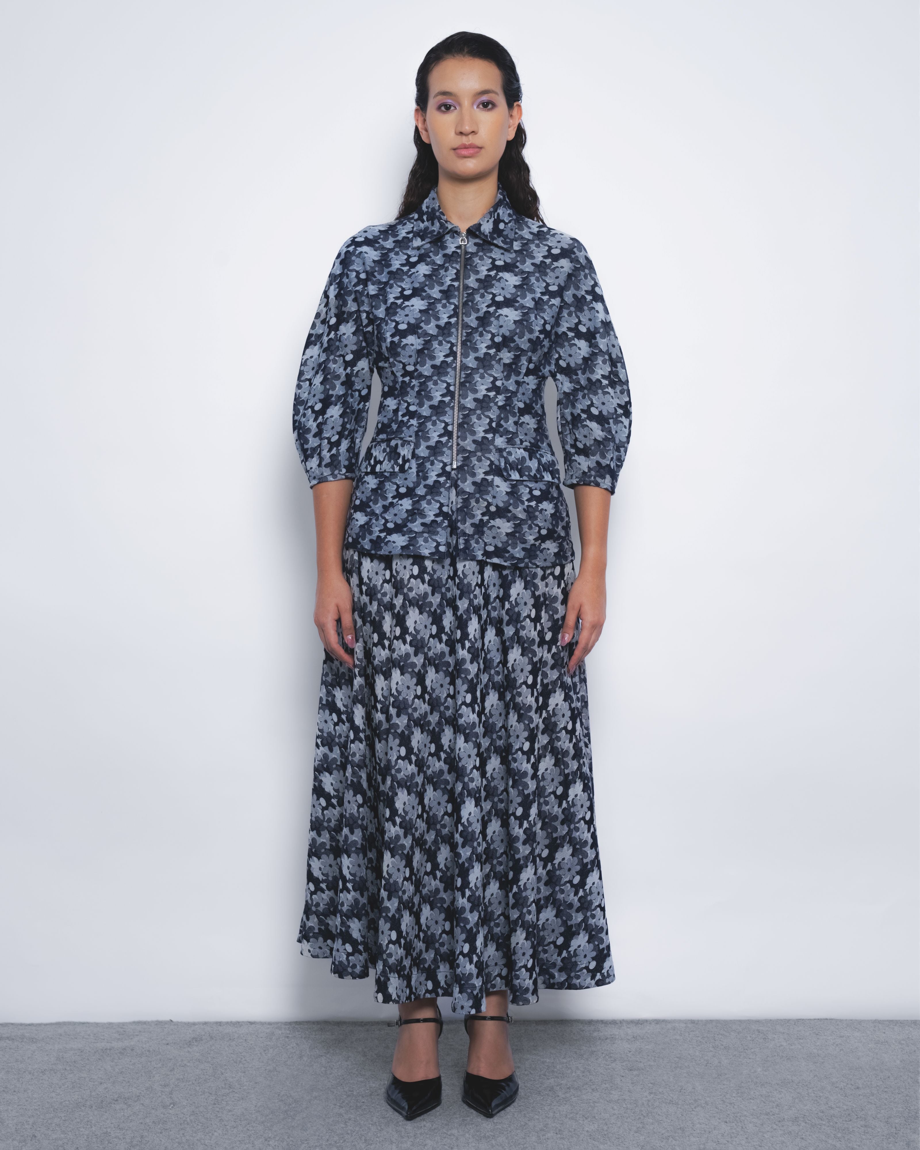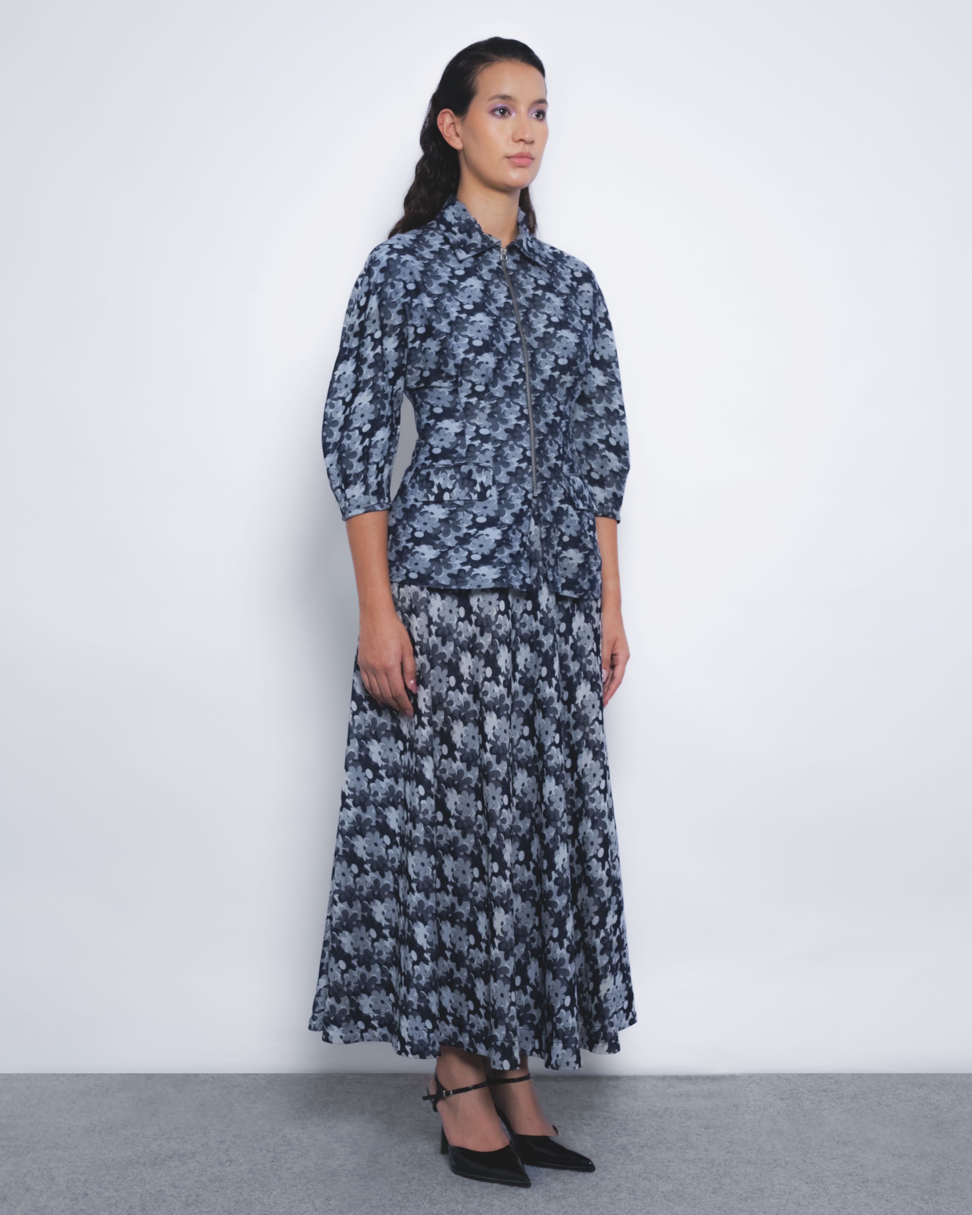 This tailored silhouette in floral denim jacquard features a strategic play of darts at the waistline and sleeves, creating a sculpted form defined by precise, clean lines.