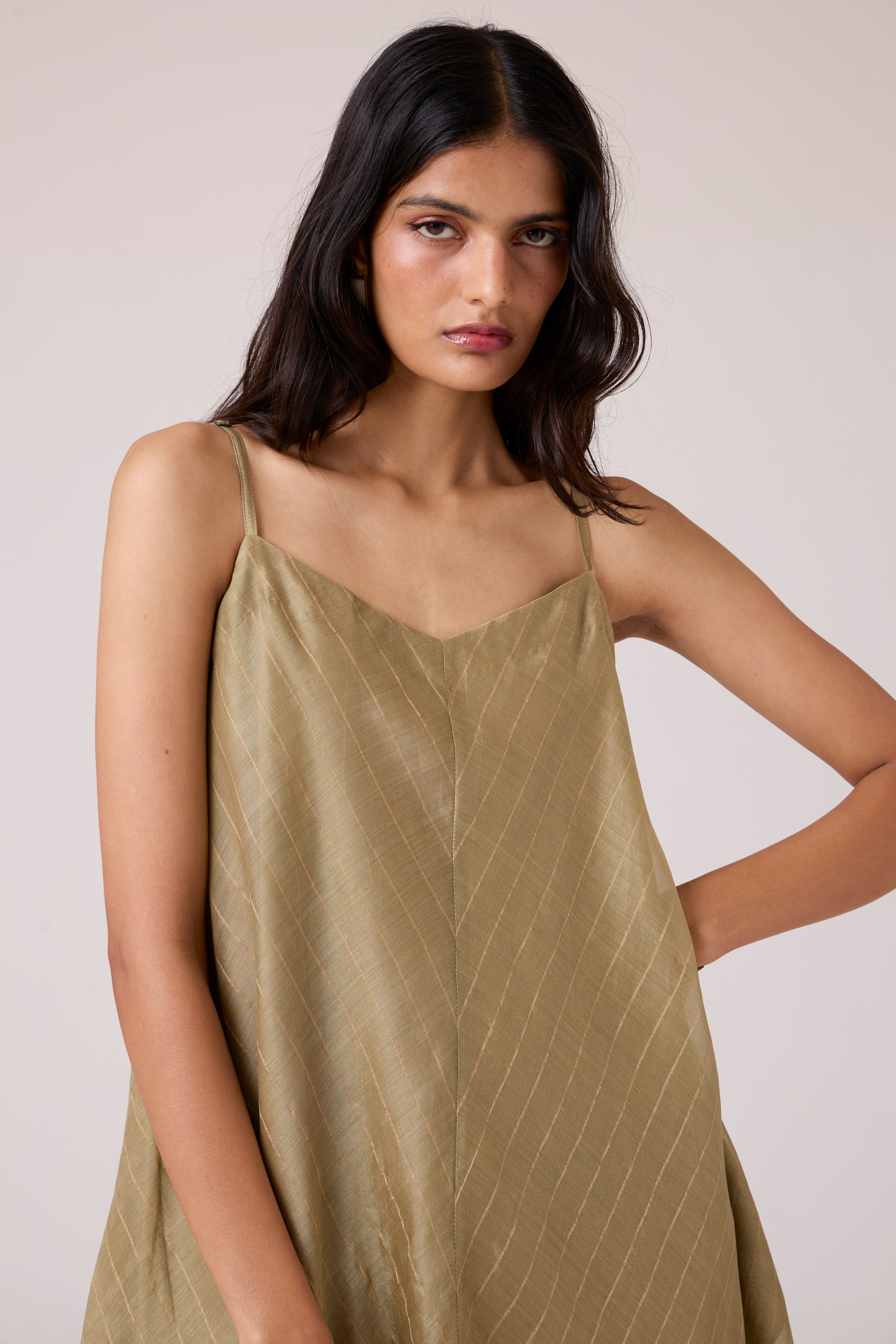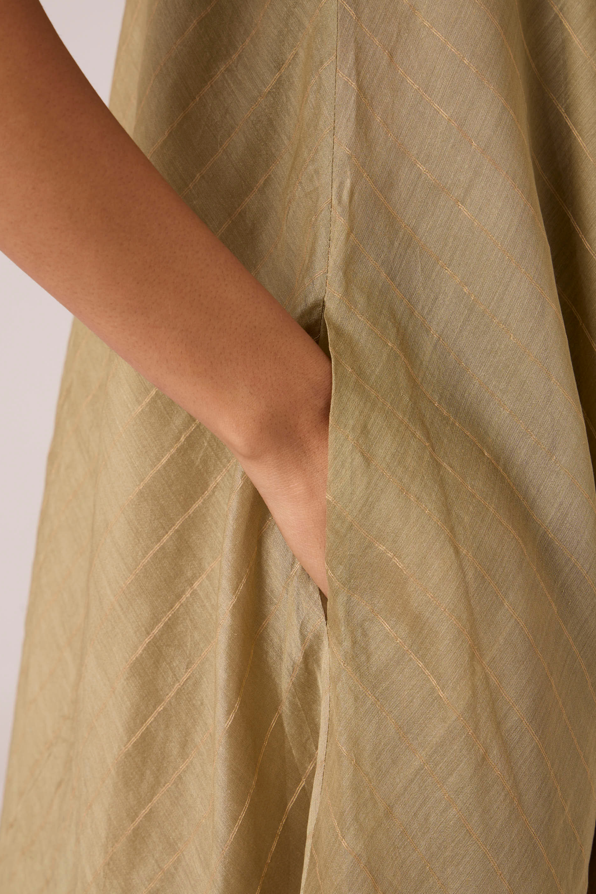 This dress moves with an easy sweep of fabric. Crafted from handwoven Chanderi with olive-gold striping, it features a handkerchief hem engineered for fluid irregularity. Adjustable shoulder straps allow for a customized fit, tempering the flow with precision. The fully lined interior ensures comfort, while inseam pockets add practical function. Effortless movement shaped by considered details.