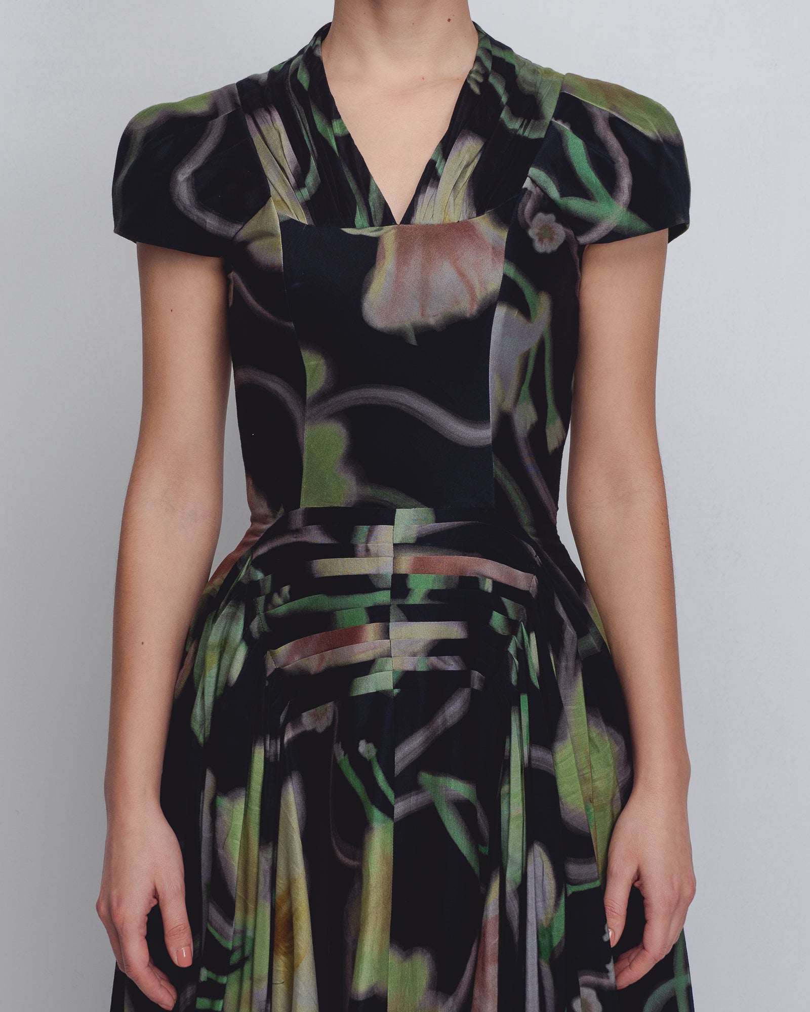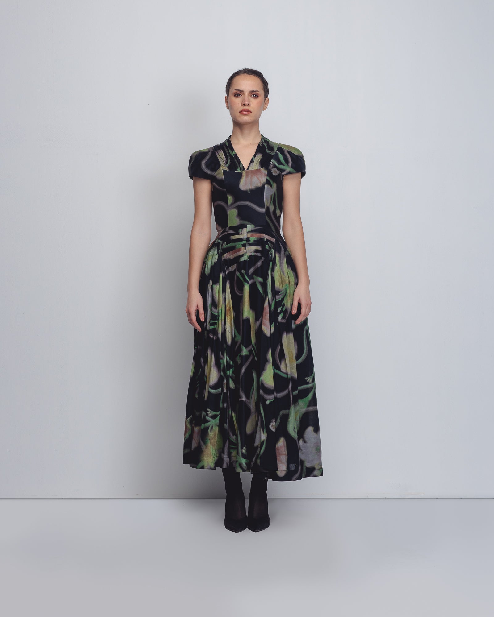 Crafted in Chanderi, featuring in-house designed floral prints,this dress xfeatures a fitted bodice with a gathered V-neckline and architectural cap sleeves that frame the shoulders. Pleated at the waist that flows into a deeply full skirt, creating a rhythmic, voluminous movement that balances the garment’s precise tailoring with an organic, botanical aesthetic. The model is 5'8 and the garment length is 55 inches.