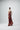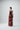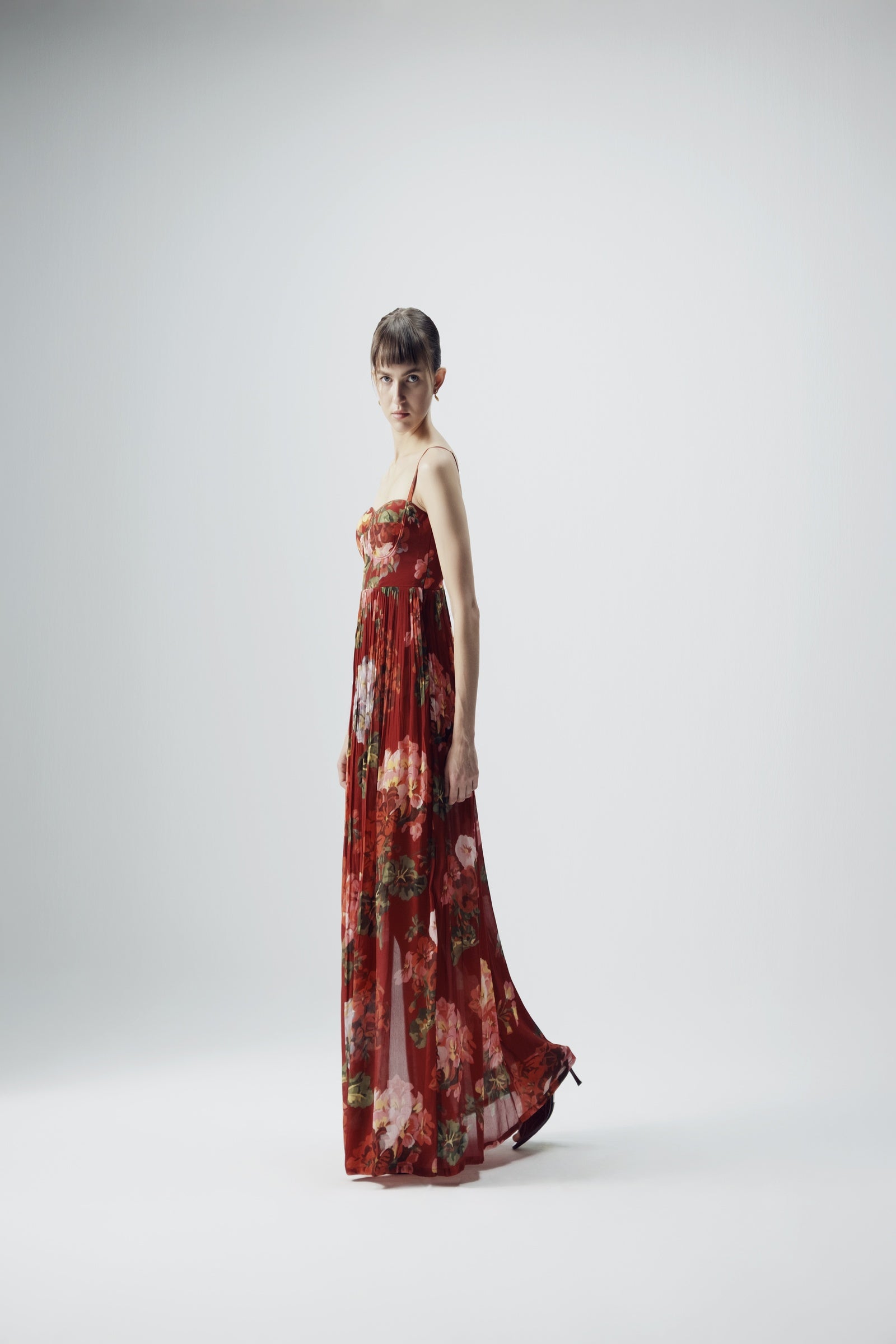 This elegant dress features a fitted bustier bodice with thin straps and defined cups, flowing seamlessly into a pleated, free-moving skirt with a subtle side slit, all adorned in a vibrant painterly floral print of pink, lilac, coral, and green on a rich red base, creating a romantic yet bold garden-inspired silhouette perfect for evening events or daytime resort wear; the dress measures 60 inches in length, and the model is 5'9" wearing a size small.