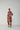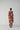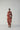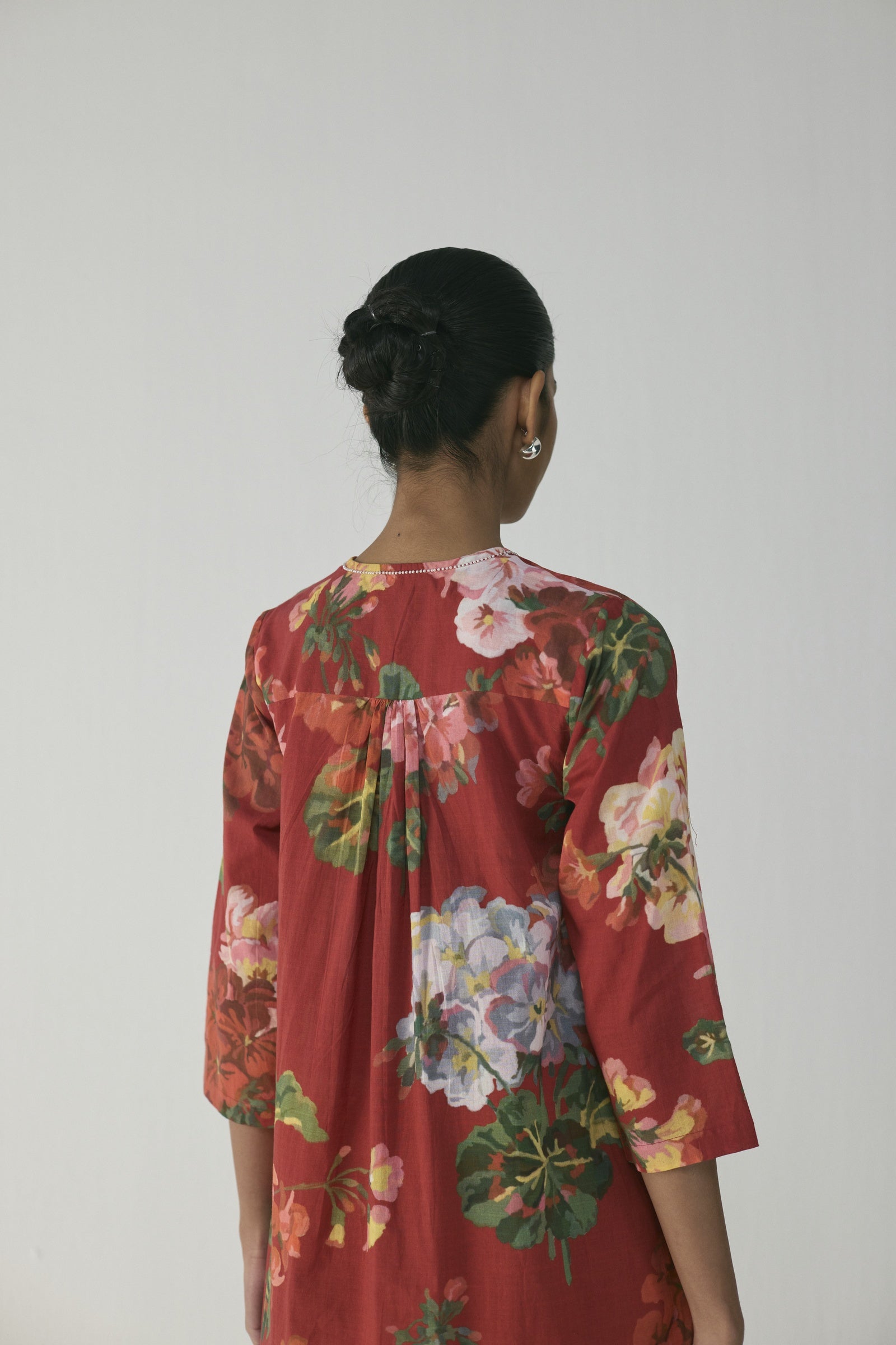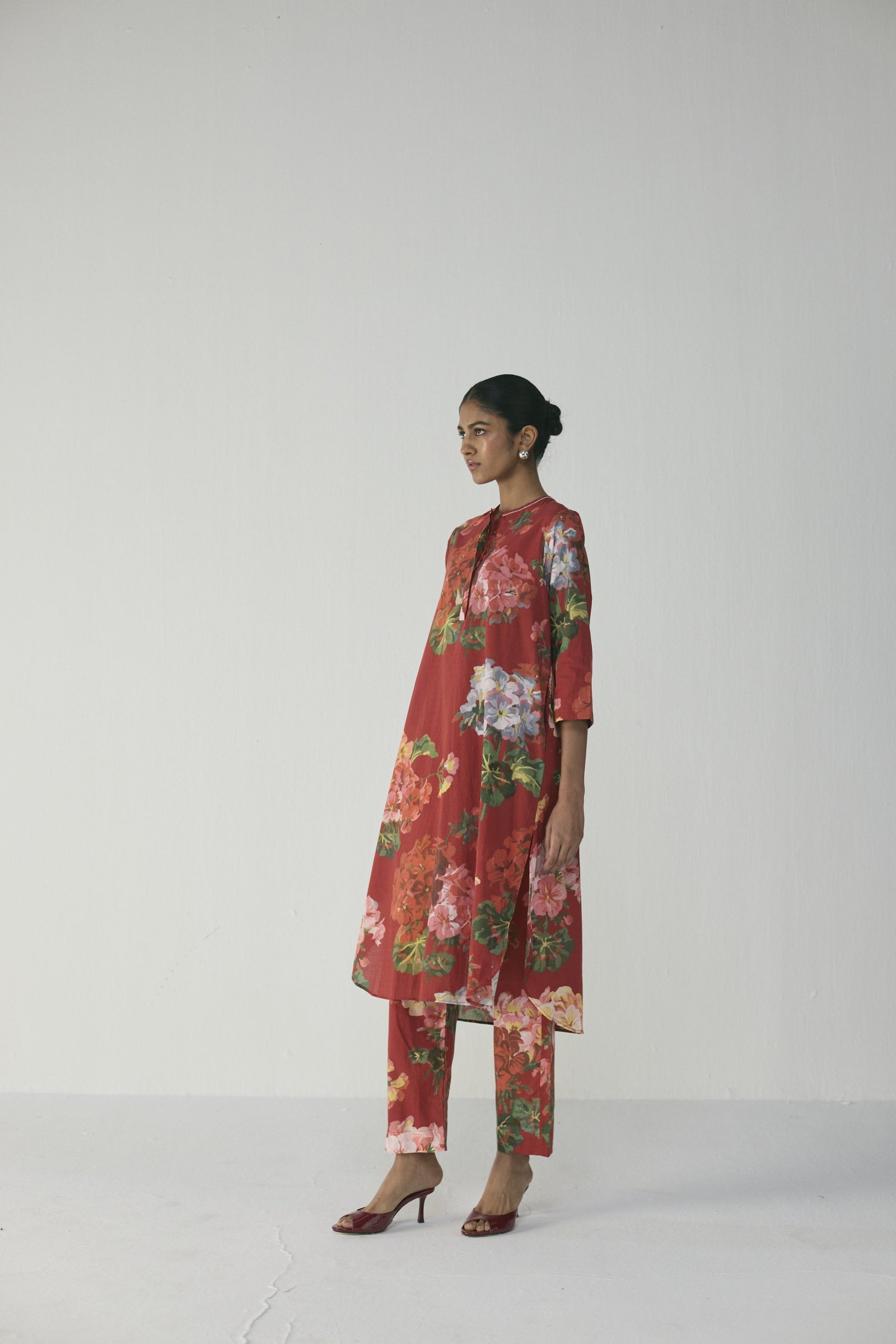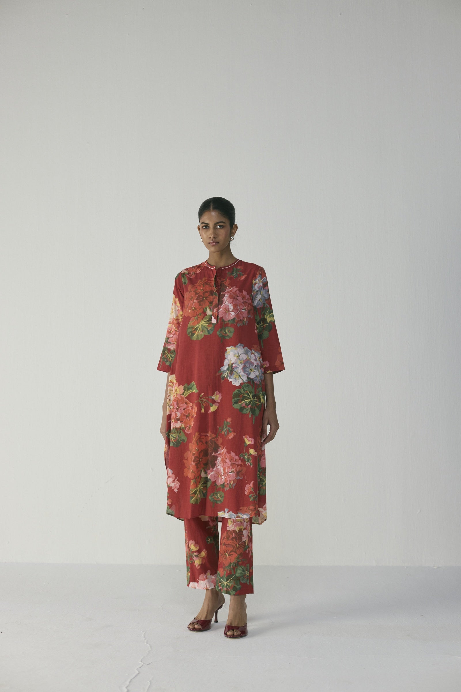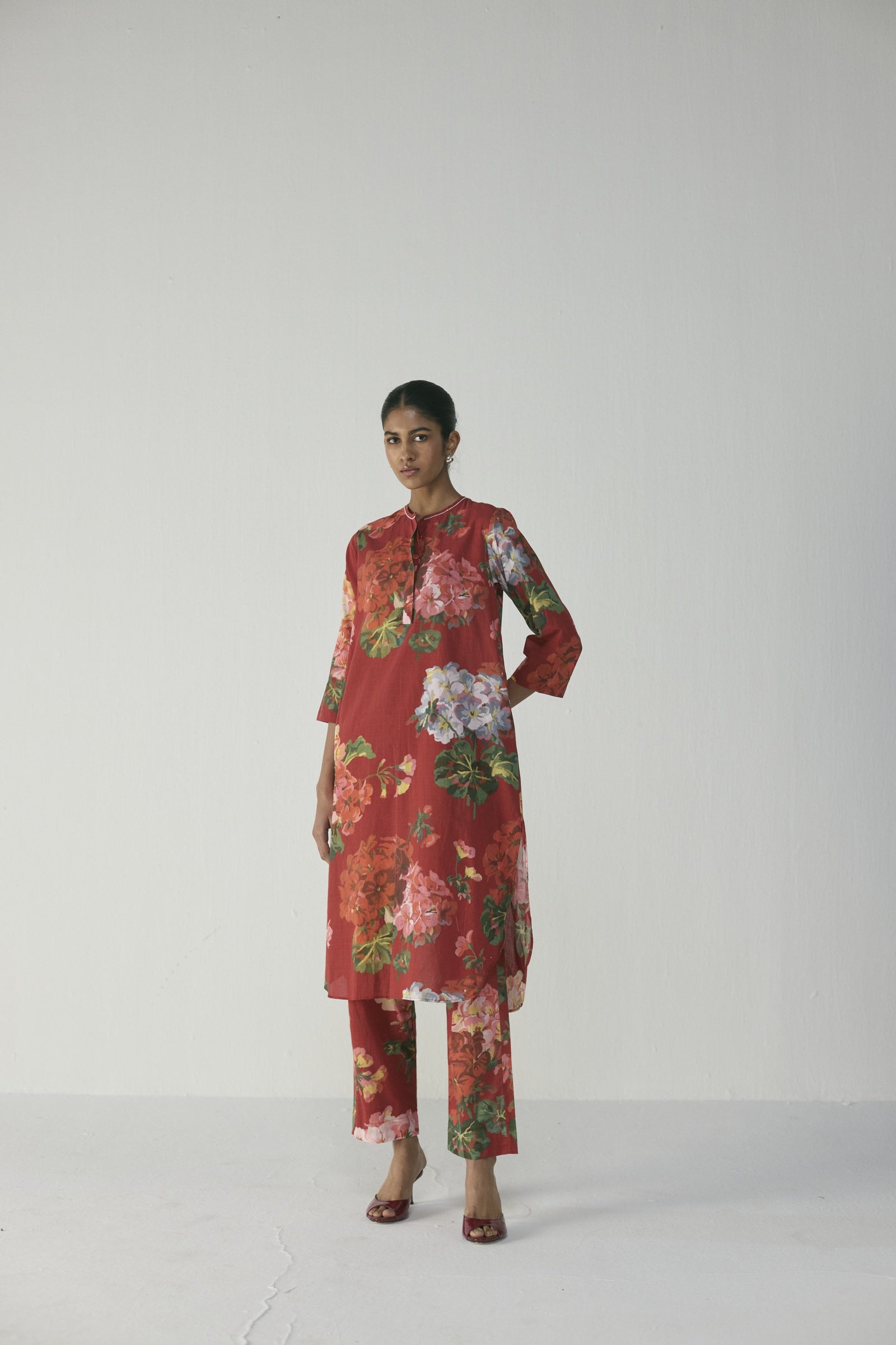 This elegant kurta set features a vibrant hand-painted floral print in crimson, blush pink, lilac, and verdant green on a rich red base, crafted in soft, breathable fabric with a straight-cut kurta, round neckline with subtle slit, three-quarter sleeves, side slits, and coordinated straight pants for a polished yet relaxed silhouette—perfect for daytime elegance, intimate gatherings, or leisurely outings; the model is 5'9" and wearing a size small.