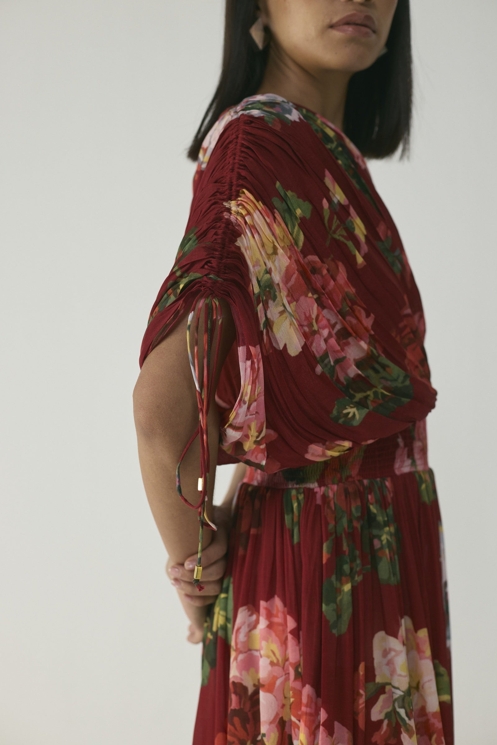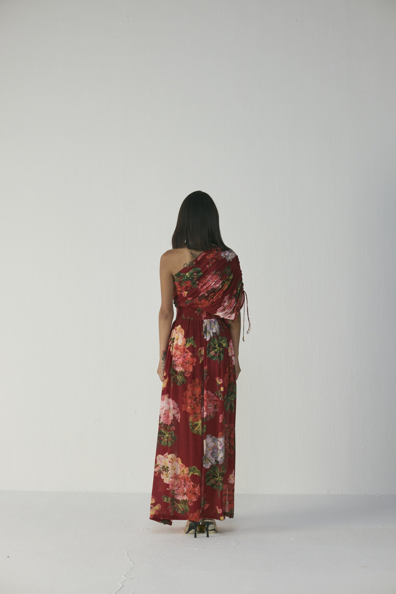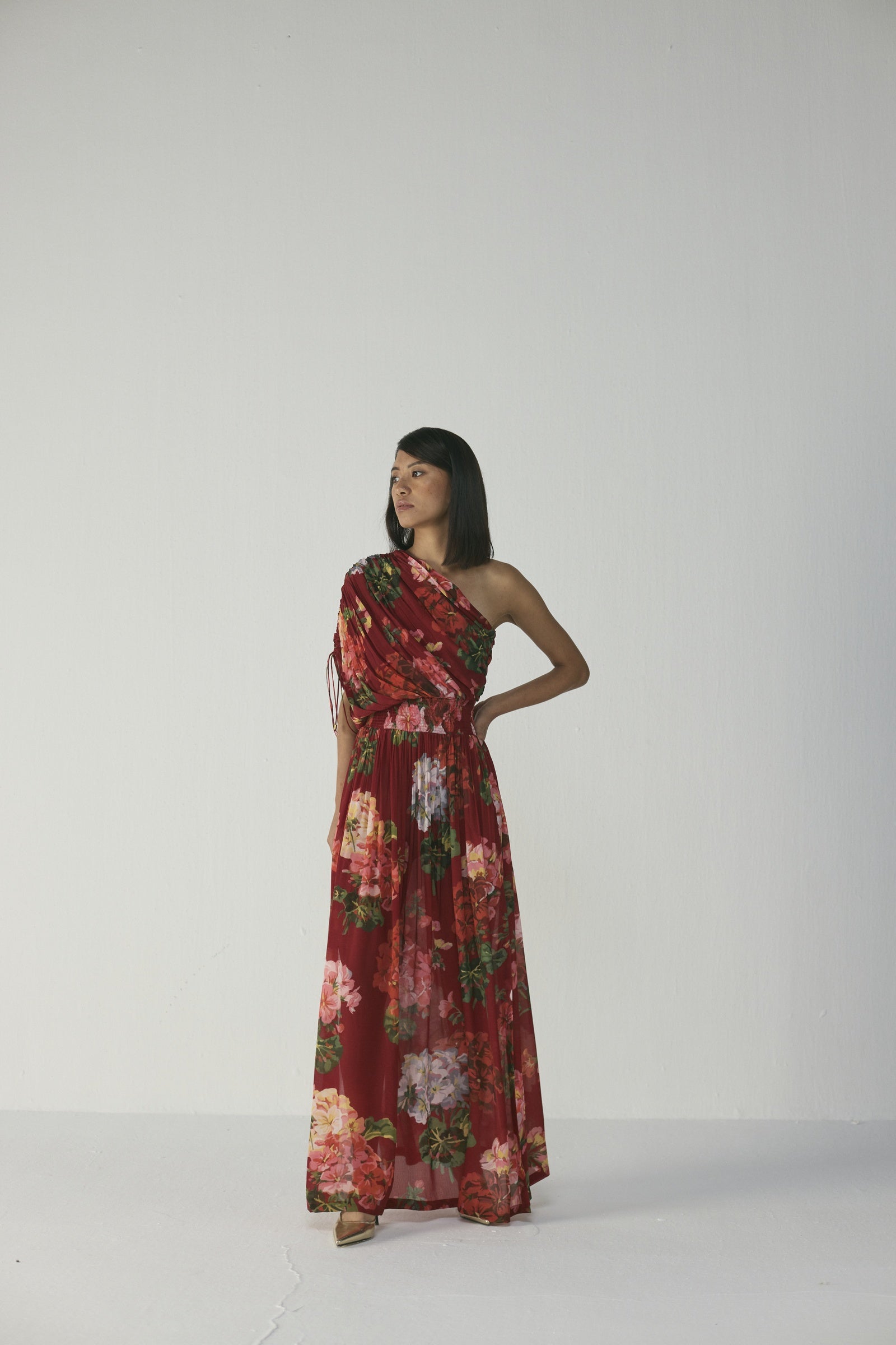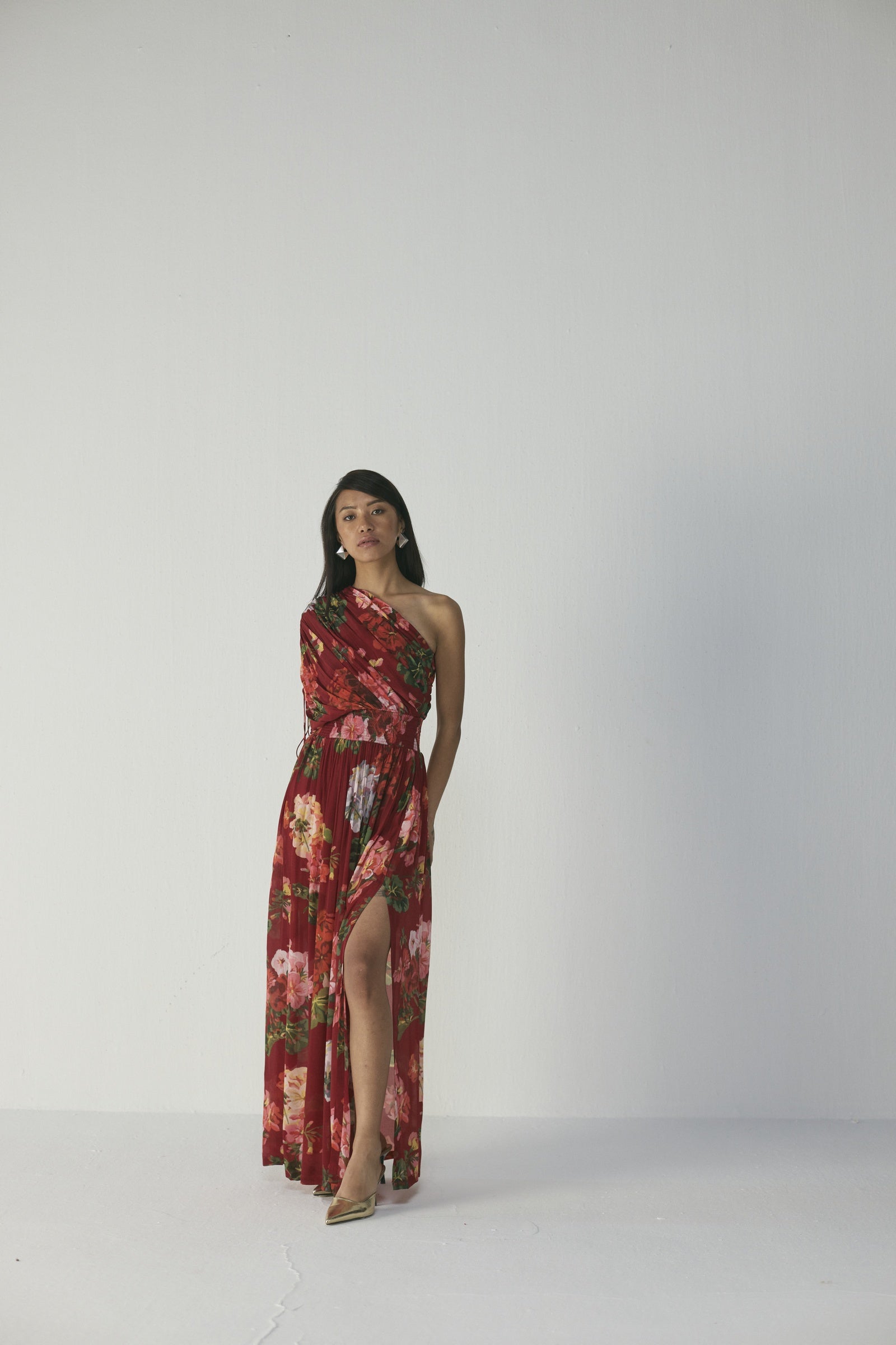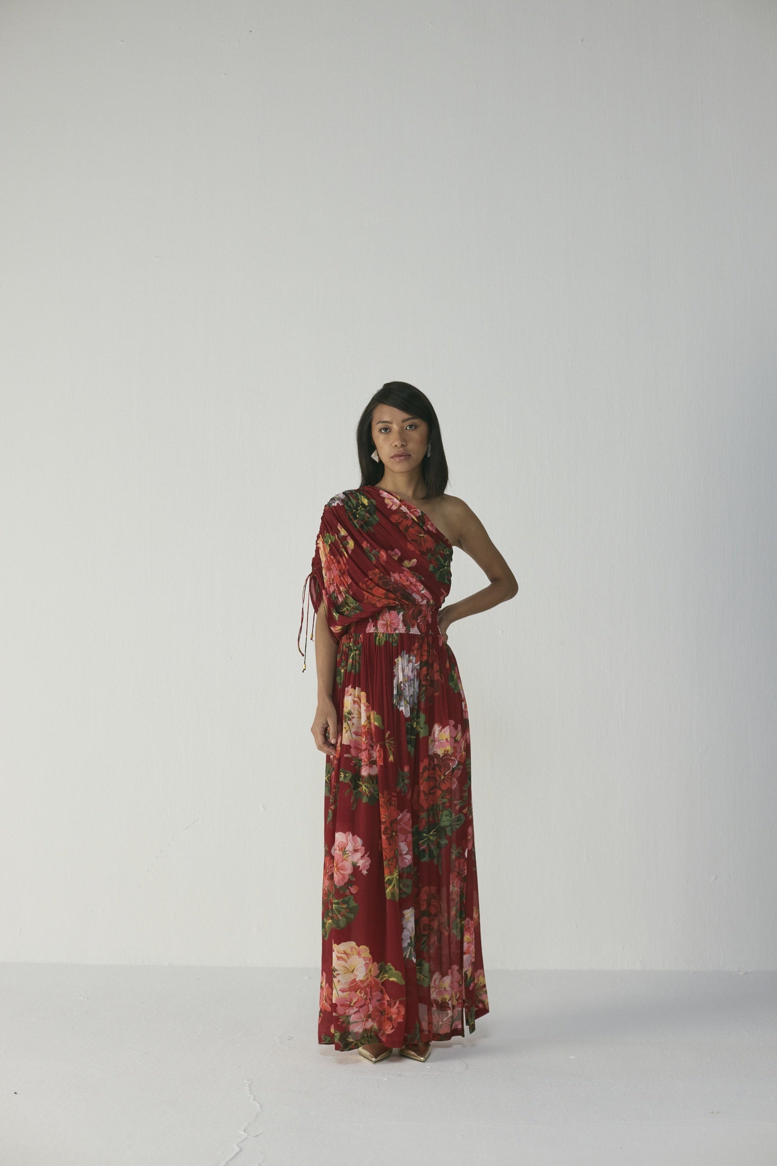 This elegant one-shoulder, floor-length dress features a lush painterly floral print in coral, blush pink, lilac, and soft green on a rich crimson-red base, crafted with a ruched, draped bodice that wraps across one shoulder, a gathered waist, and a flowing skirt that moves gracefully, creating a striking, sculptural silhouette ideal for formal occasions, evening events, vacations, or festive celebrations; the model is 5'9" and wearing a size small.