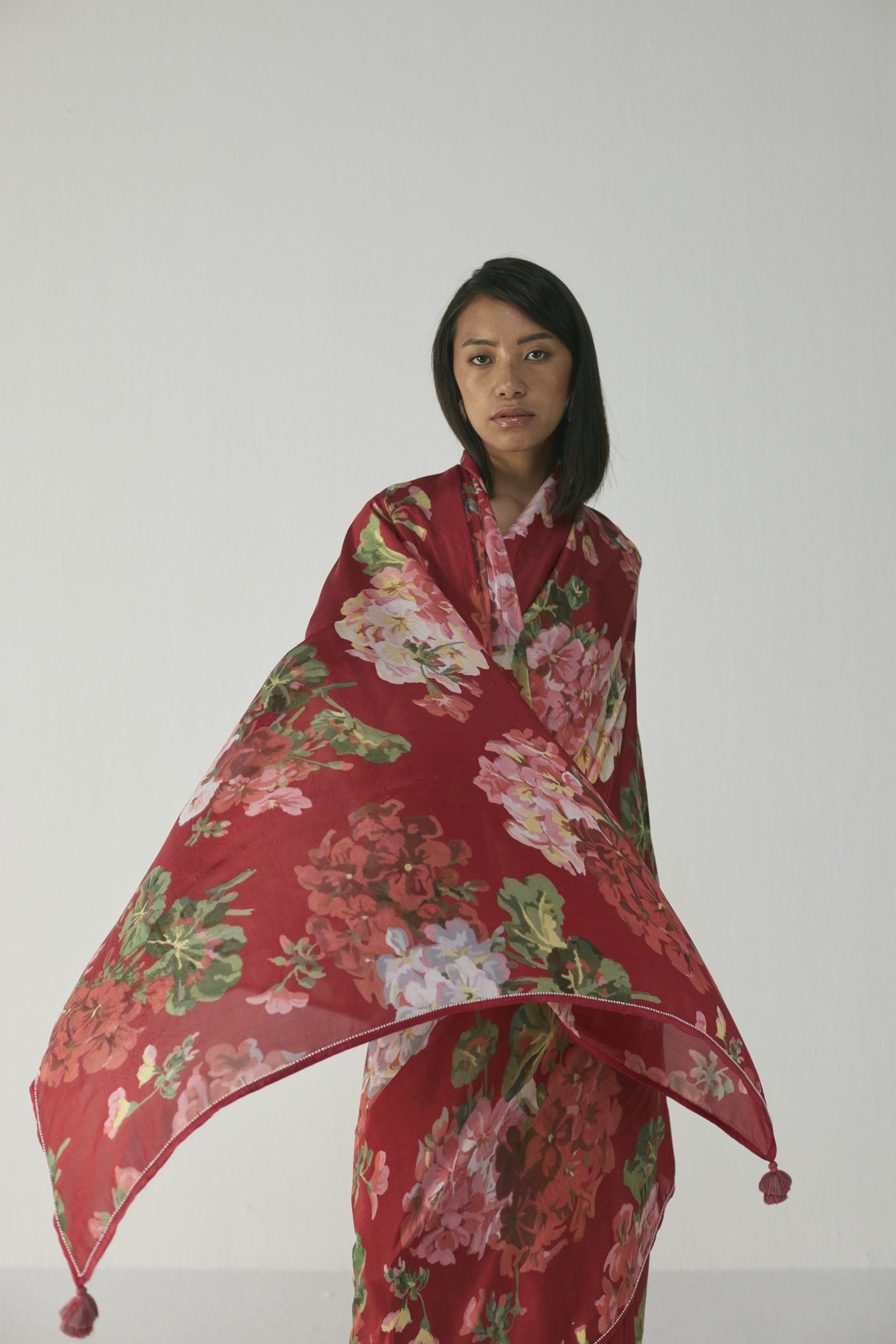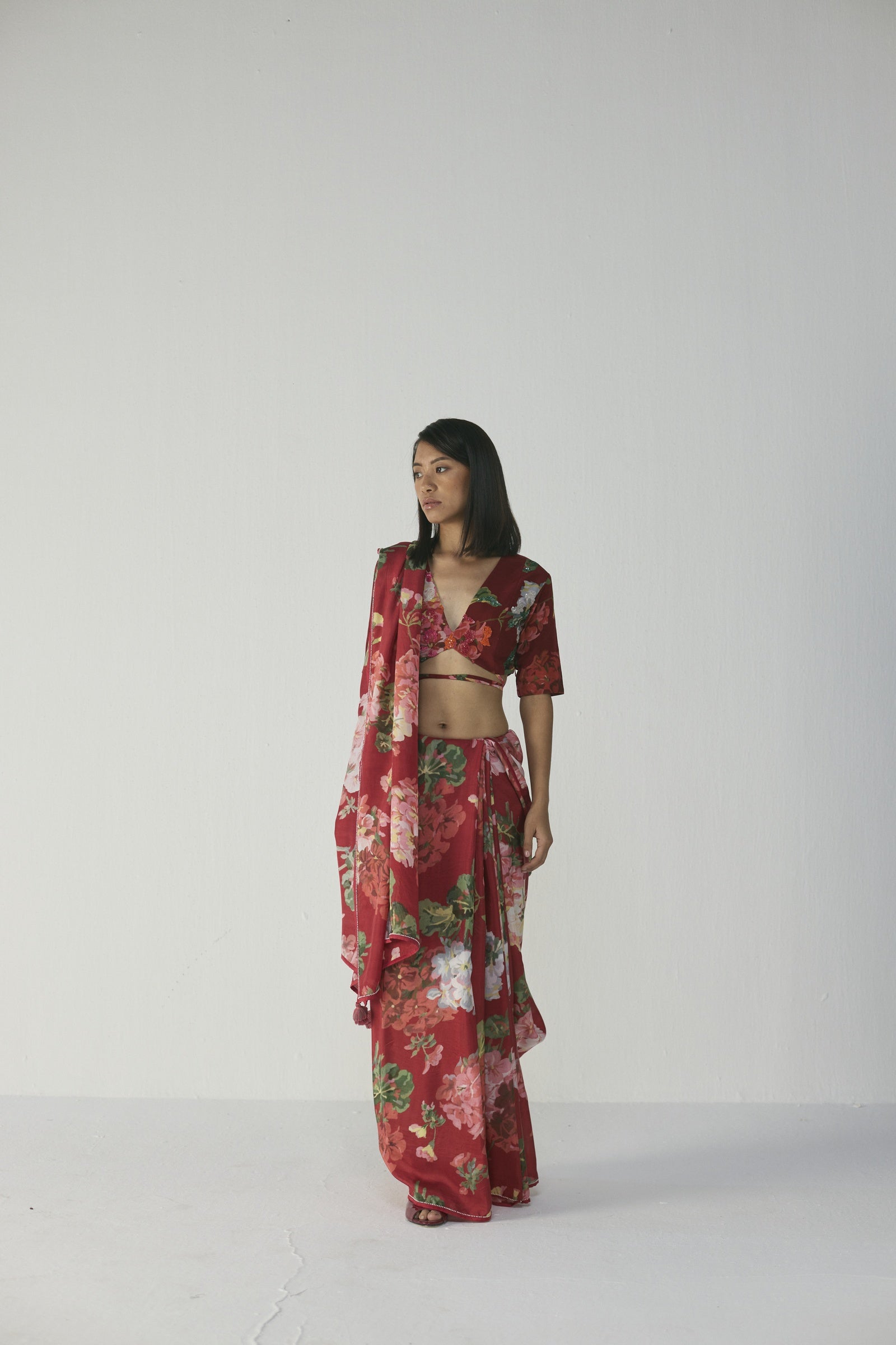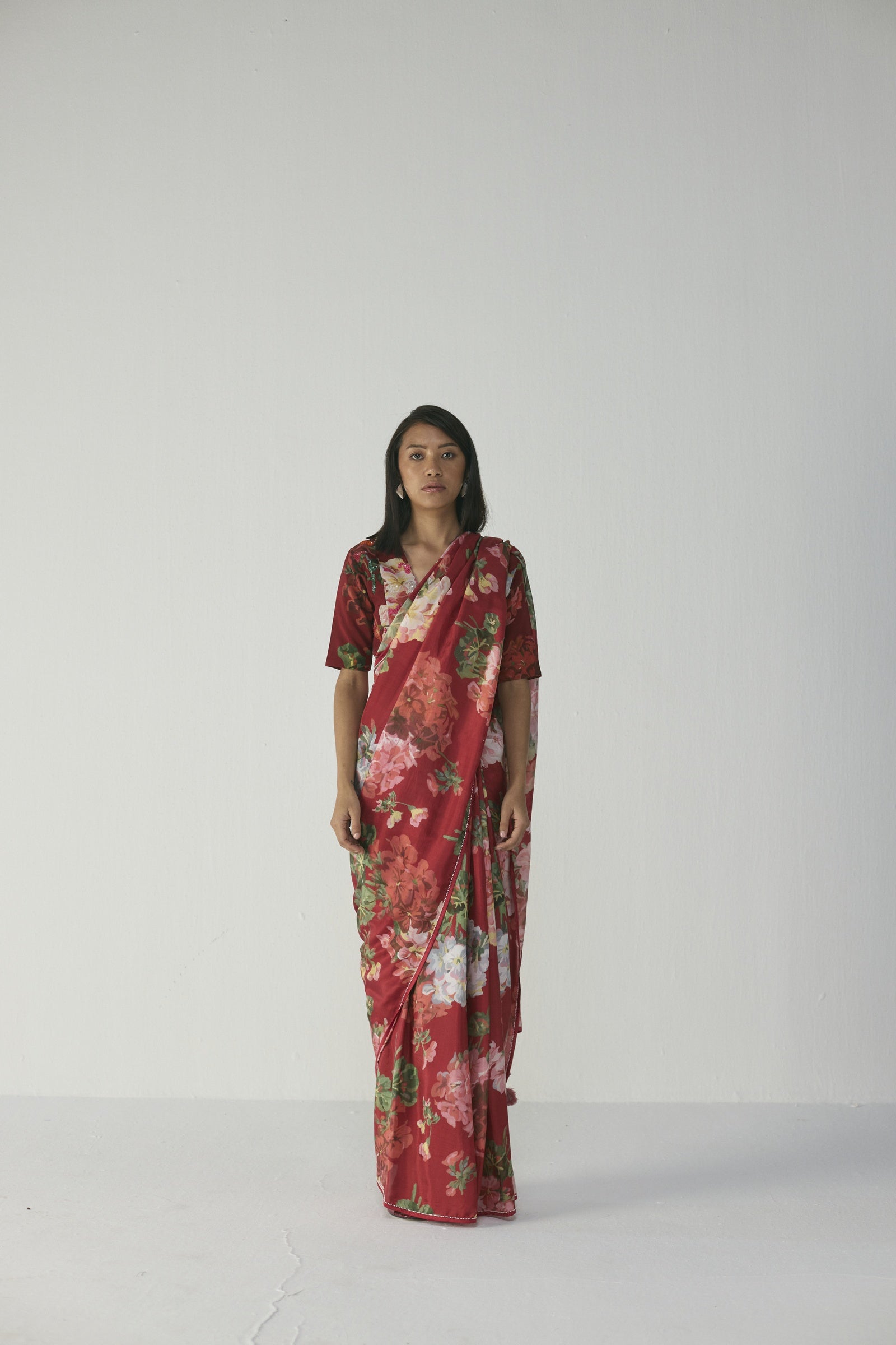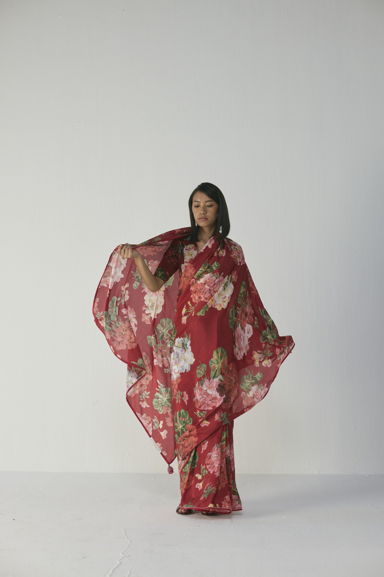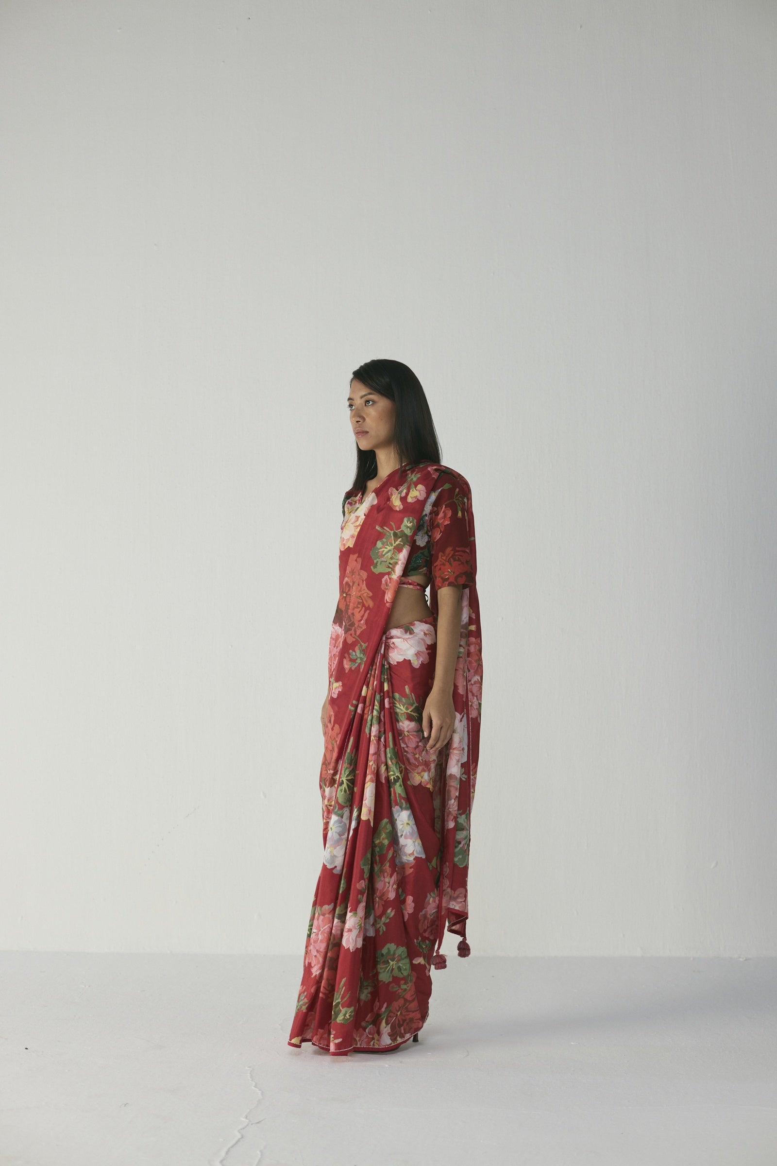 This elegant saree features a striking painterly floral print of blooming roses, daisies, and lush foliage in blush pink, soft coral, ivory, and leafy greens on a rich ruby-red base, crafted in lightweight, flowy fabric with delicate tassel-edged detailing on the pallu, offering a luxurious, hand-painted watercolour effect and an effortless drape that flatters all body types—perfect for festive occasions and daytime or evening celebrations; the saree does not include a blouse.