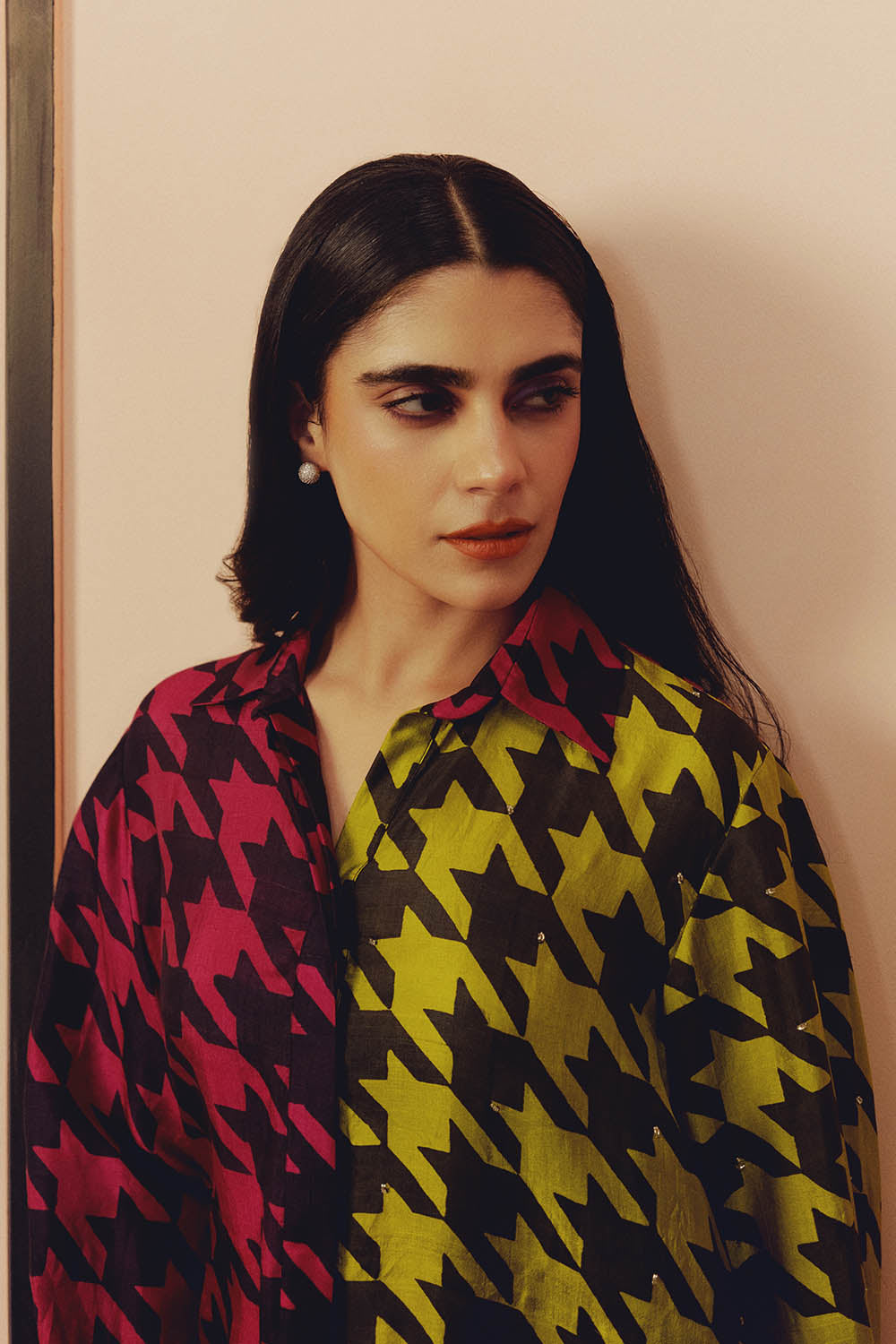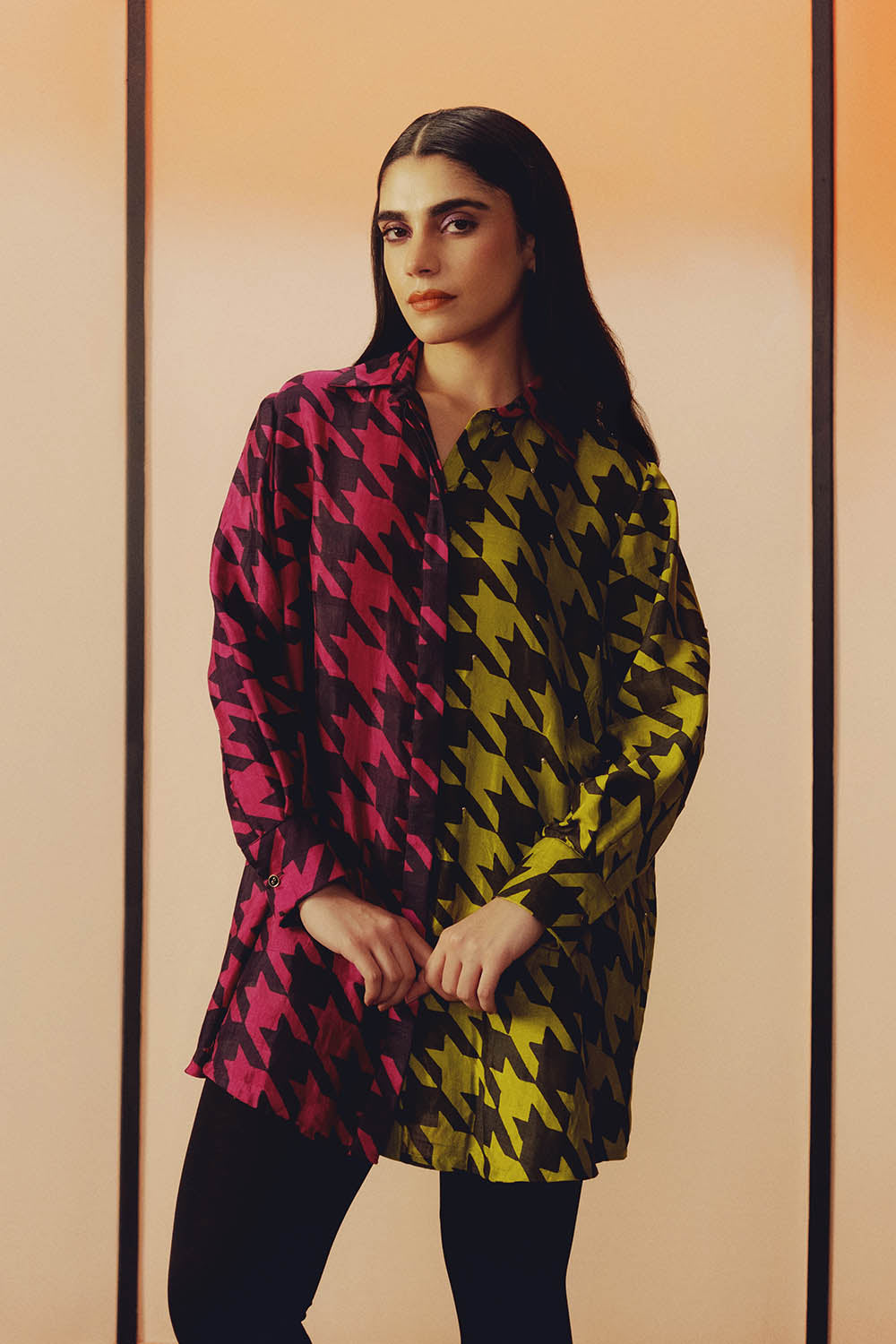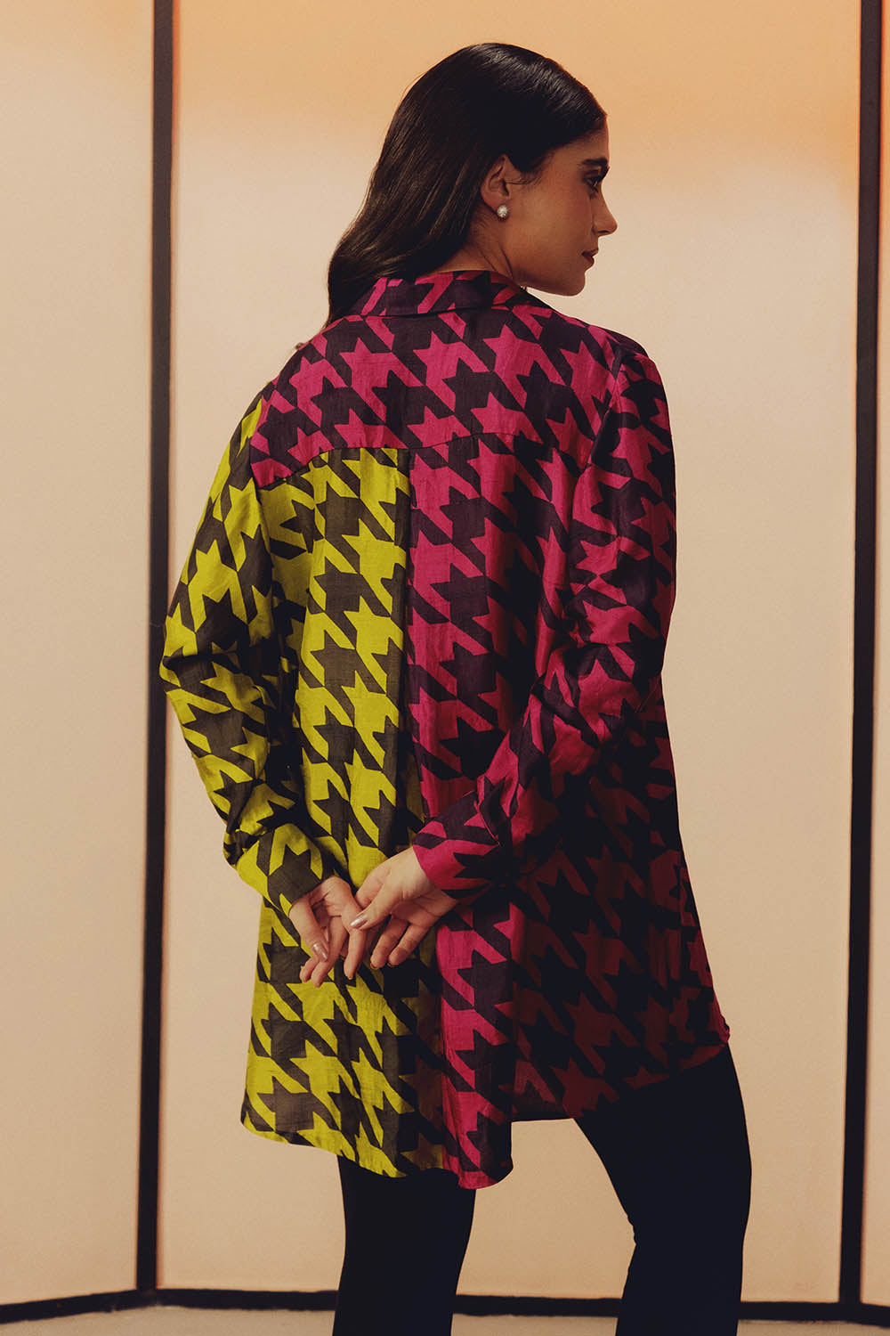 This handwoven mulberry silk shirt features a dual colour design with handblock printing, highlighted by subtle glass beadwork and is designed in classic relaxed fit silhouette.