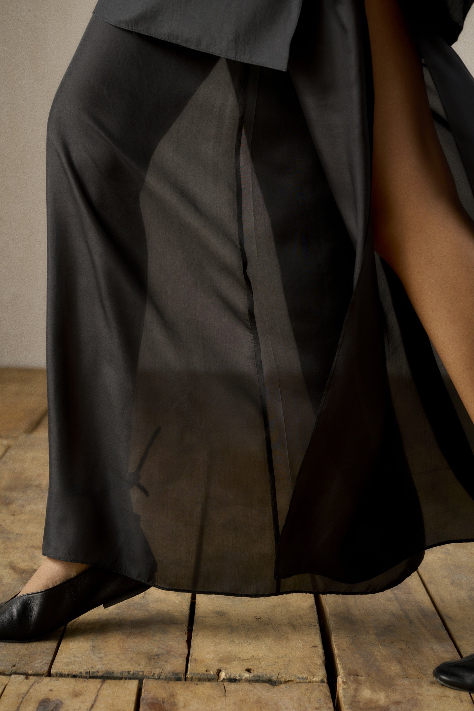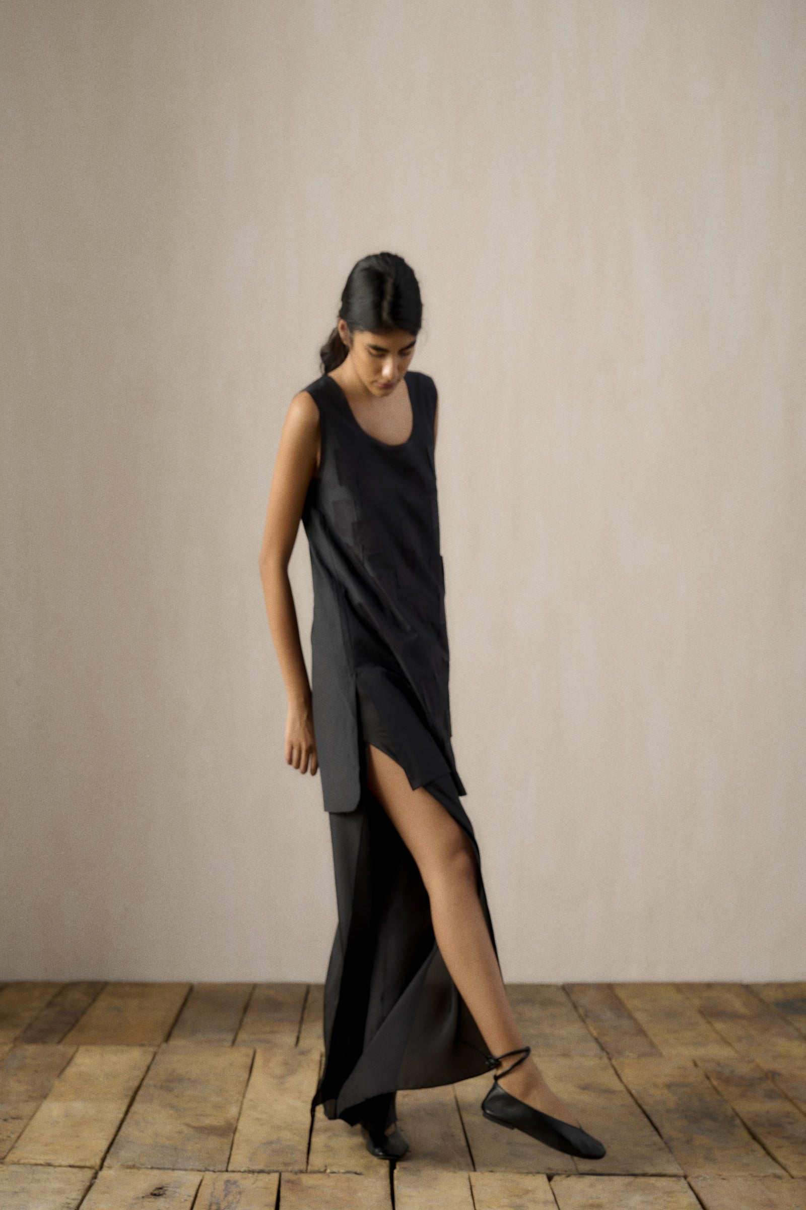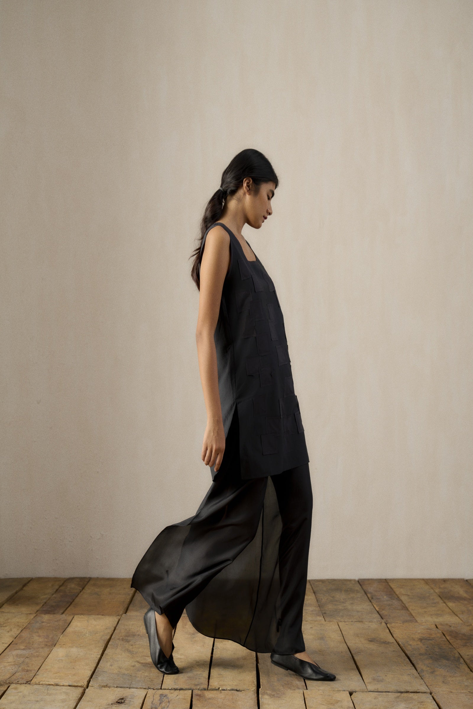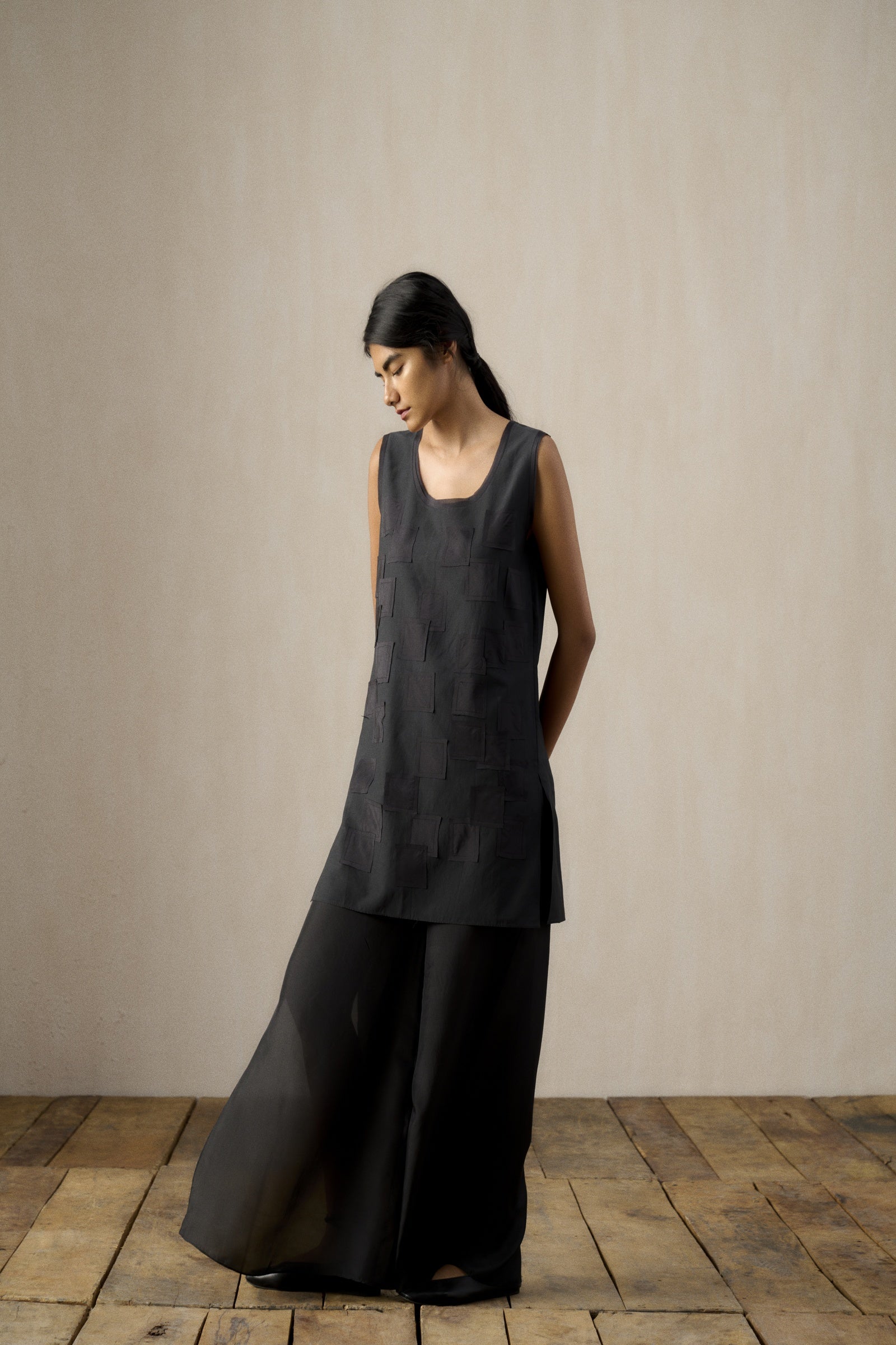Sensual minimalism in motion, featuring silk appliqué work on a cotton-silk tunic, paired with airy, drawstring pure silk pants and delicate appliqué, lending it an understated elegance that moves effortlessly from day to night.