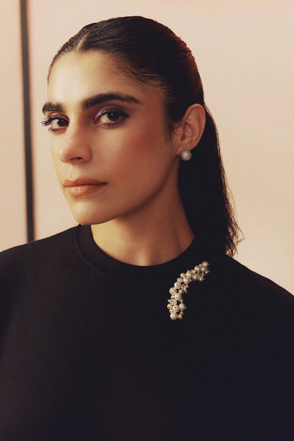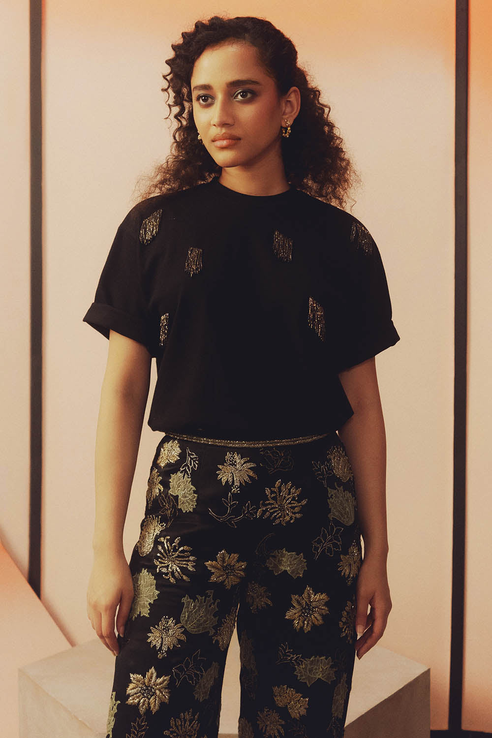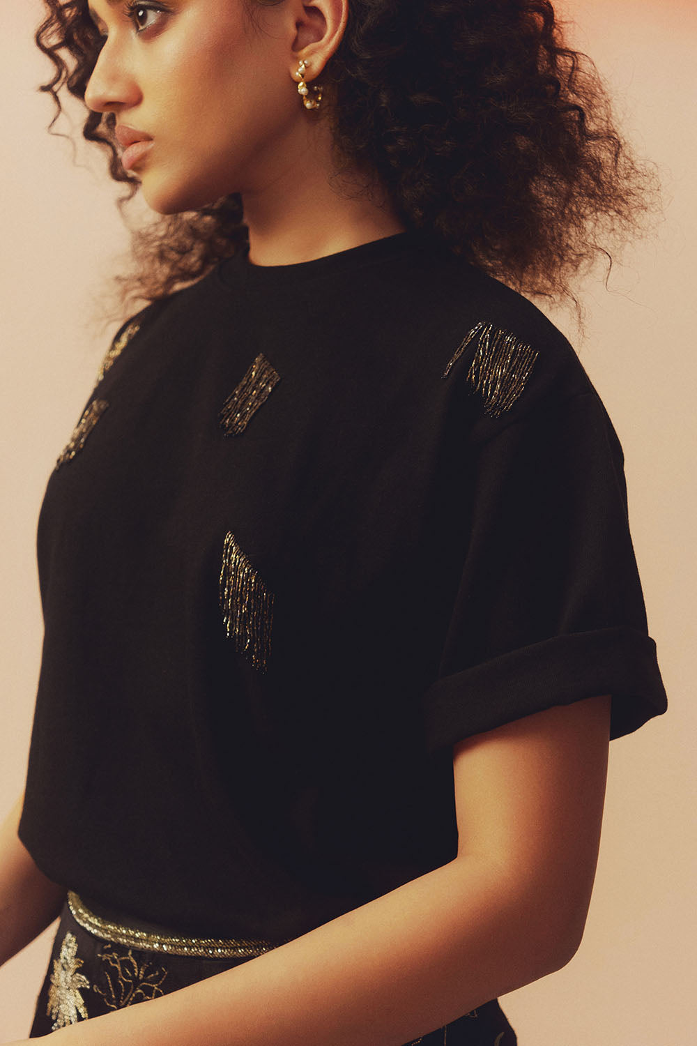 This cotton knit round neck T-shirt features hand embroidered mettalic glass bead detailing. Designed in a classic relaxed fit silhouette.