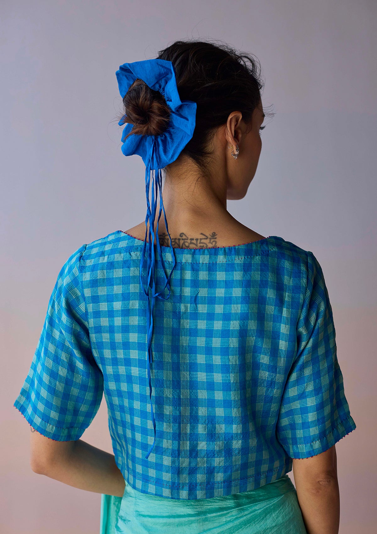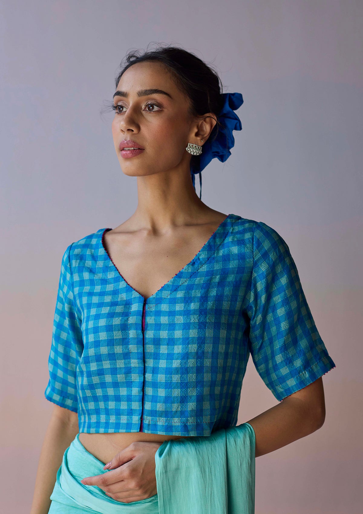 The LightWoven Blouse carries a quiet charm where silk checks meet subtle shimmer in a design that feels structured yet effortless, and is handwoven in Kota silk with a V-neckline and center-front opening, finished with luminous beads along the neckline and sleeve hems that offer a gentle glow with every movement; note that the model is 5'7" tall and wearing size XS.