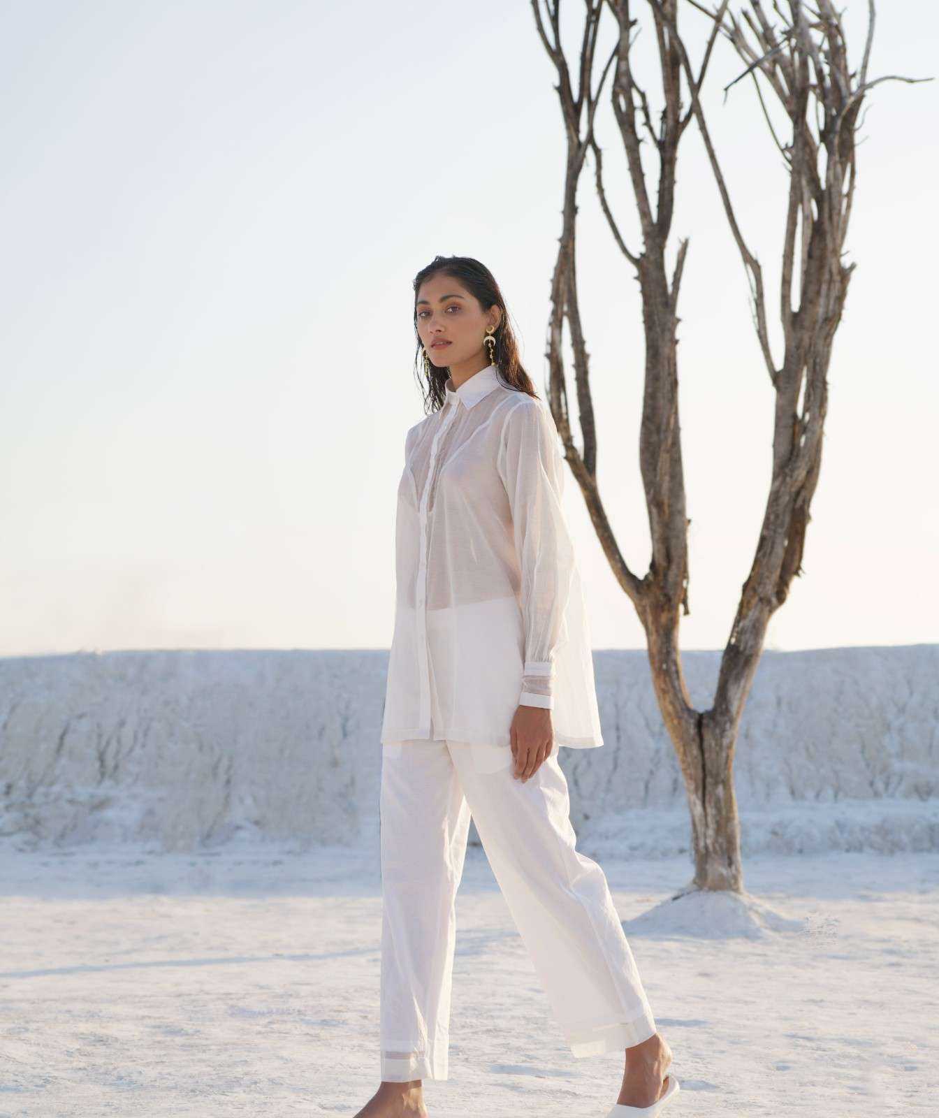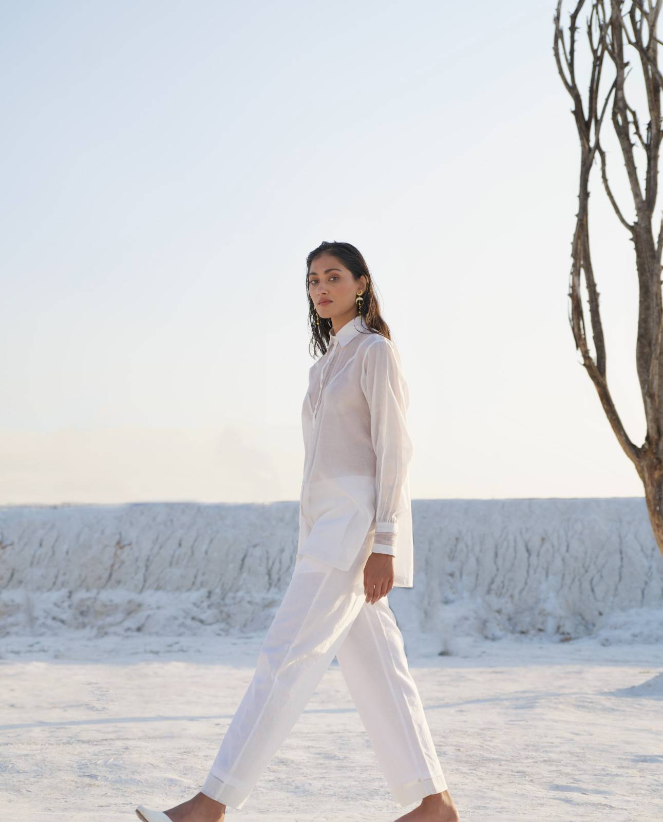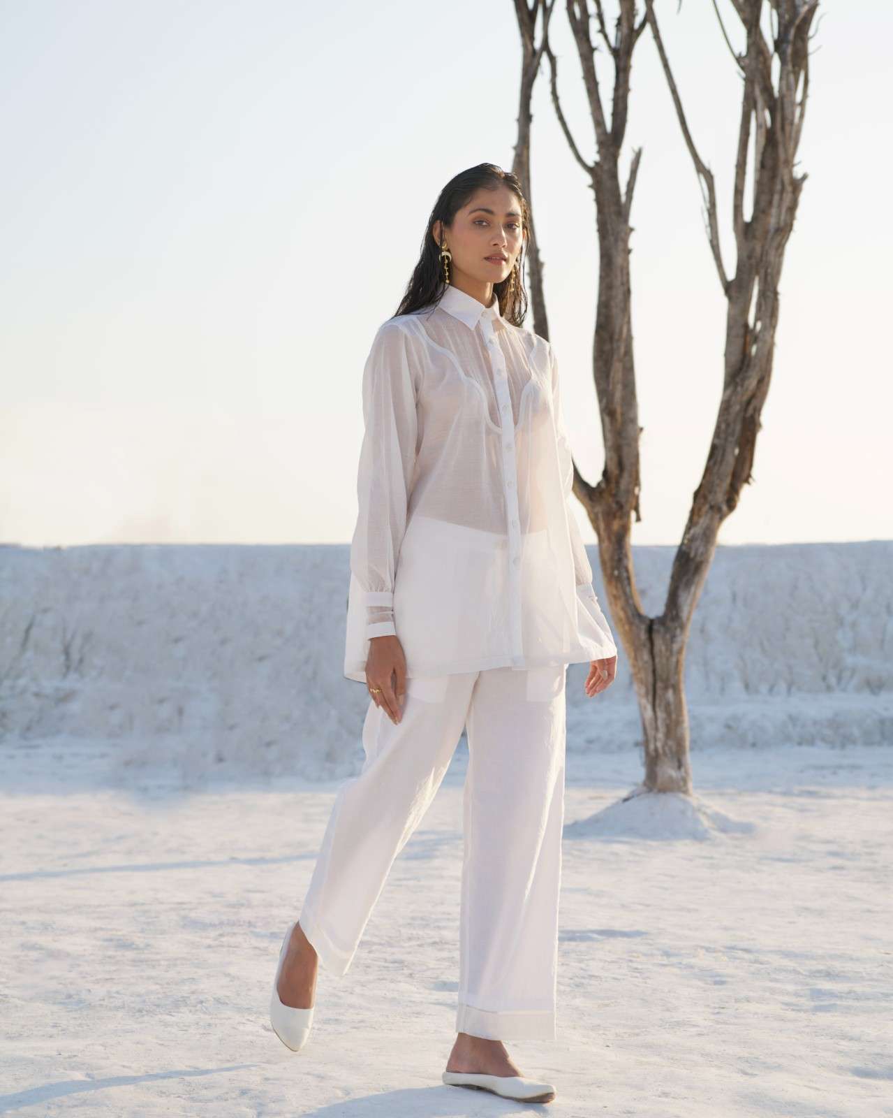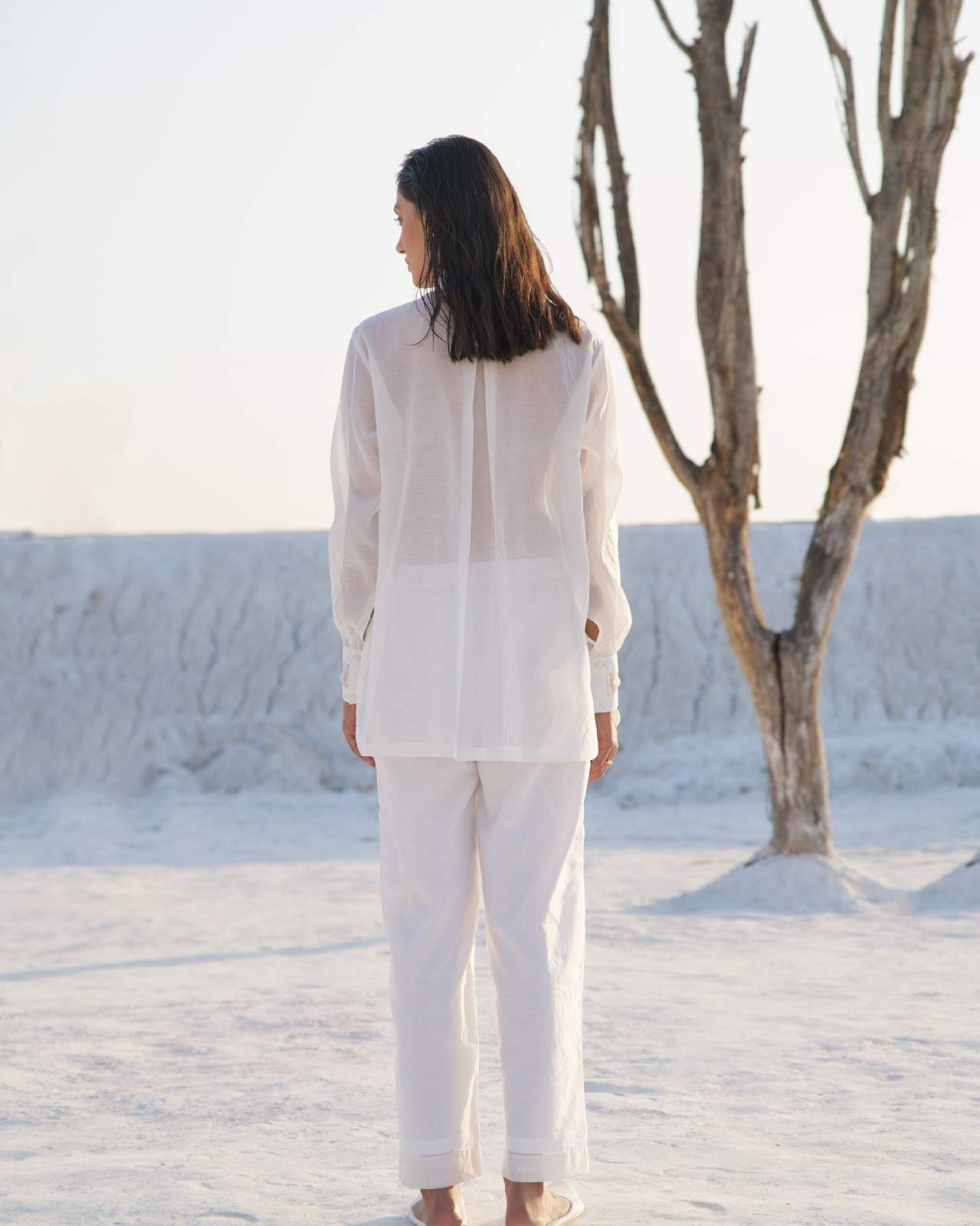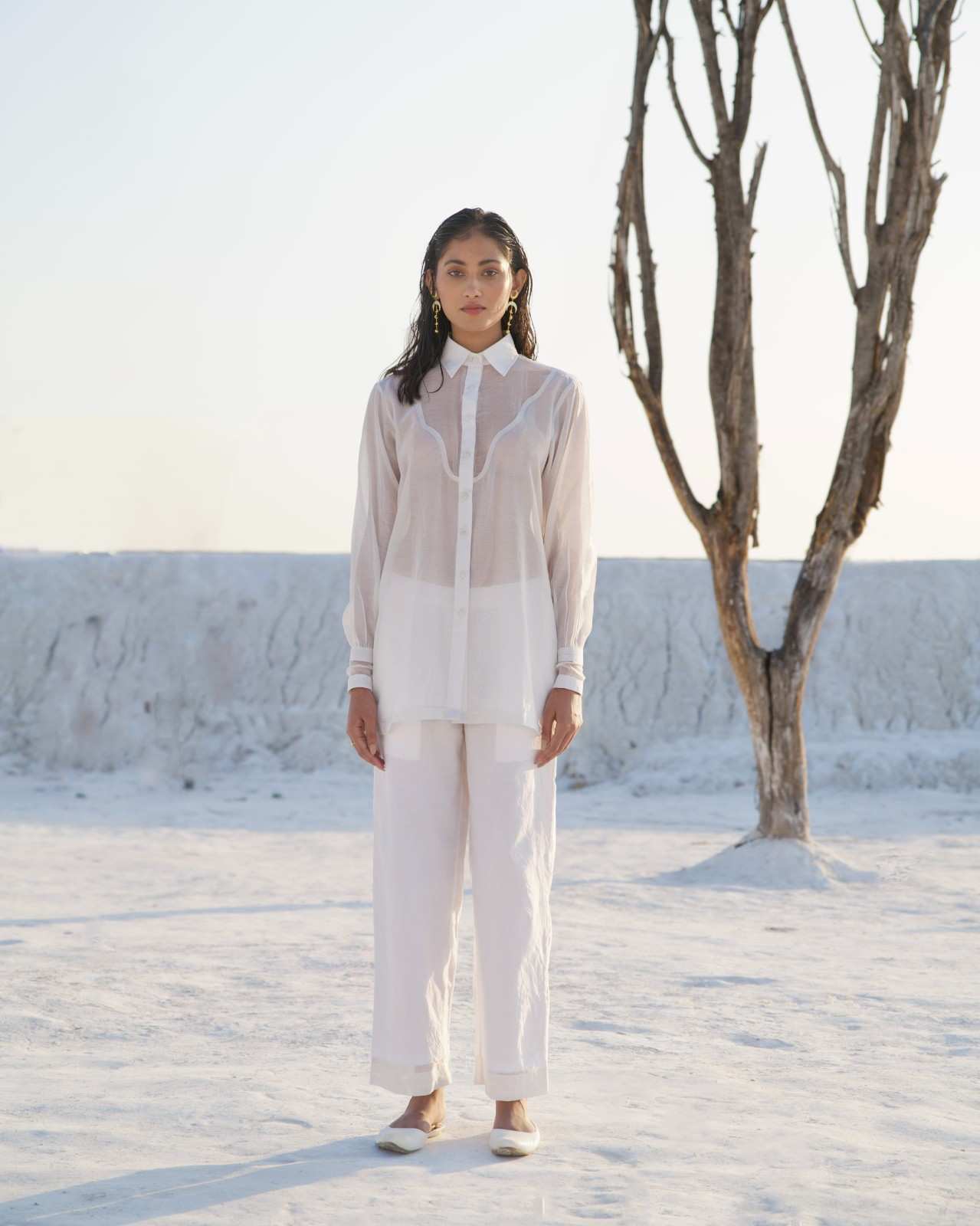 A casual yet chic co-ord set in pearl white, featuring a statement button-down shirt with a curved hem and balloon sleeves. The shirt has an abstract sheer yoke neckline at the front and sheer details on the cuffs, with our patent charkha embroidered at the bottom. It is paired with comfortable silk pants in a similar color, designed with side pockets.