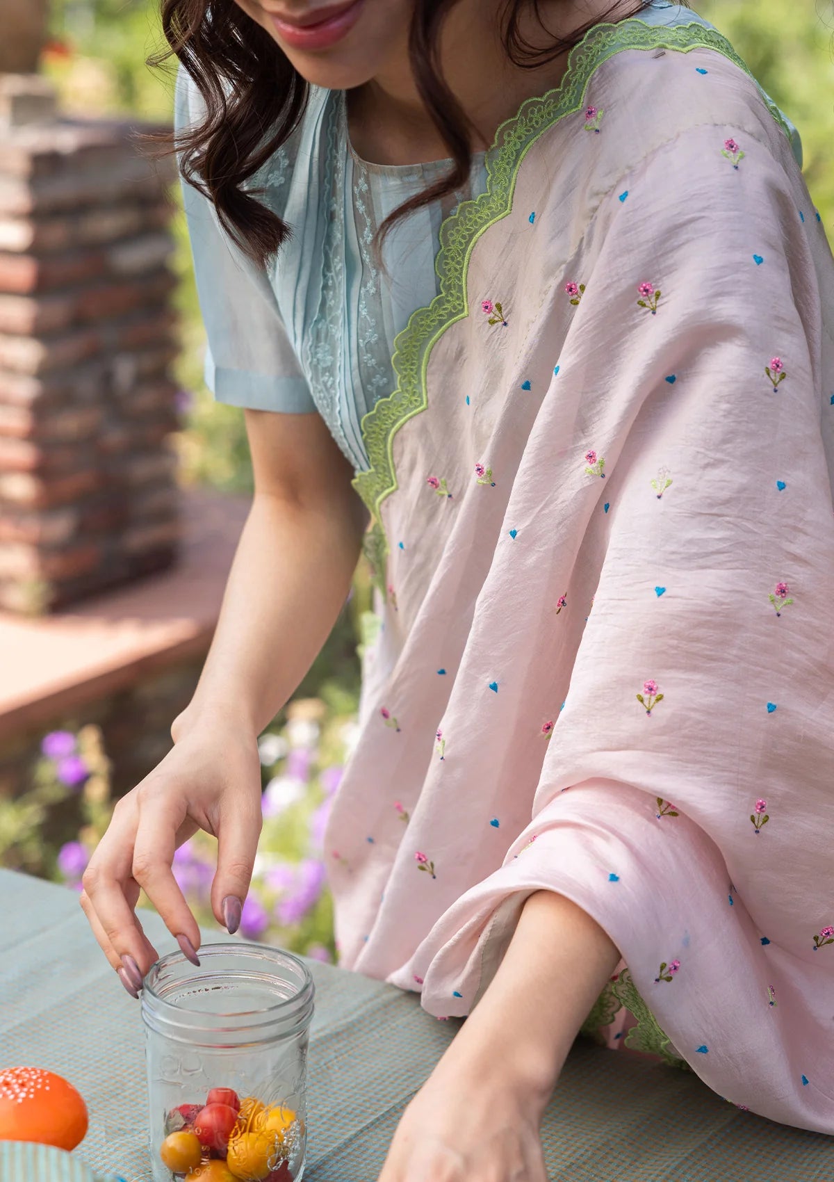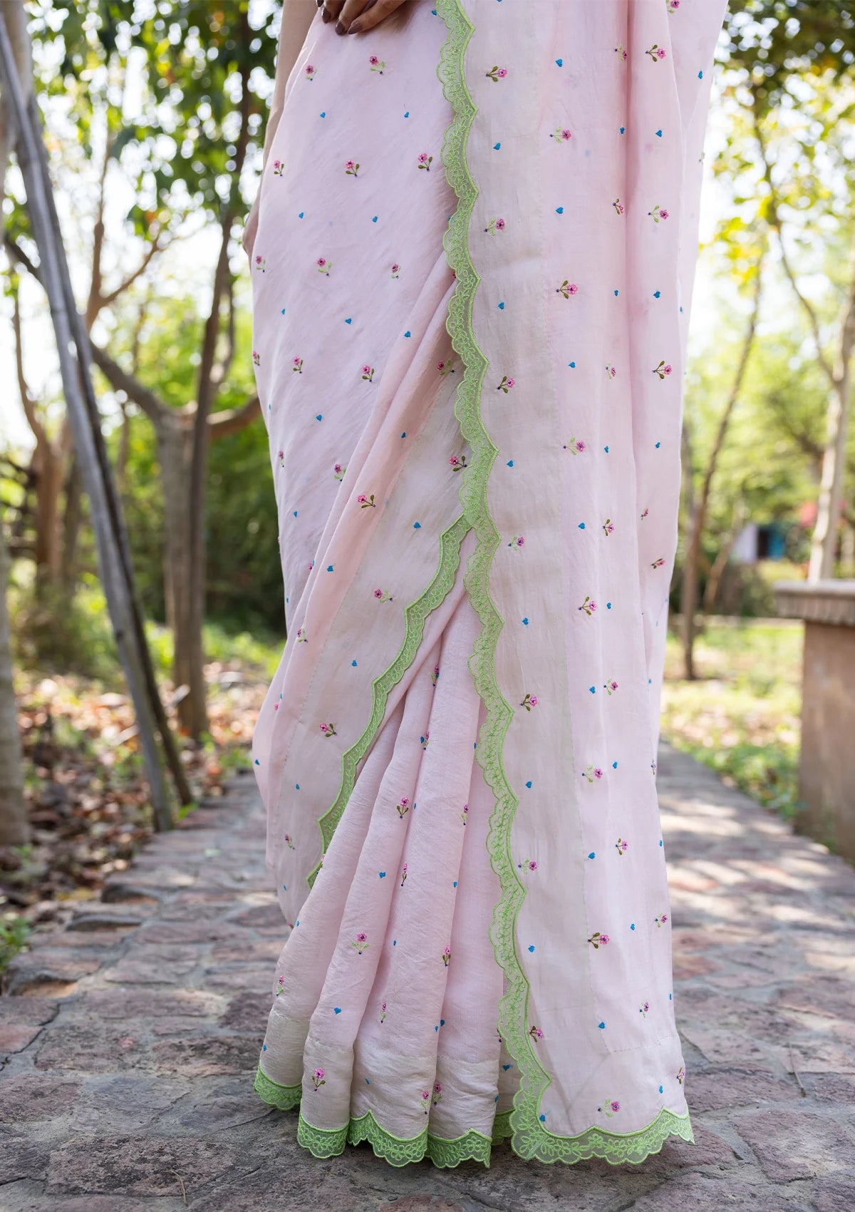 The Love Note Pink Sari is a delicate ode to romance, blending intricate embroidery with soft pastel hues for an effortlessly elegant look. Adorned with small wildflowers and hearts in all-over hand embroidery, this Sari captures the charm of love and nature intertwined. A pastel green floral embroidered scalloped border adds a touch of finesse, while the all-around pastel green organza facing enhances its dreamy appeal and fall. Pair it with the Whispering Ivy Blue Blouse to complete the look (can be purchased separately).