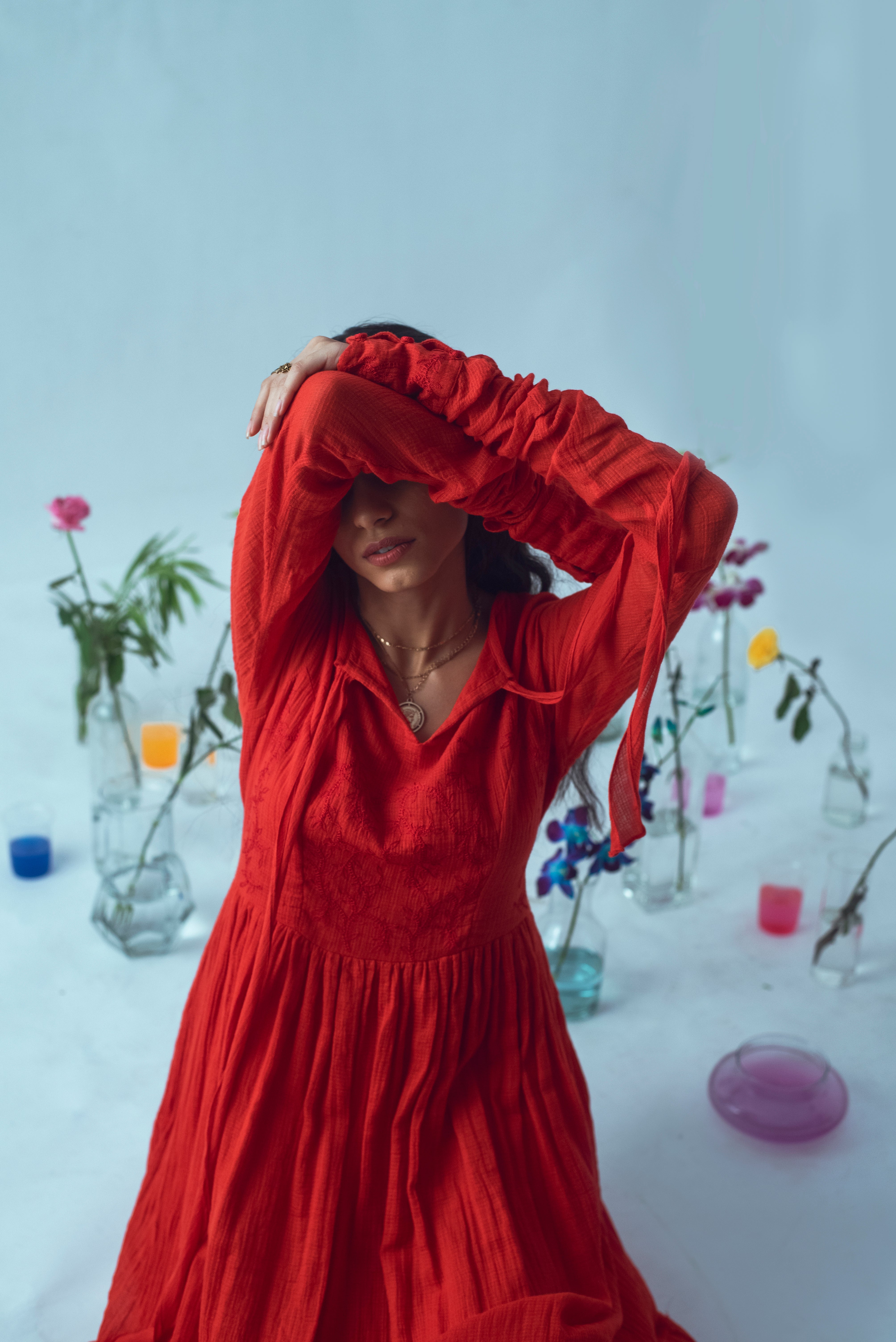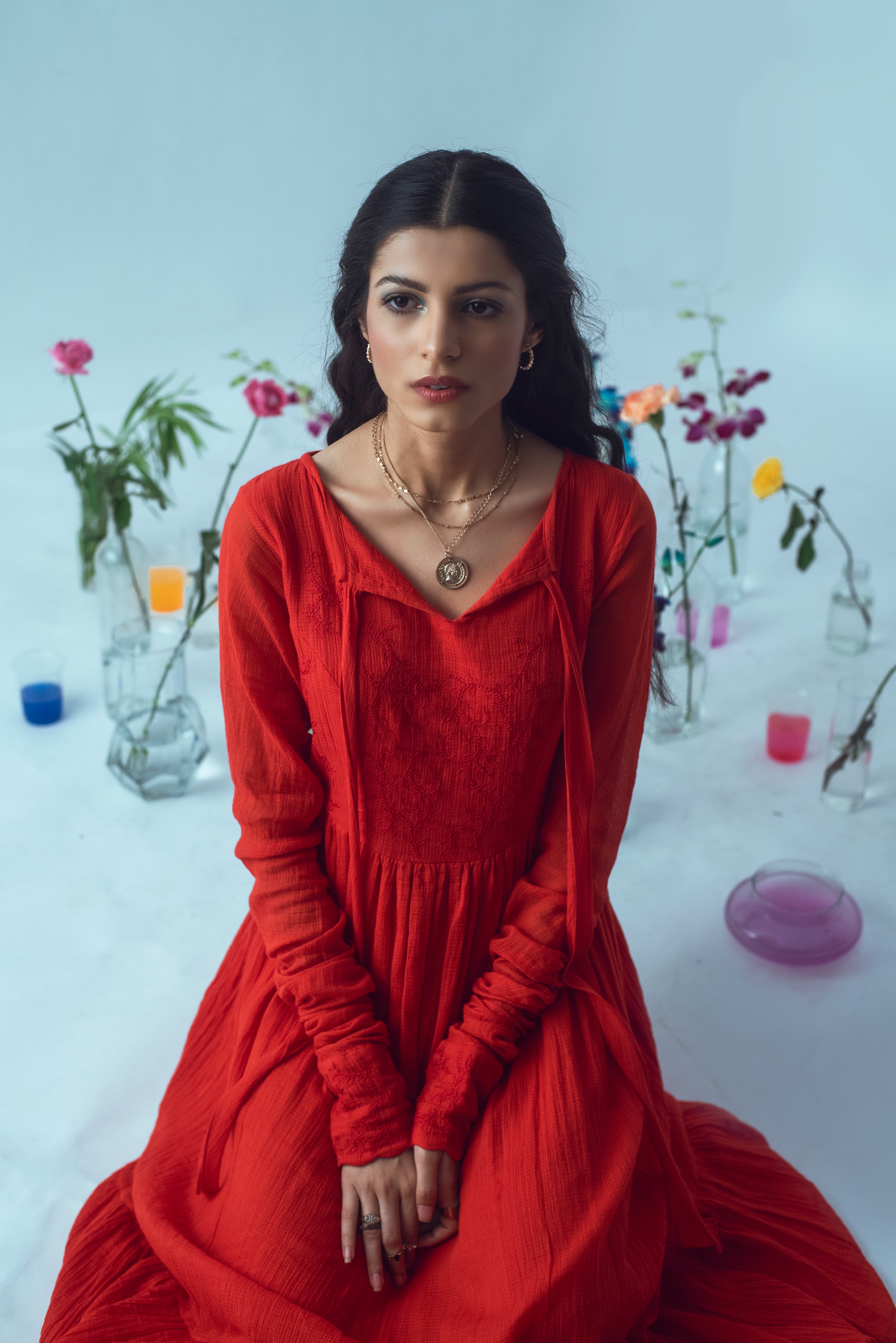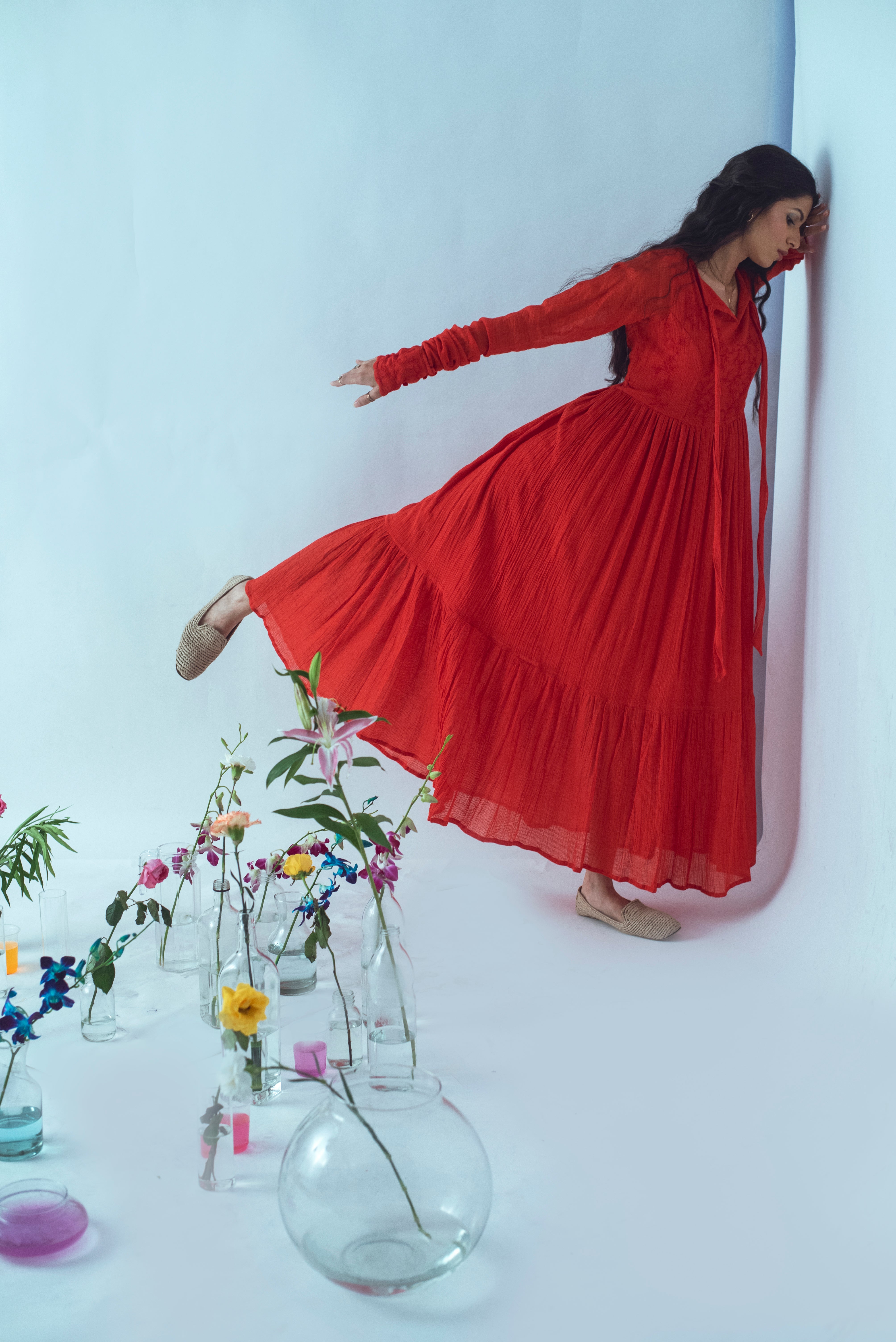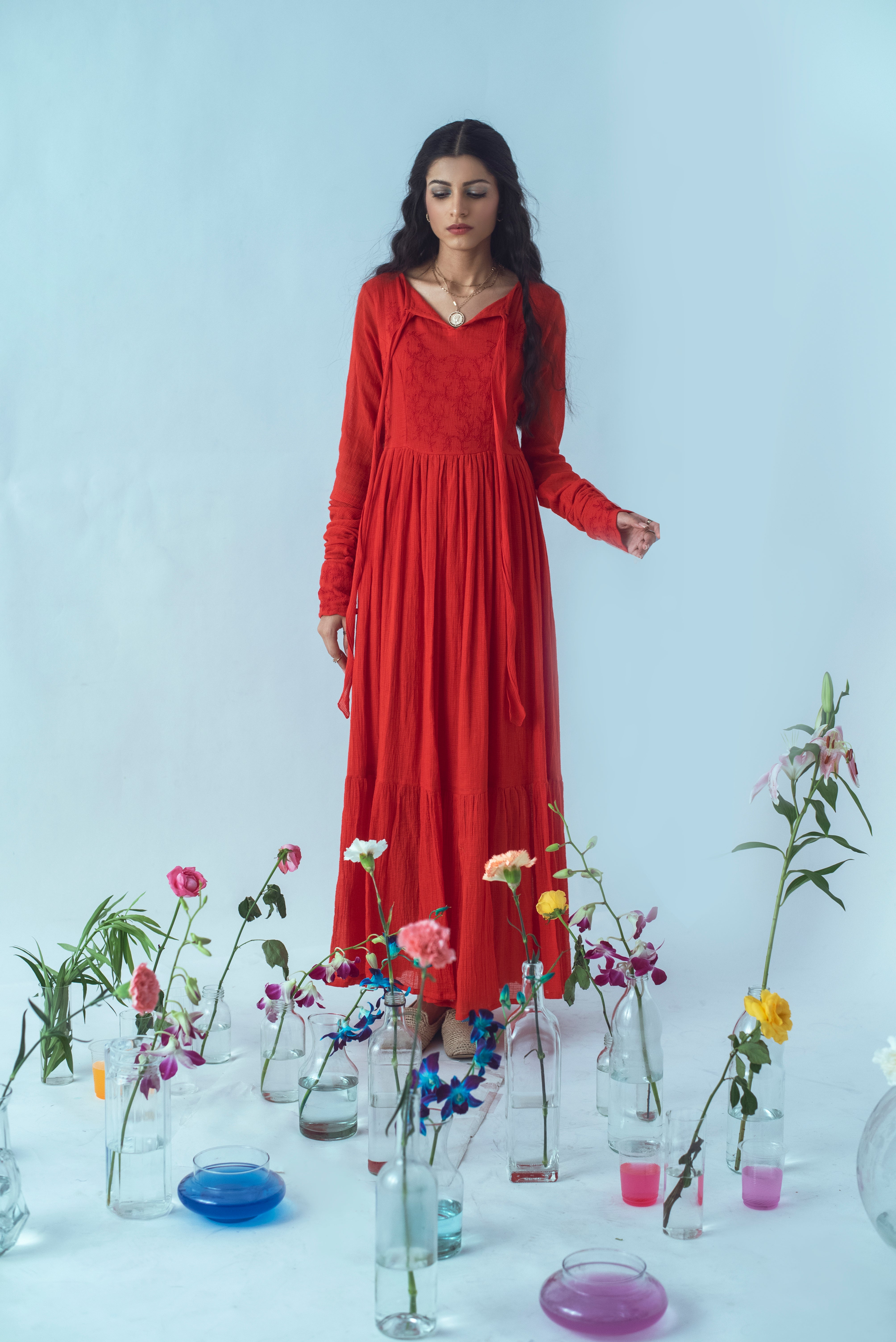 A perfect occasion friendly dress made in handwoven Kota slub fabric with intricate hand embroidered jaal on the body & on the cuff with smart tie-up neckline detail. It’s a two-tier dress.This collection is a tribute to every woman who live and play several different roles in one lifetime. Through this collection, we highlight the joy, the excitement, the confidence and self love that every woman should embrace.