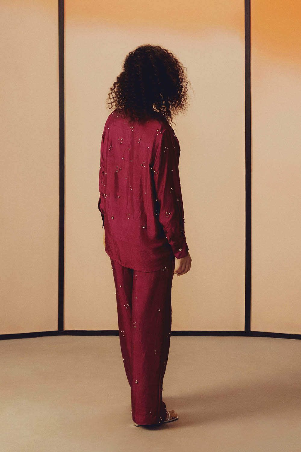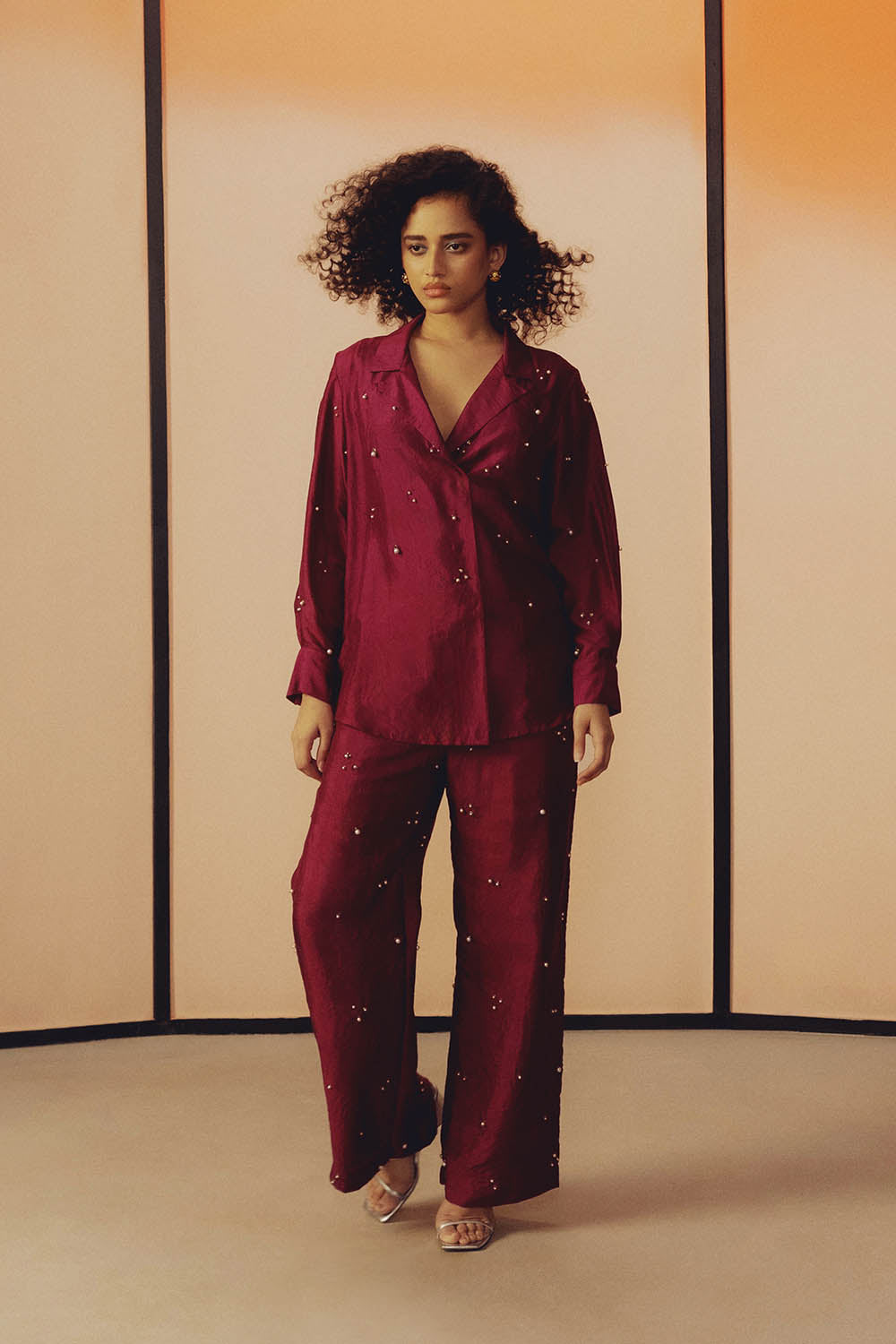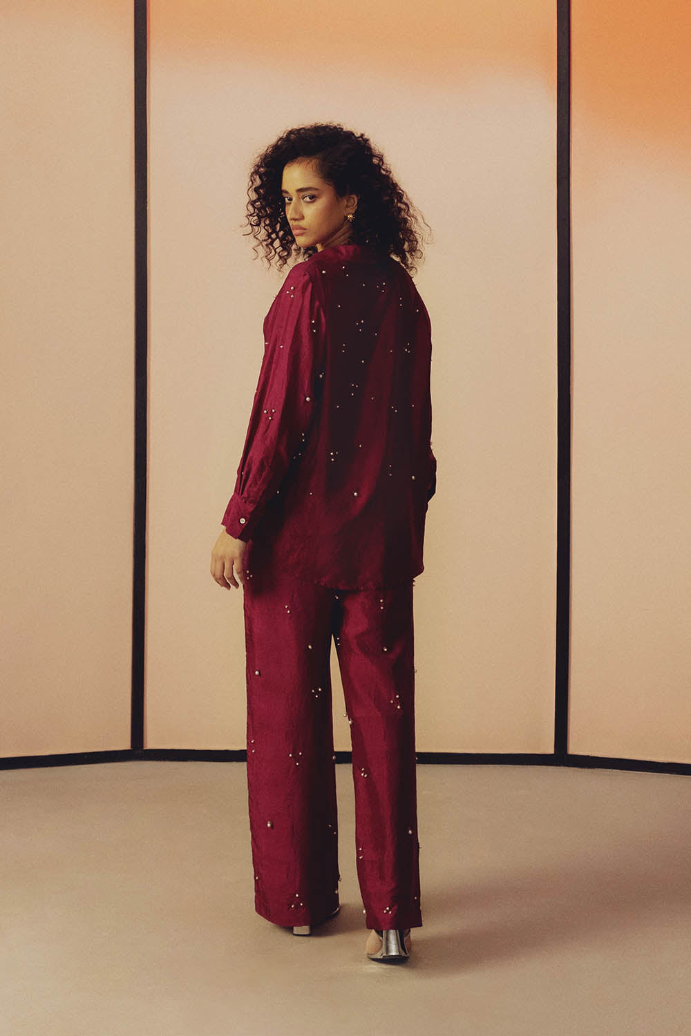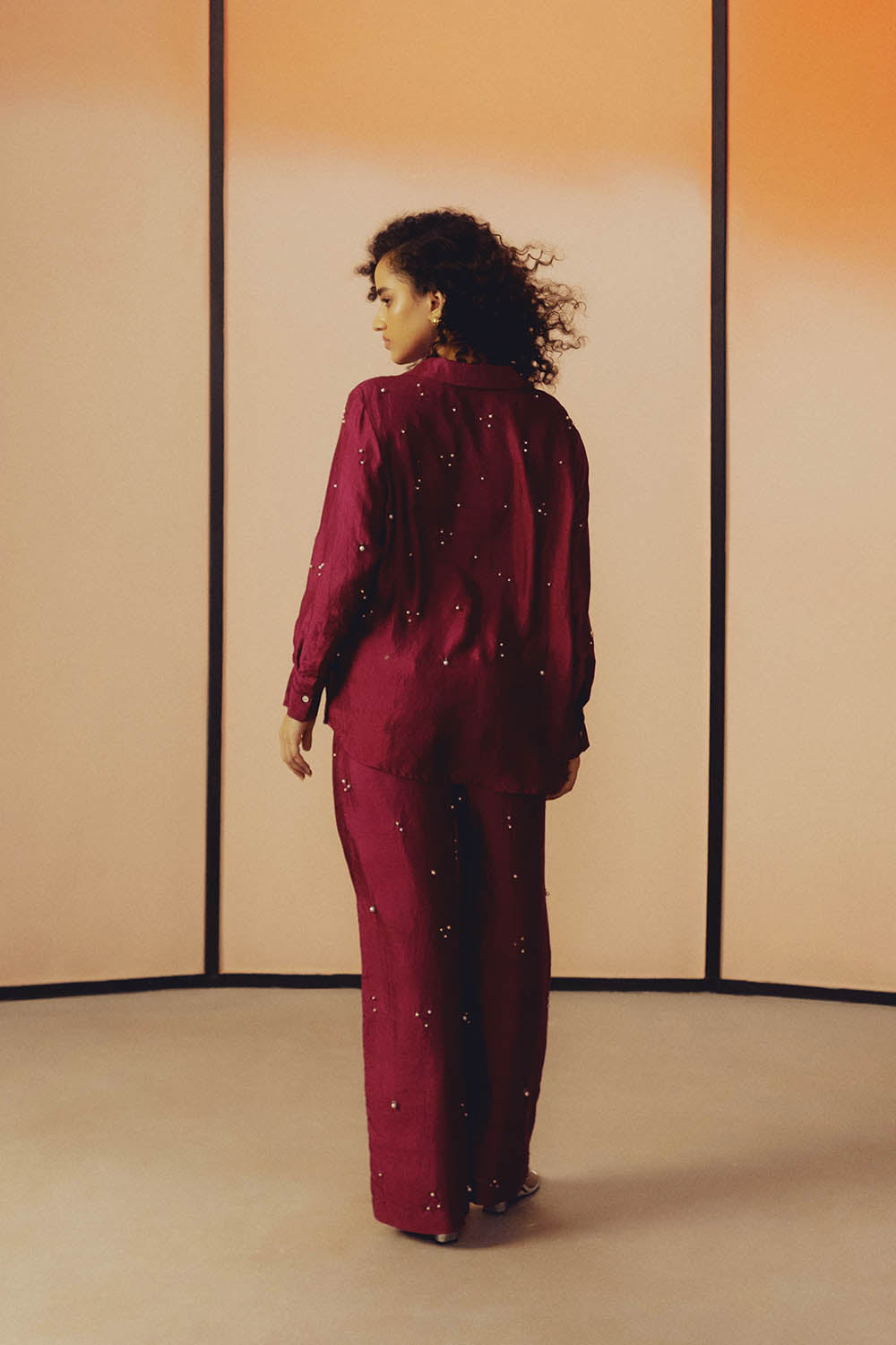 This handwoven mulberry silk shirt style jacket set features hand embroidered pearl and glass beadwork. Designed in classic easy fit silhouette, it is paired with highb wasited pants featuring pockets on both the sides.