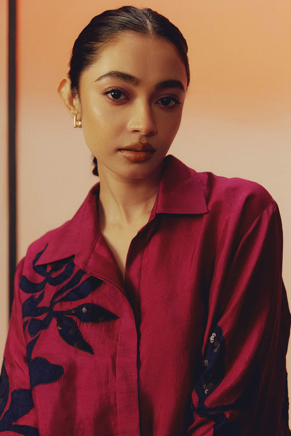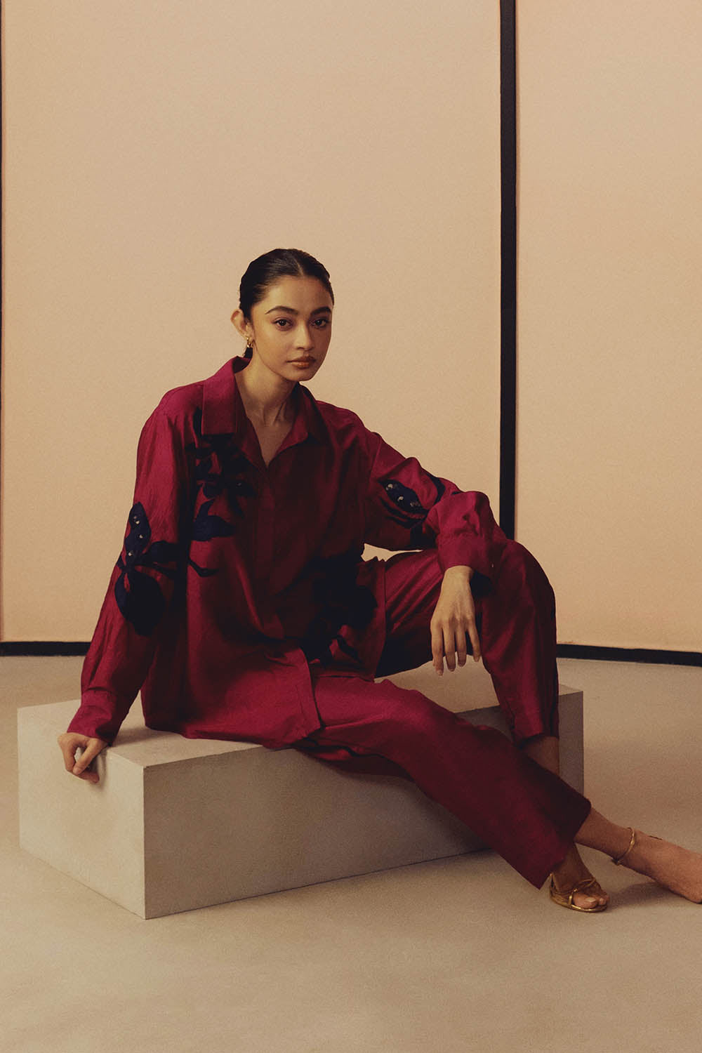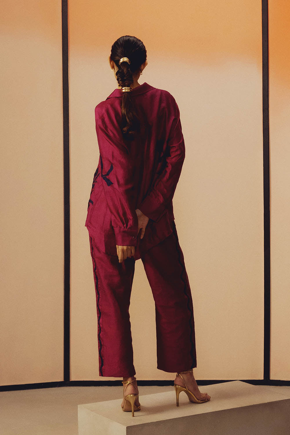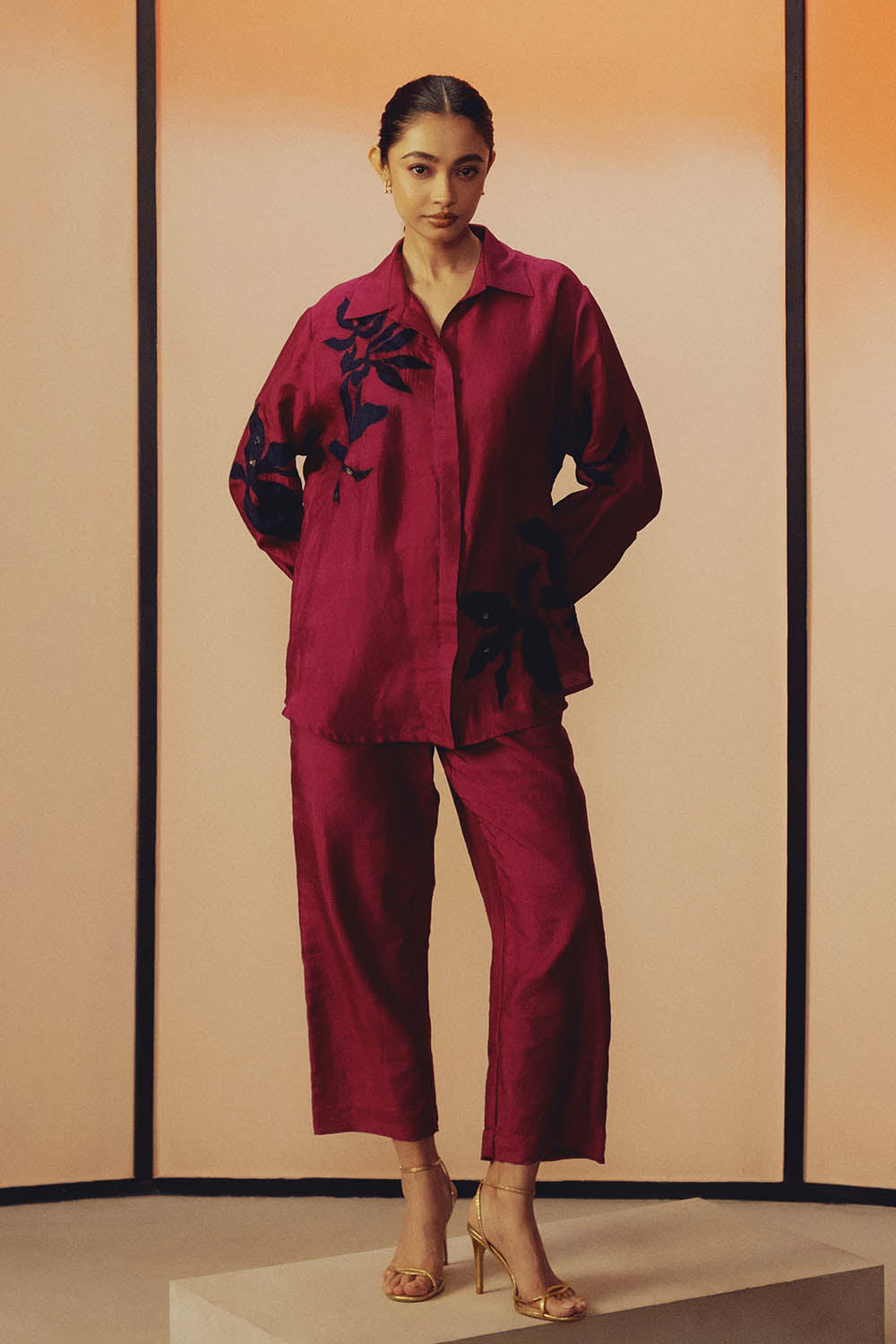 This handwoven mulberry silk shirt set features contrast floral motif applique enhanced with delicate hand embroidered sequin work. Designed in classic easy fit silhouette, it is paired with narrow, ankle length pants featuring pockets on both sides.