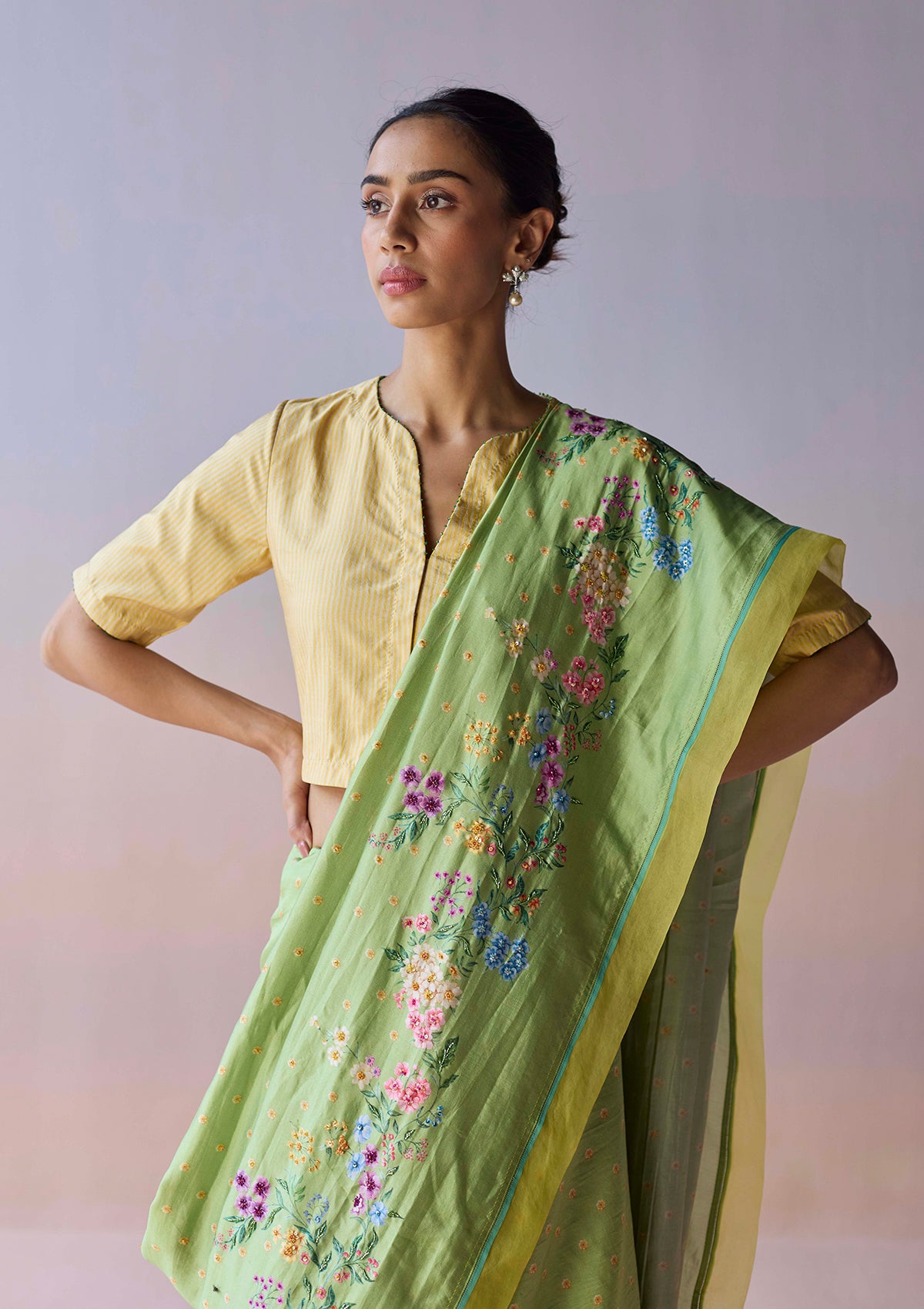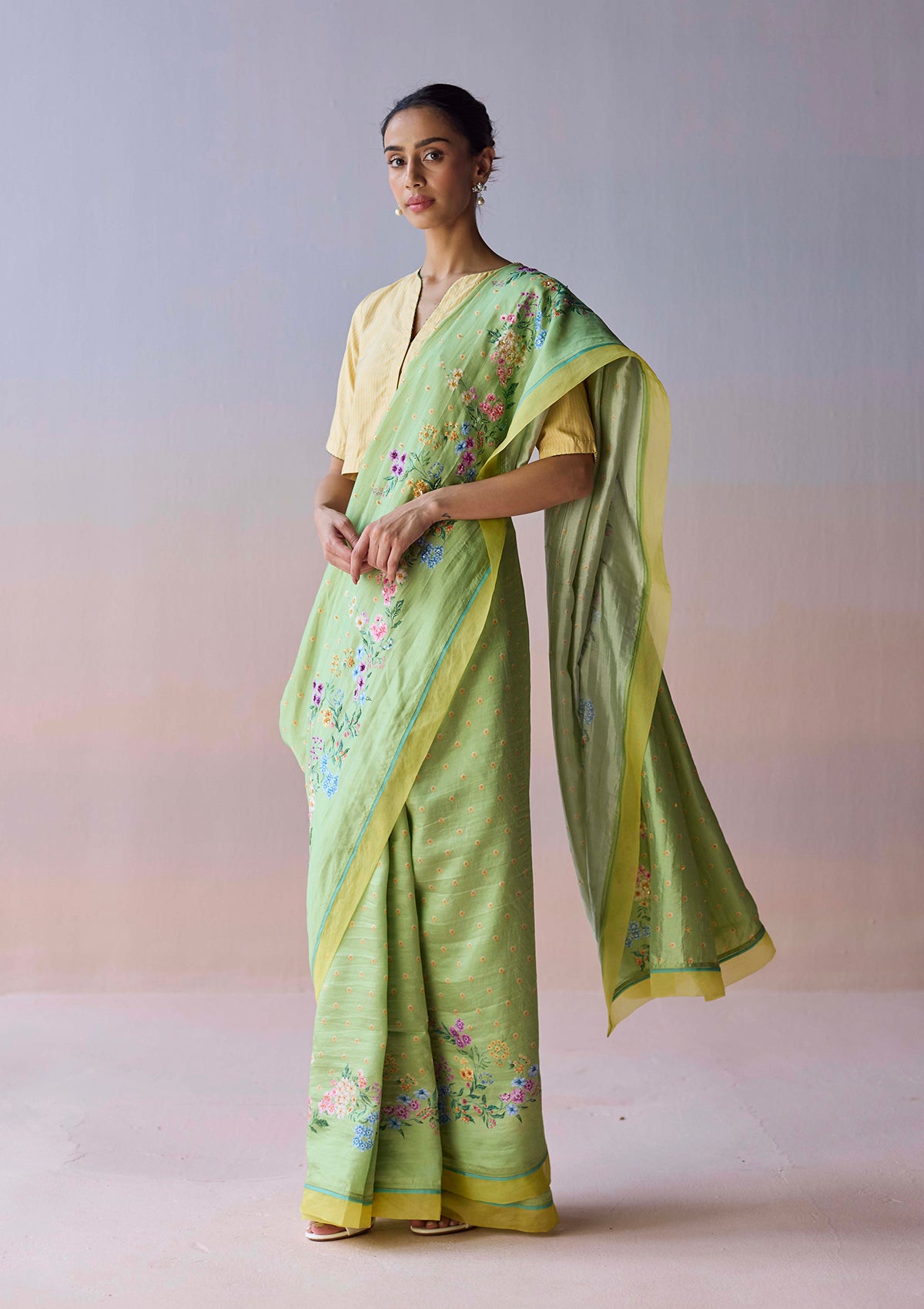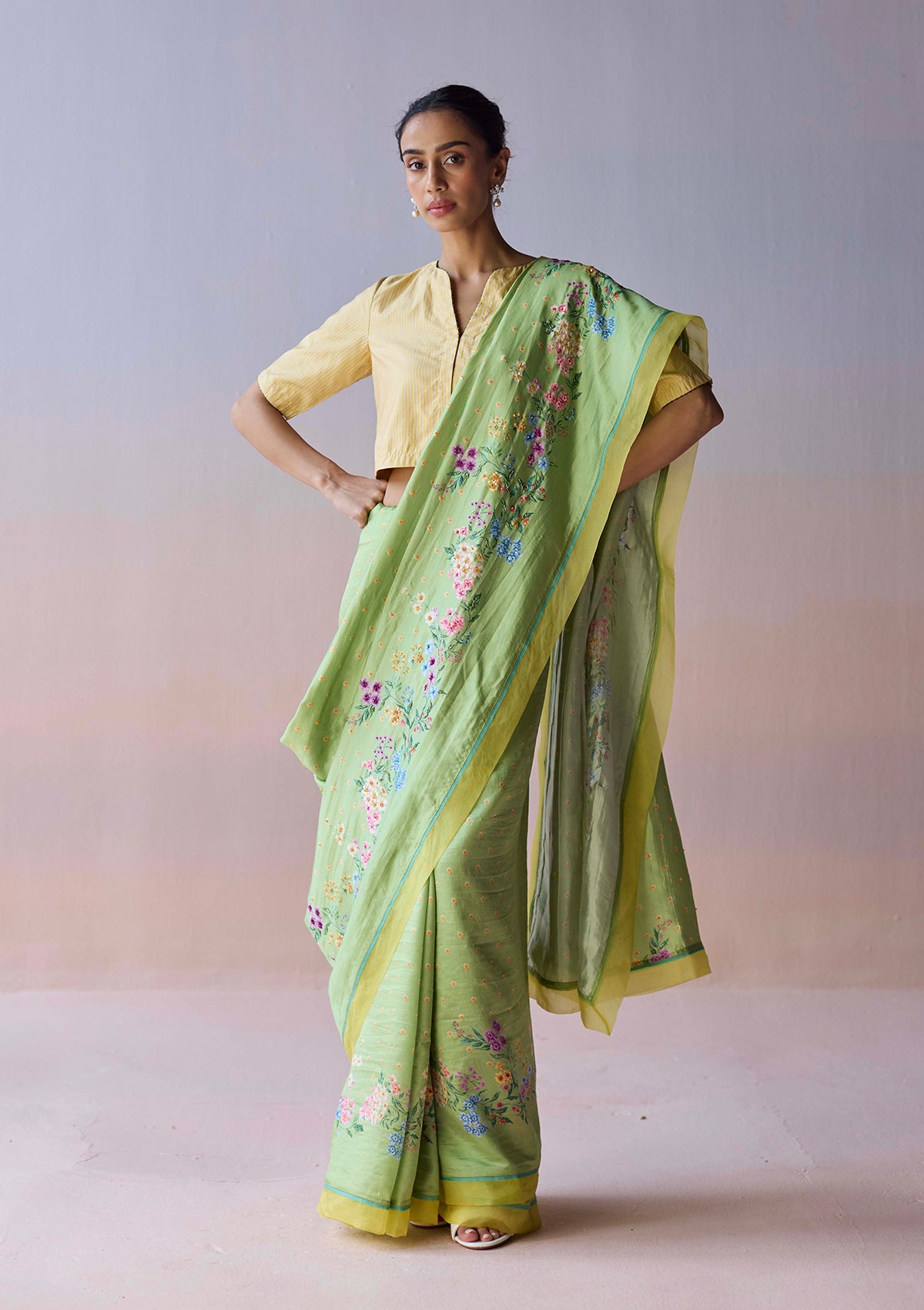 The Morning Whisper Sari, inspired by the stillness of dawn with gentle green tones that reflect nature awakening, features a delicate creeper print along the lower half hand-embellished with sequins and beads from the pleats to the end of the pallu, finished with an airy pure organza border, and can be paired with the Soft Radiance Yellow Blouse to complete the look, and the model is 5'7" tall.