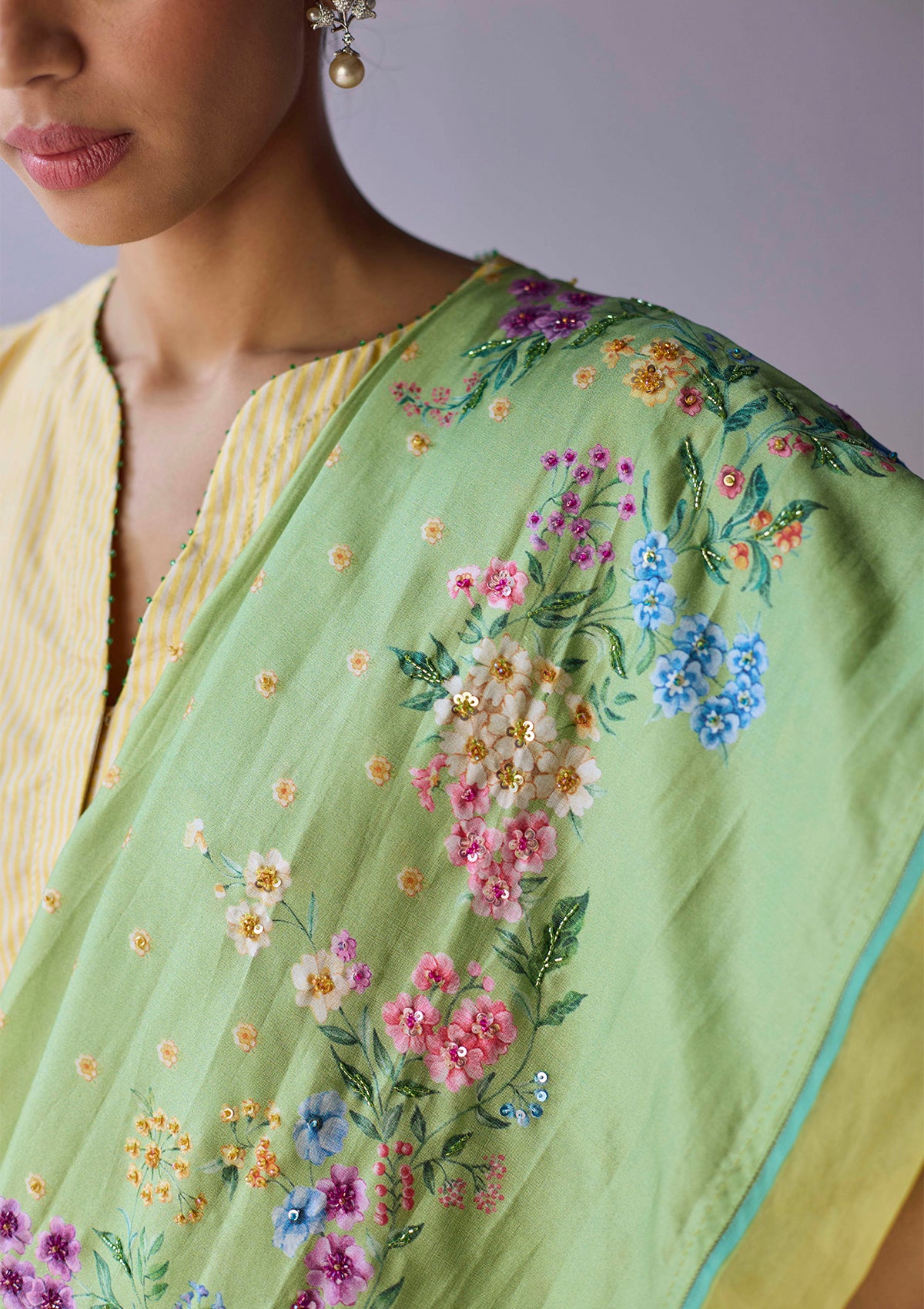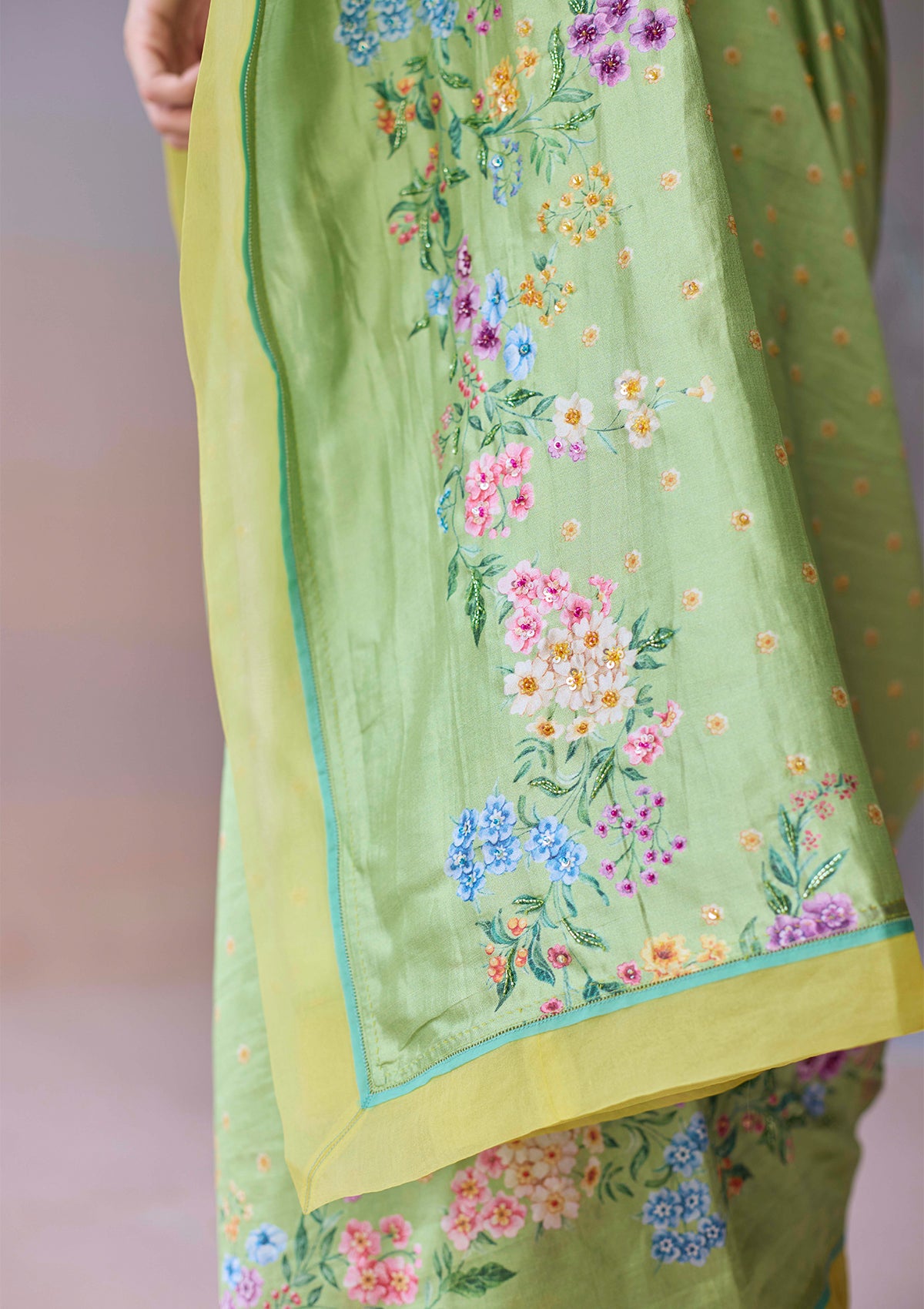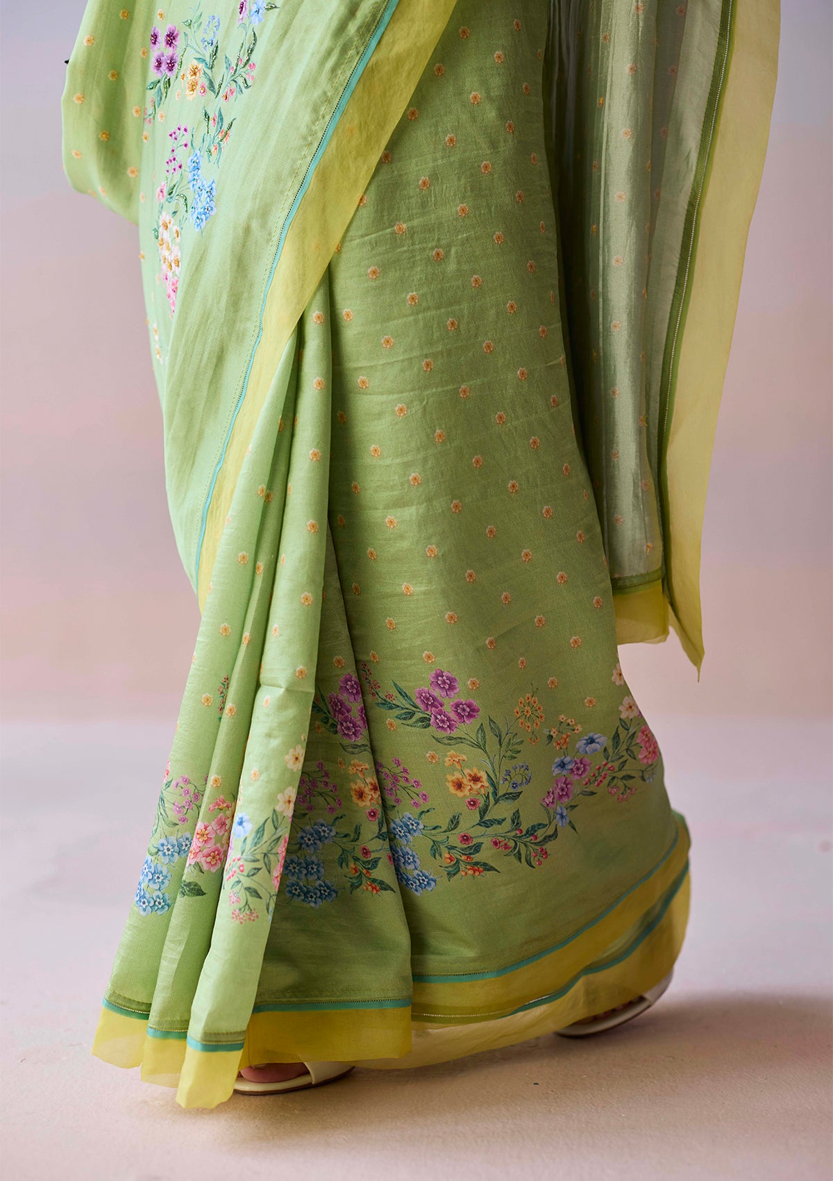 The Morning Whisper Sari, inspired by the stillness of dawn with gentle green tones that reflect nature awakening, features a delicate creeper print along the lower half hand-embellished with sequins and beads from the pleats to the end of the pallu, finished with an airy pure organza border, and can be paired with the Soft Radiance Yellow Blouse to complete the look, and the model is 5'7" tall.