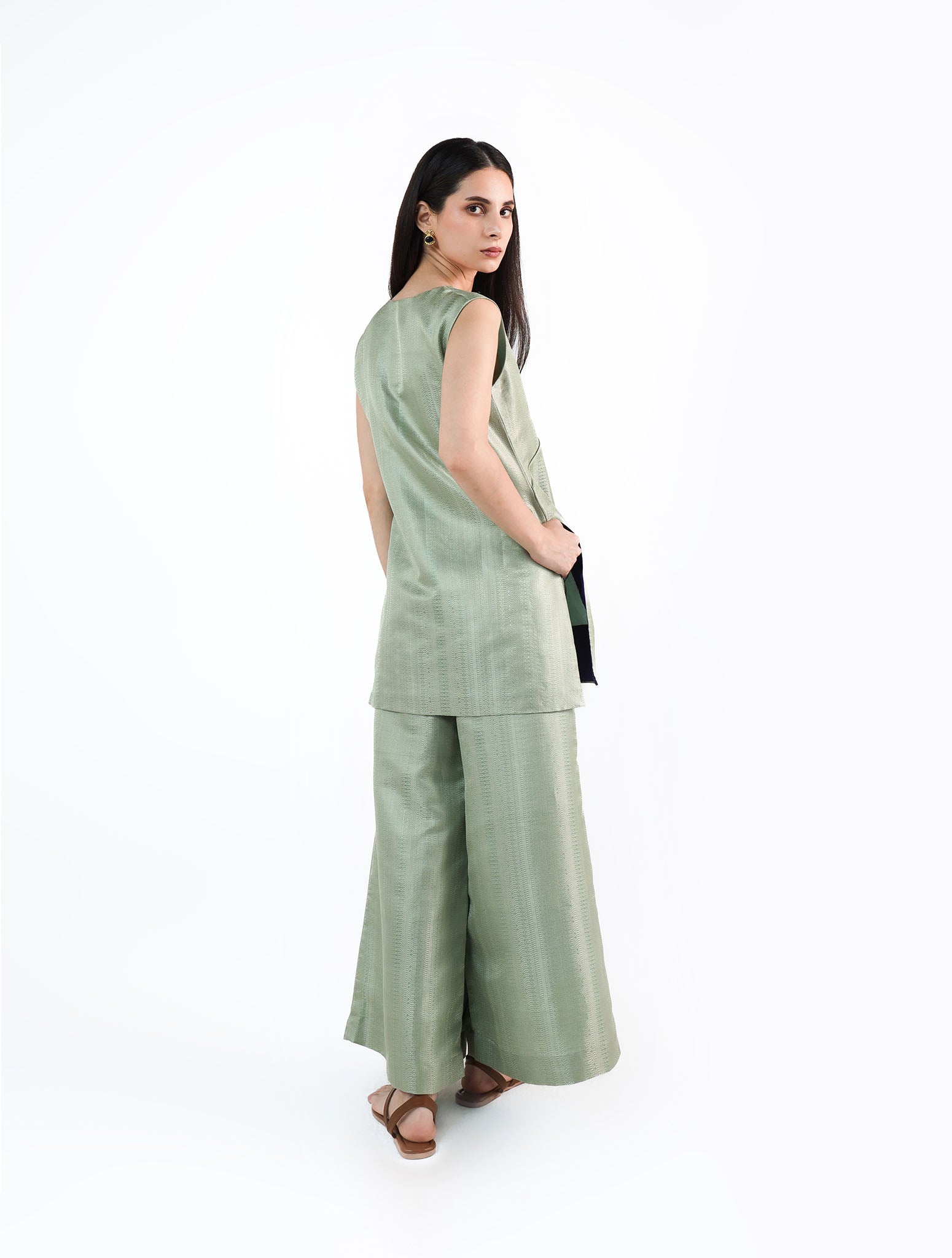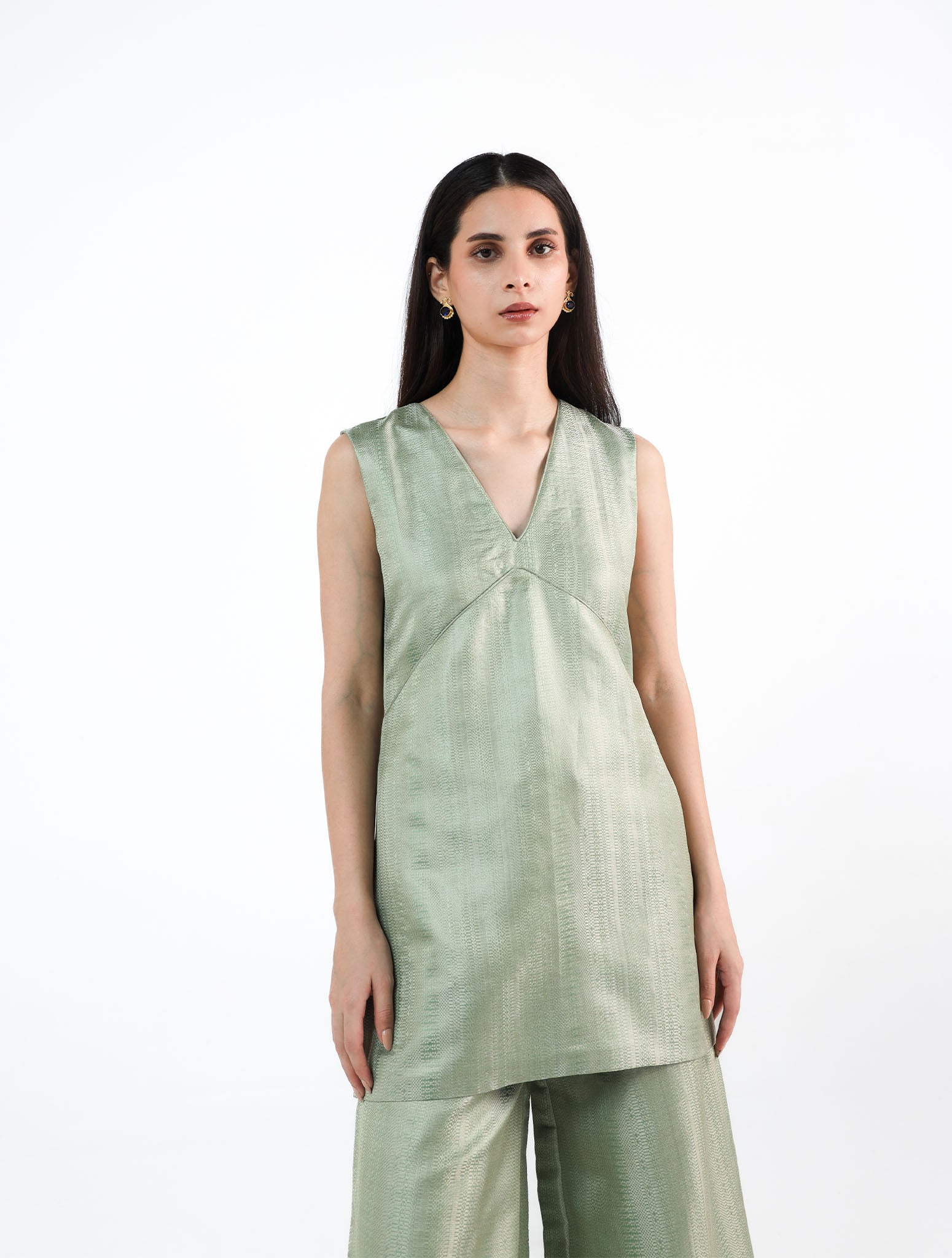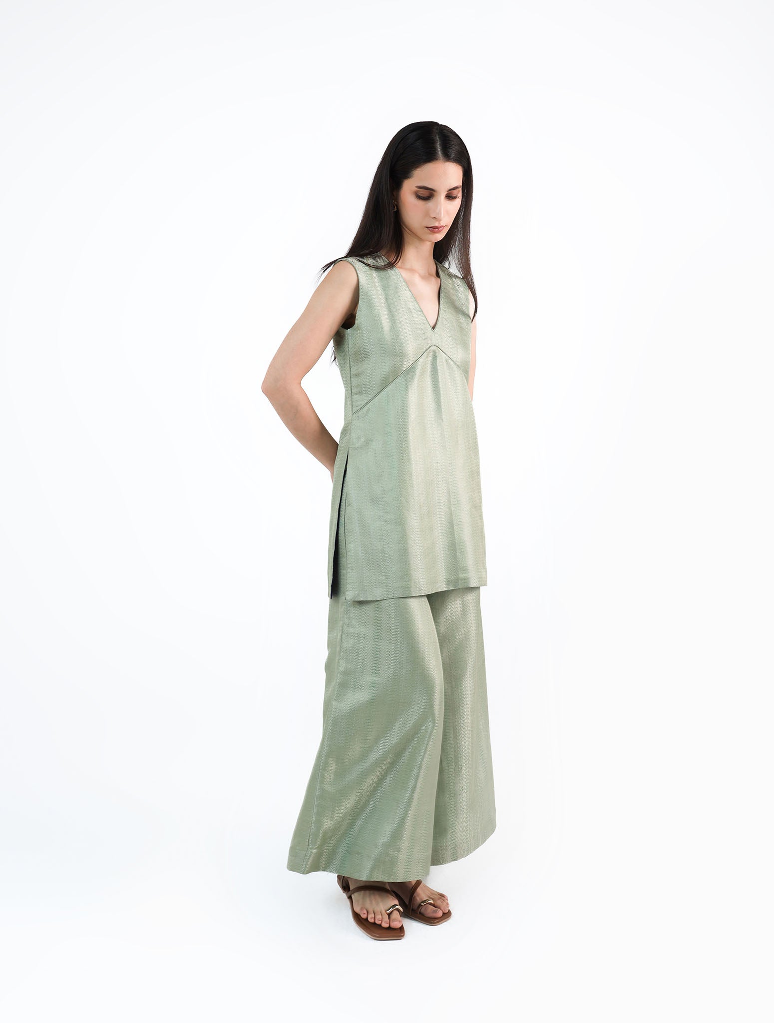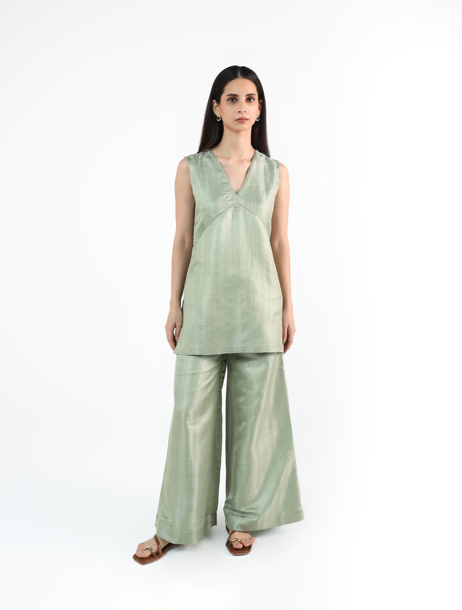 Crafted from Handwoven Silk Brocade in misty teal, this sleeveless A-line top features a deep V-neck with rounded patti detailing.Paired with relaxed wide-leg trousers, the ensemble is minimal in form yet fluid in movement. As each piece is handwoven, slight variations in texture and weave are natural, adding to its unique character.