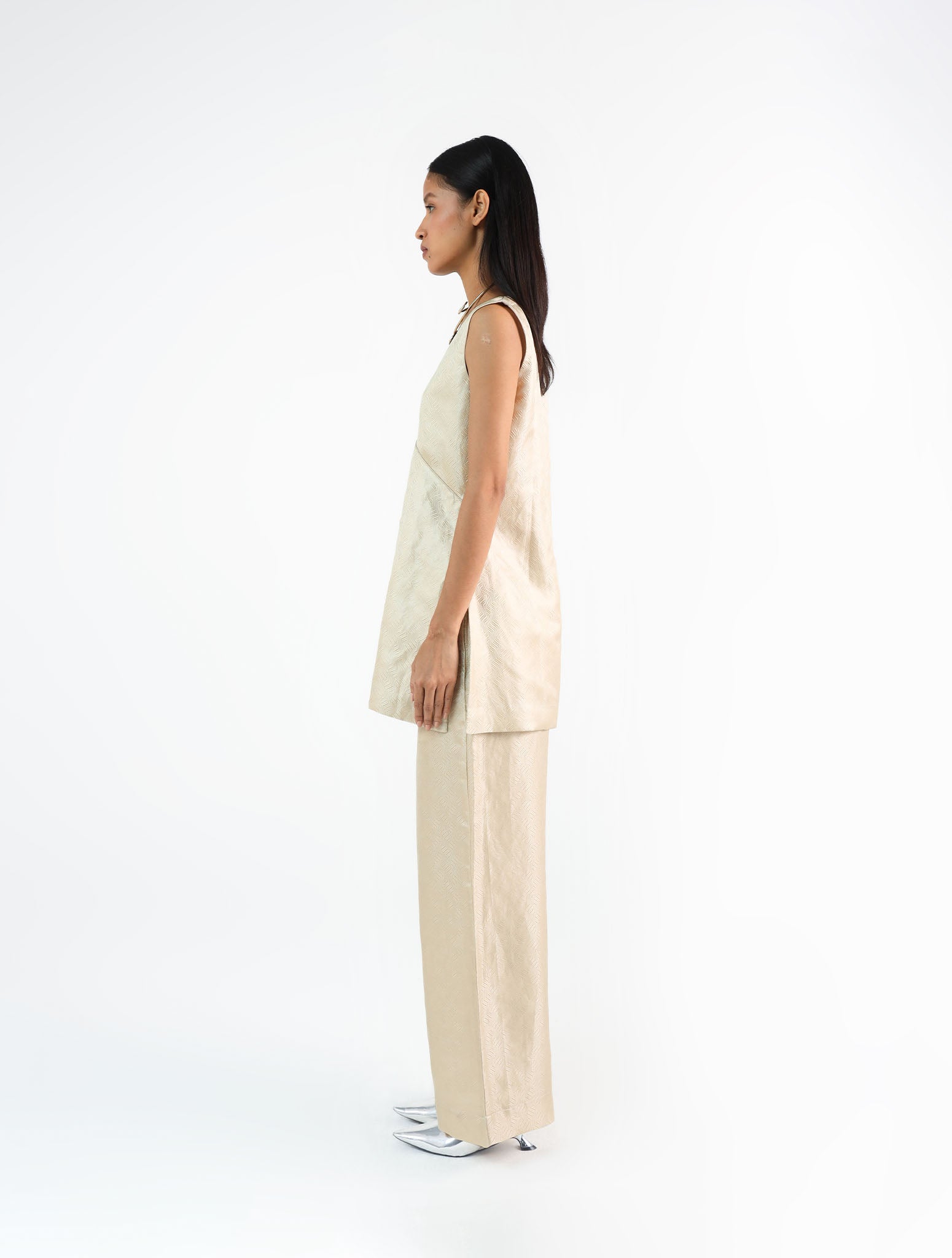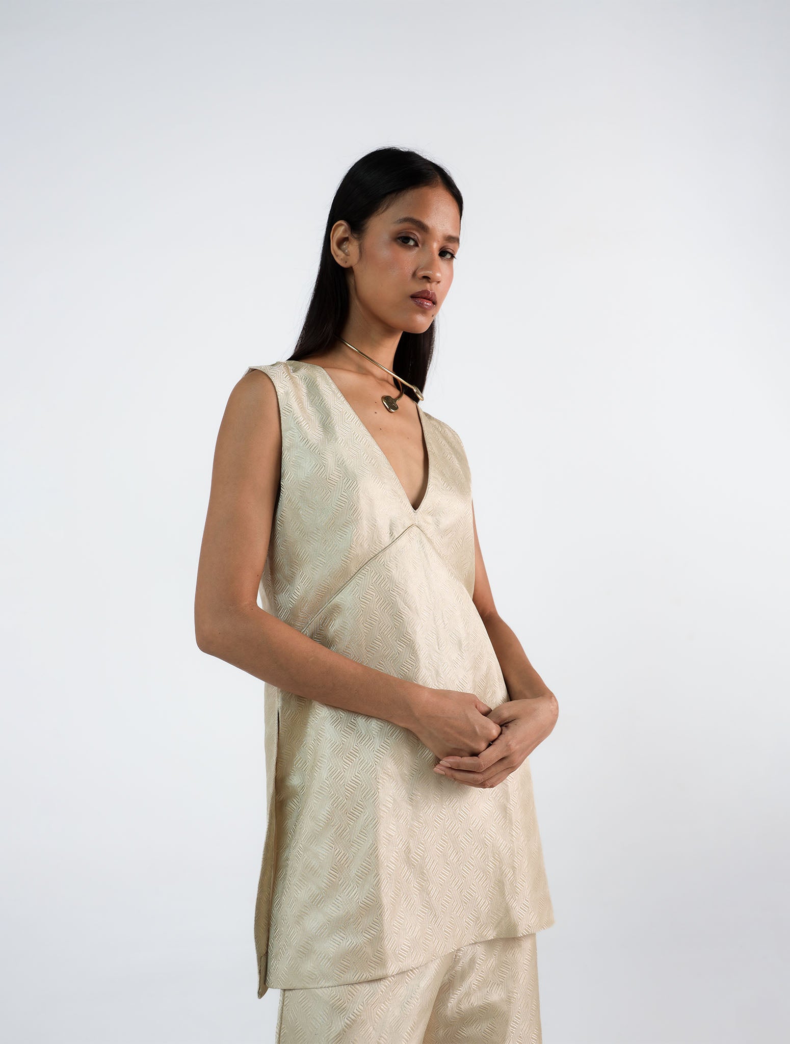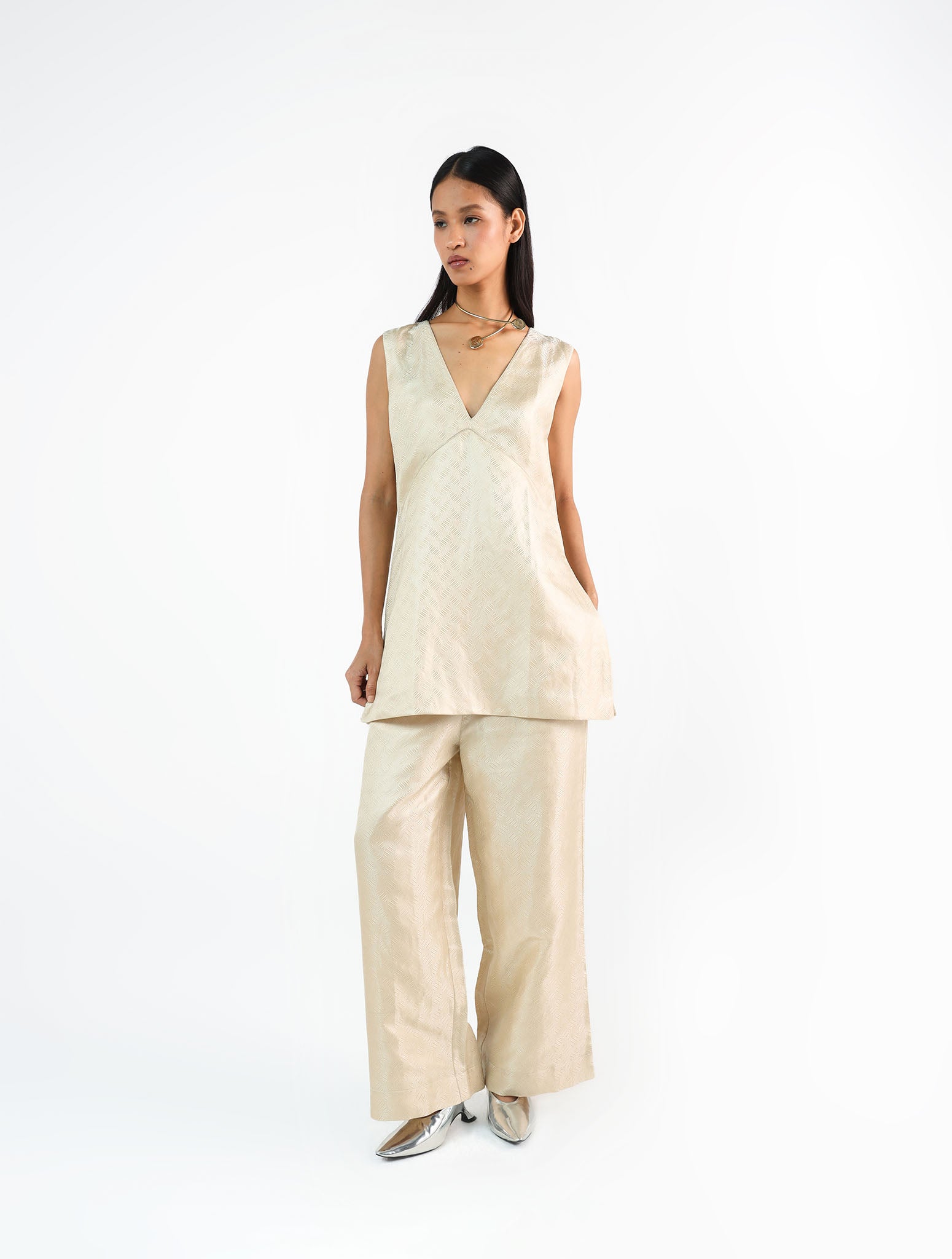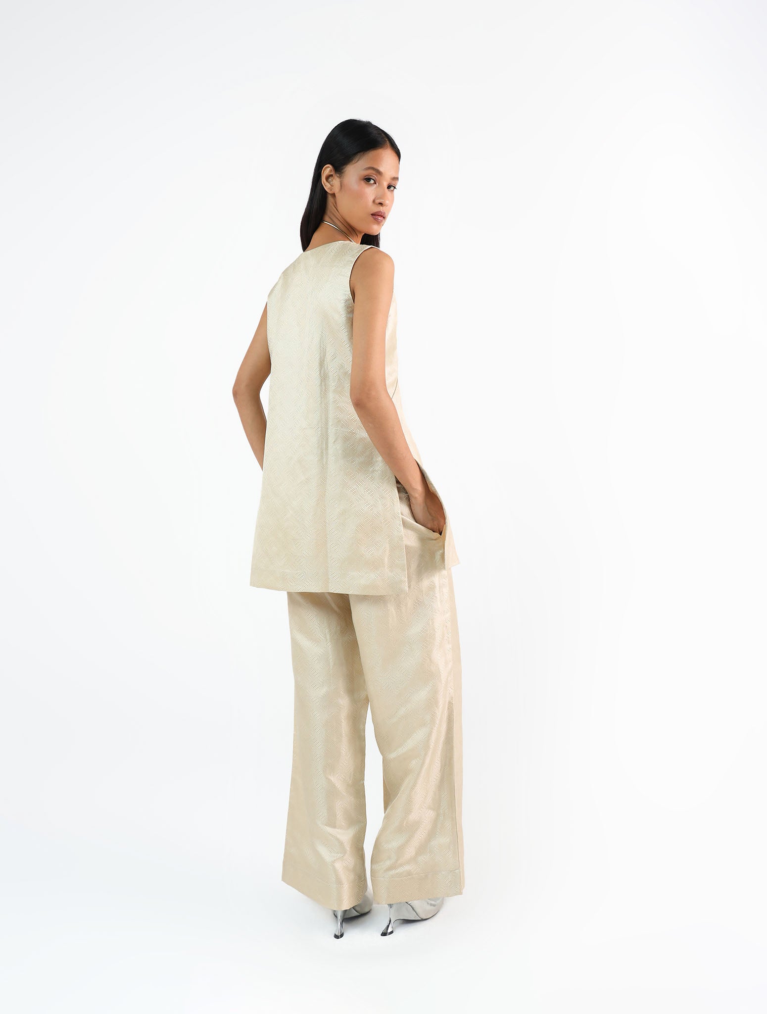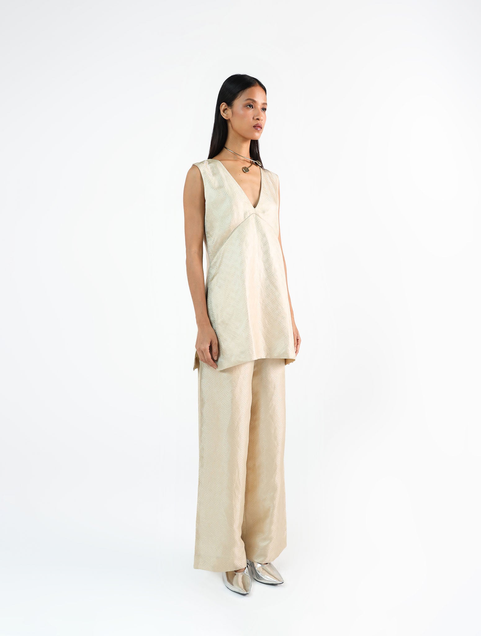 Crafted from Handwoven Silk Brocade in soft white tones, this sleeveless A-line top features a deep V-neck with rounded patti detailing. Paired with relaxed wide-leg trousers, the ensemble is minimal in form yet fluid in movement. As each piece is handwoven, slight variations in texture and weave are natural, adding to its unique character.