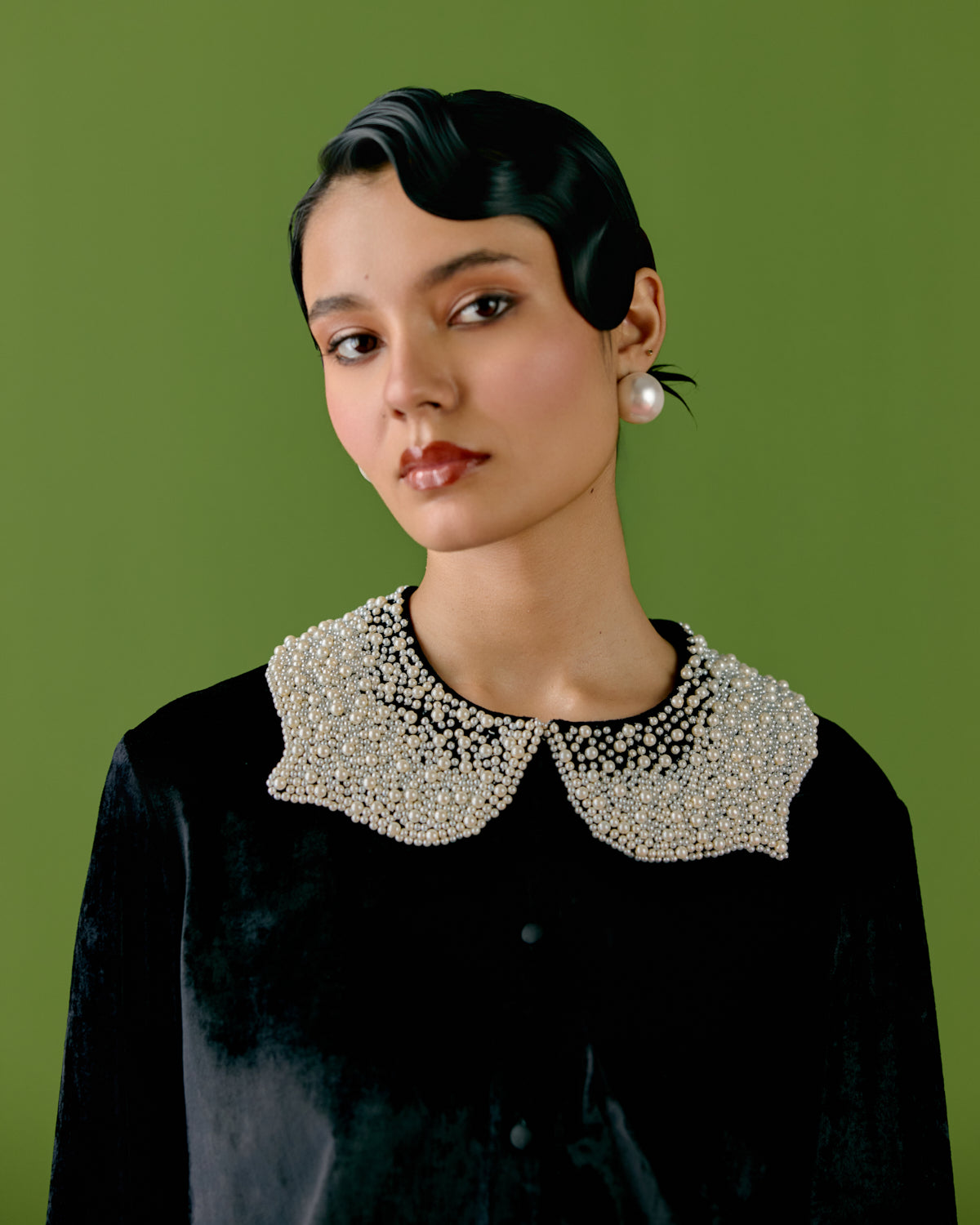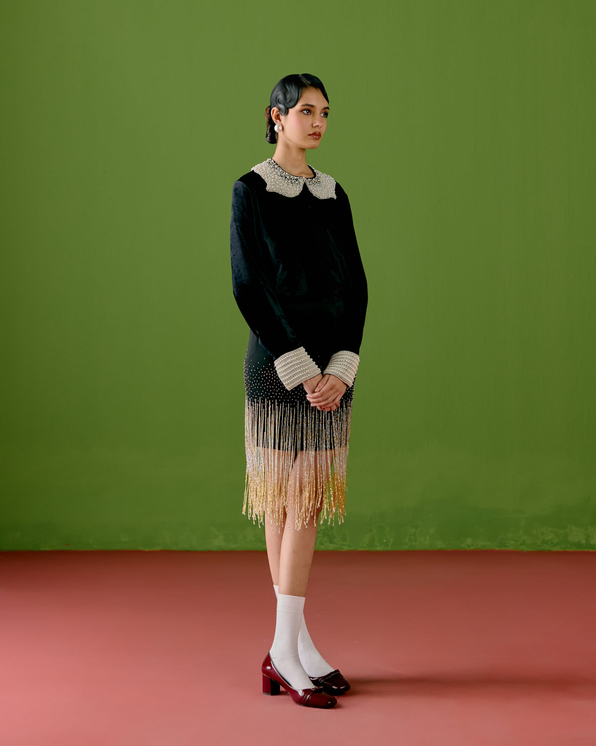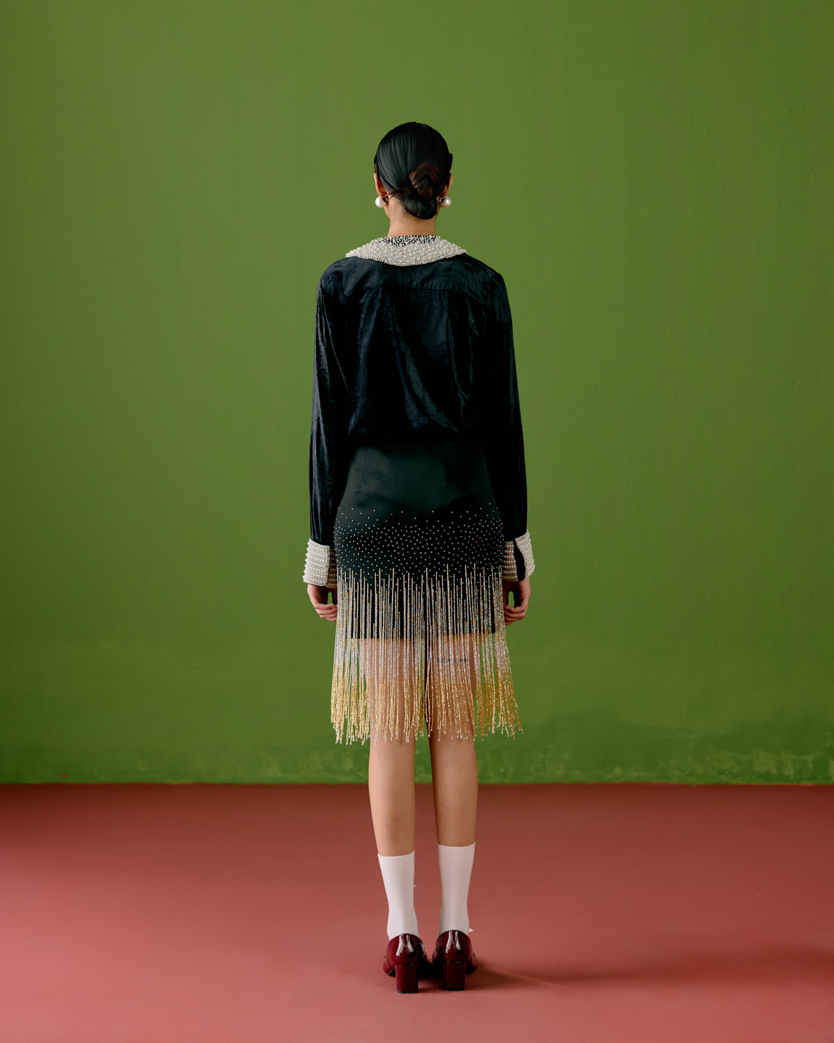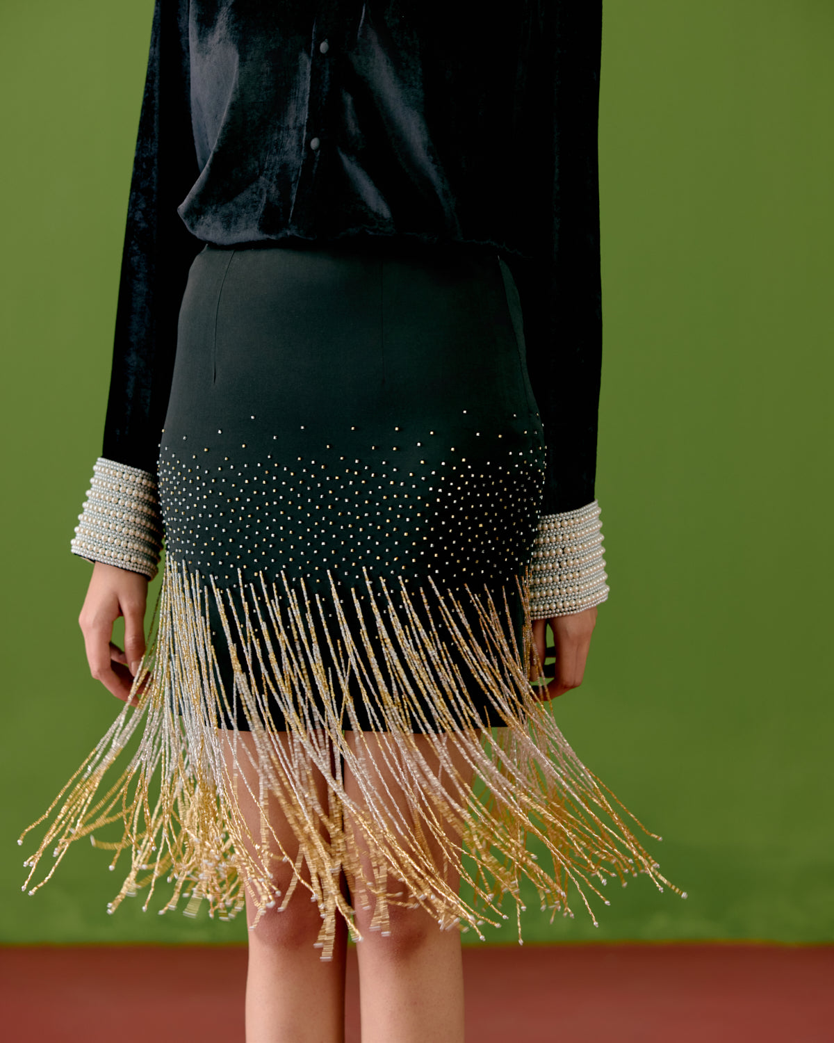 The black velvet shirt is luxuriously soft, designed with a sharp, tailored silhouette. Pearl embellishments on the collar and sleeves add a refined contrast—classic yet daring—echoing the opulence of 1920s soirées. The shirt pairs seamlessly with the fitted skirt, which is elevated with beautiful sequined tassels that sway with every step, creating movement, rhythm, and undeniable impact. All pieces are made by hand, celebrating handwoven fabrics and hand made, hence there might be some irregularities from piece to piece.