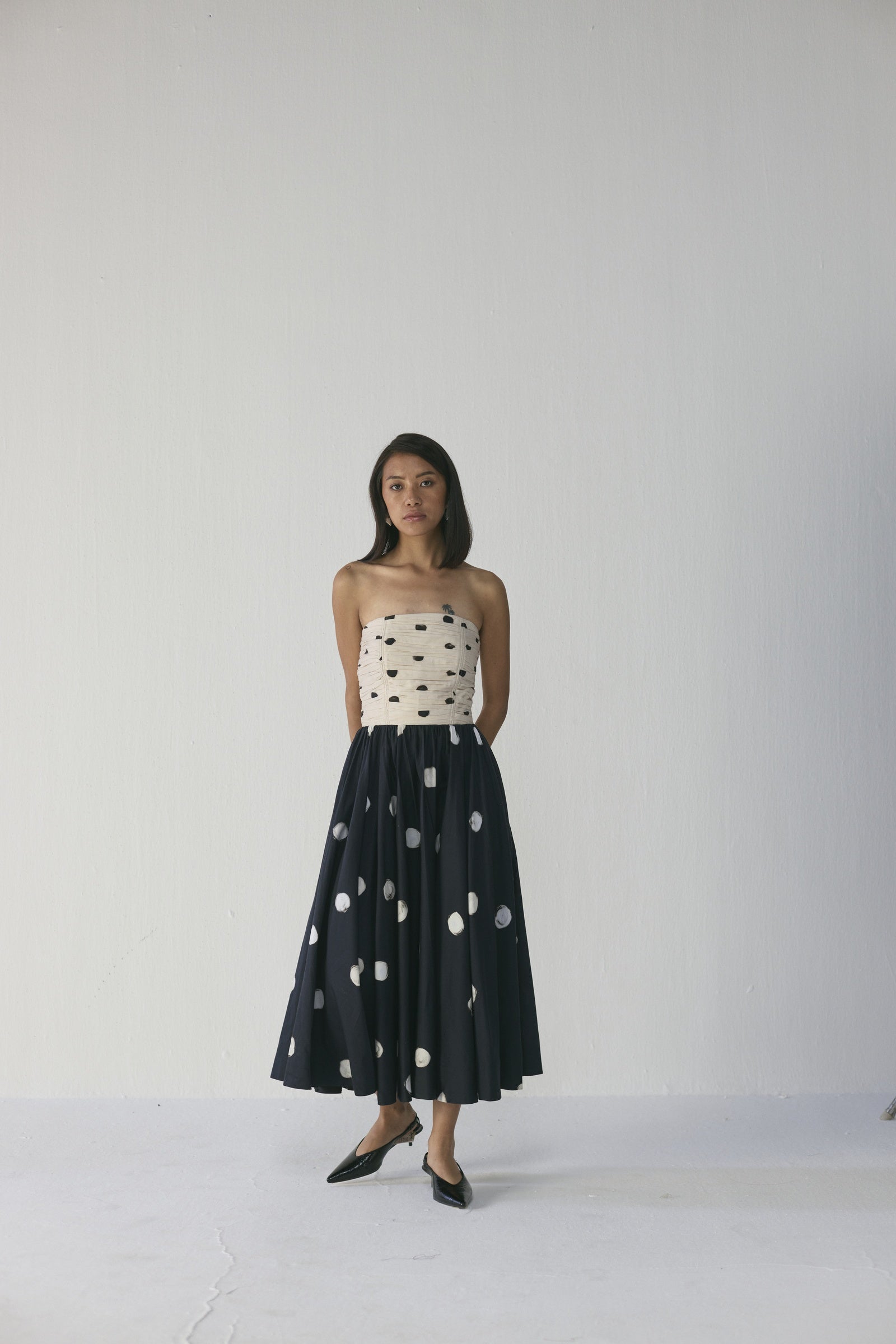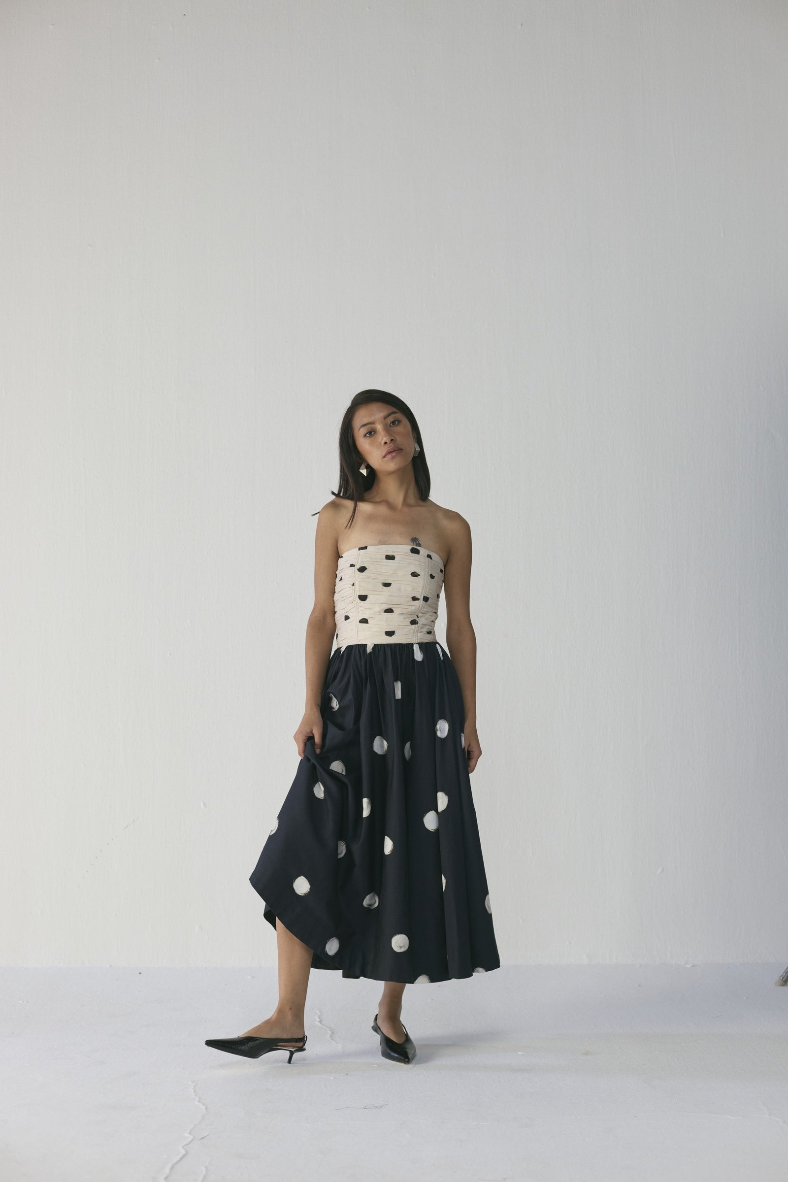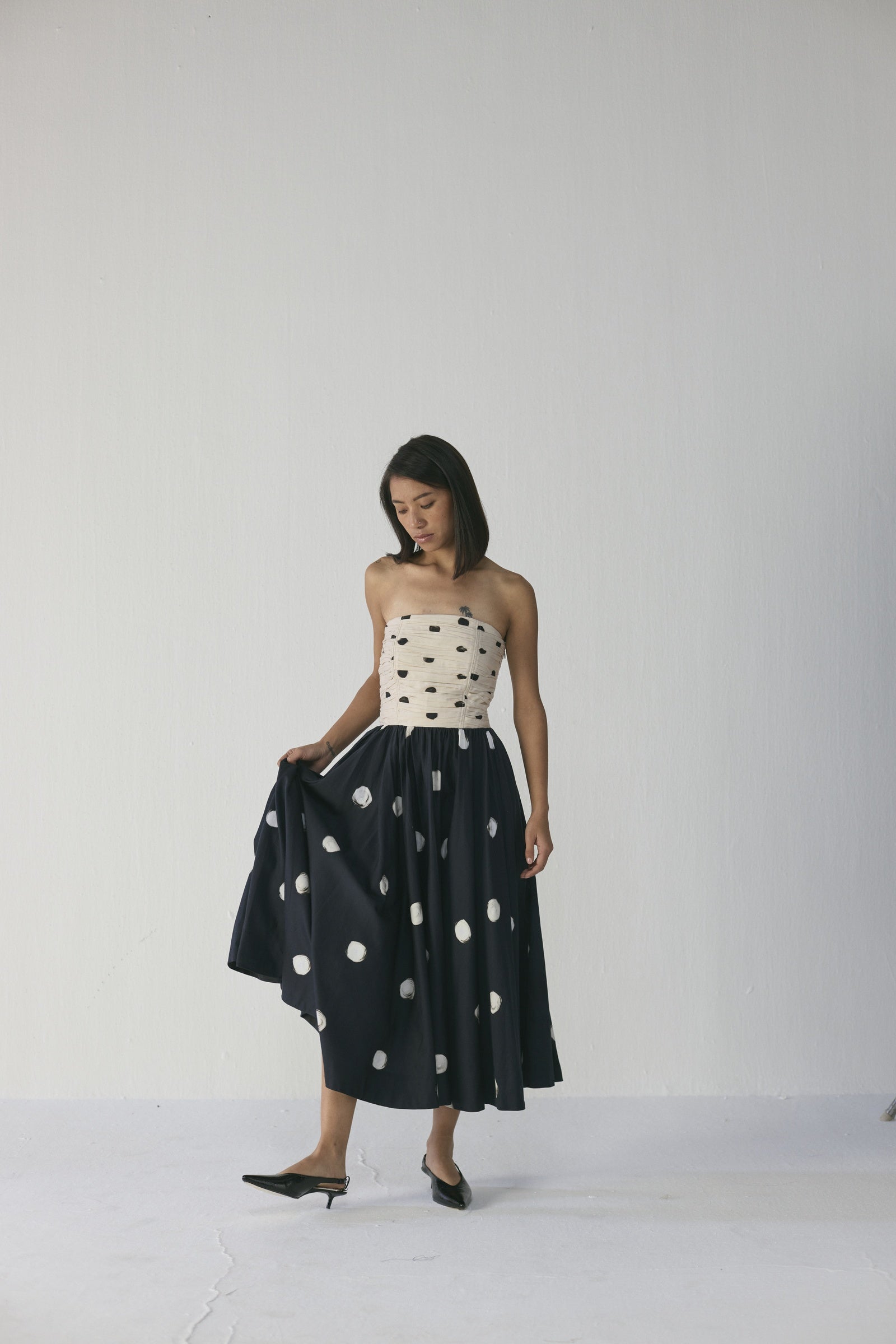 This strapless mixed-print midi dress features a ruched bodice adorned with irregular black brushstroke-style dots on a soft neutral base, flowing into a voluminous skirt decorated with larger painterly circles on a deep navy background, blending artisanal texture, movement, and contemporary elegance; crafted from lightweight, breathable fabrics, it offers a flattering, structured fit while remaining comfortable and versatile for dinner parties, gallery events, or elevated daytime outings.