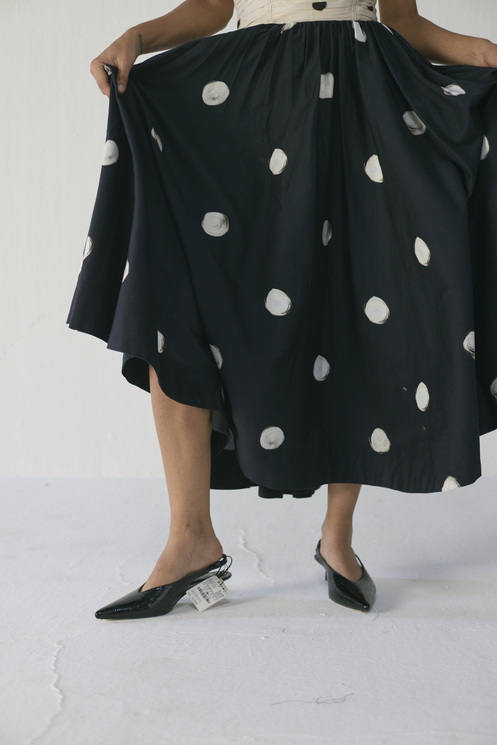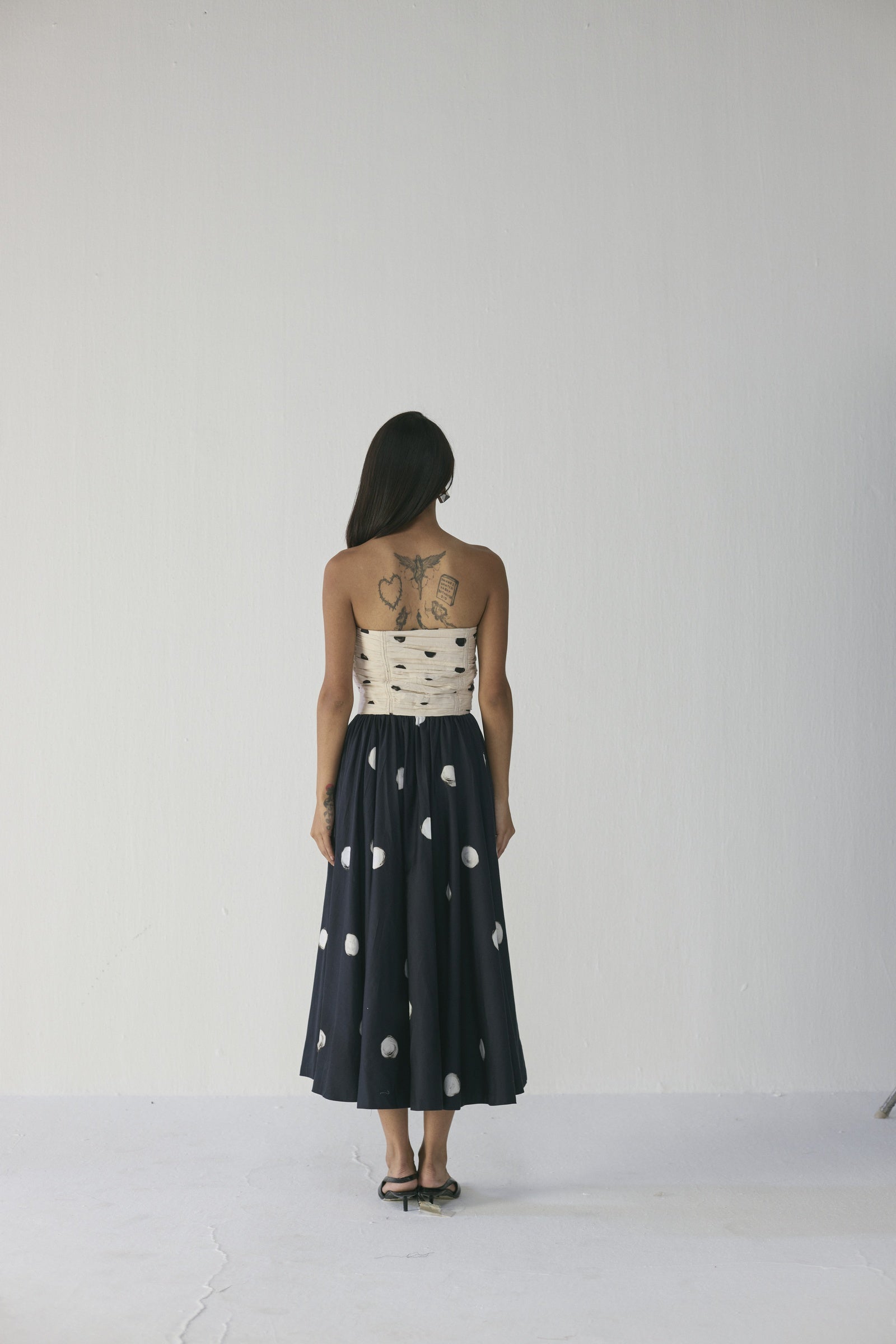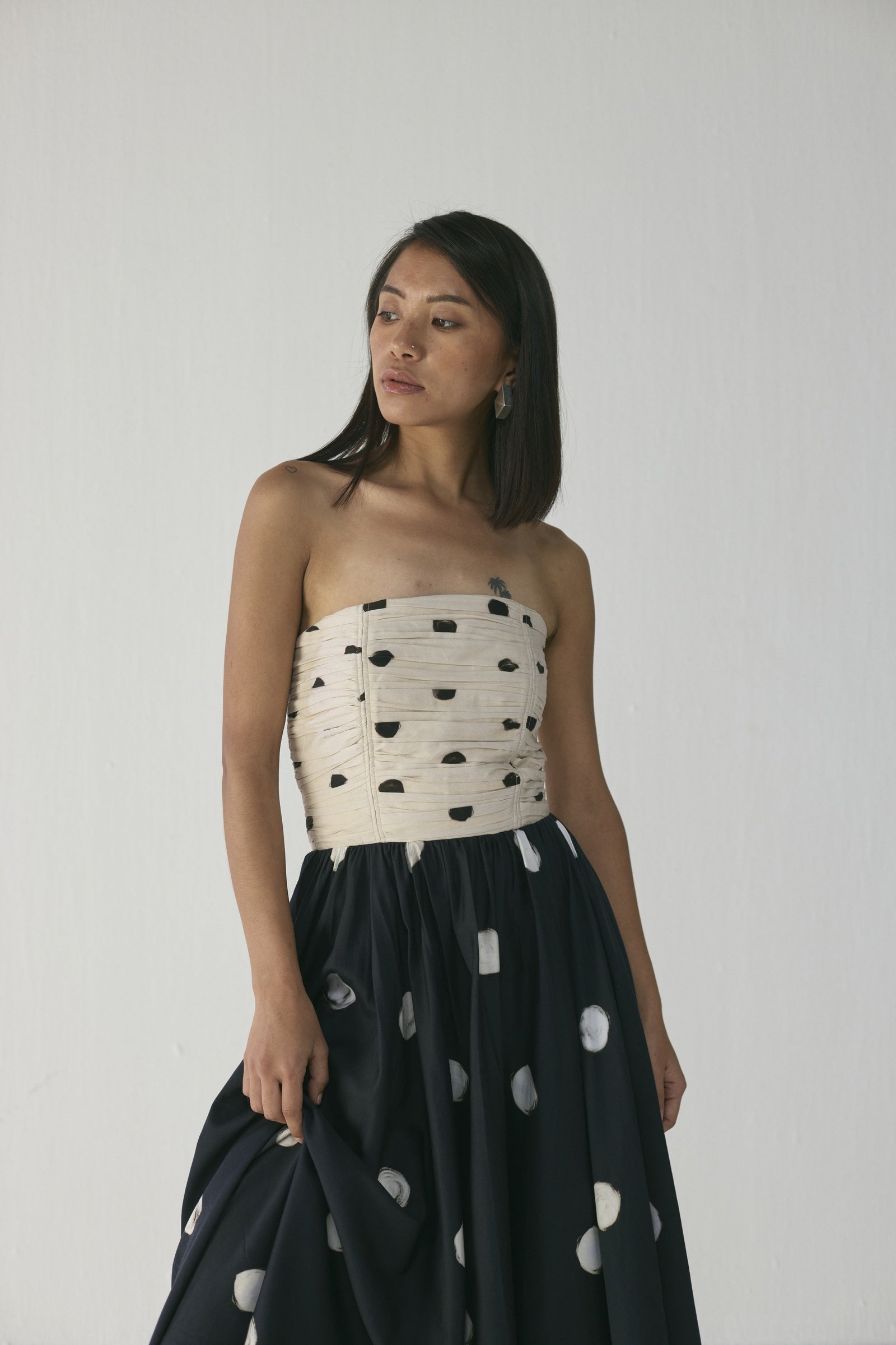 This strapless mixed-print midi dress features a ruched bodice adorned with irregular black brushstroke-style dots on a soft neutral base, flowing into a voluminous skirt decorated with larger painterly circles on a deep navy background, blending artisanal texture, movement, and contemporary elegance; crafted from lightweight, breathable fabrics, it offers a flattering, structured fit while remaining comfortable and versatile for dinner parties, gallery events, or elevated daytime outings.