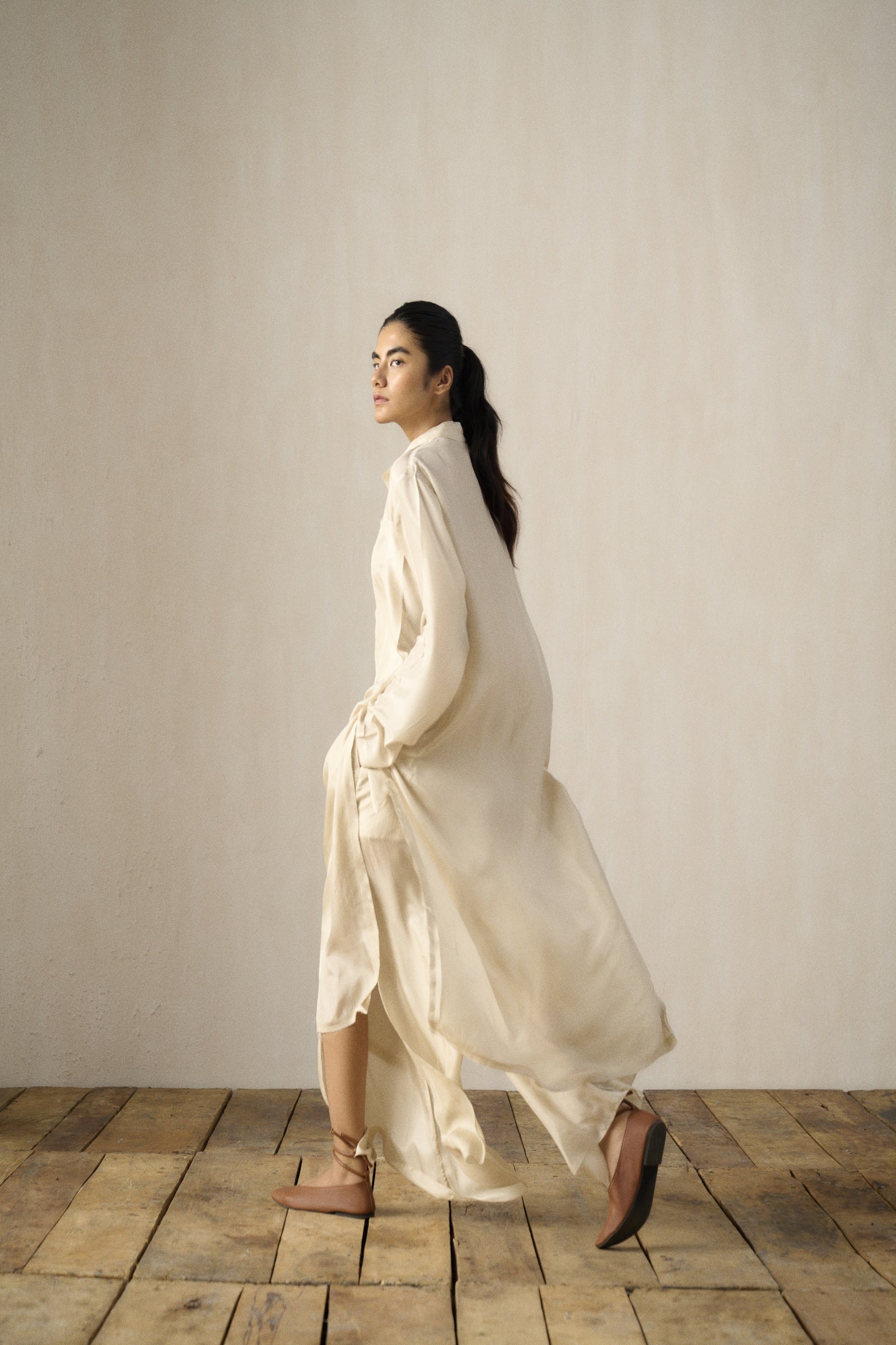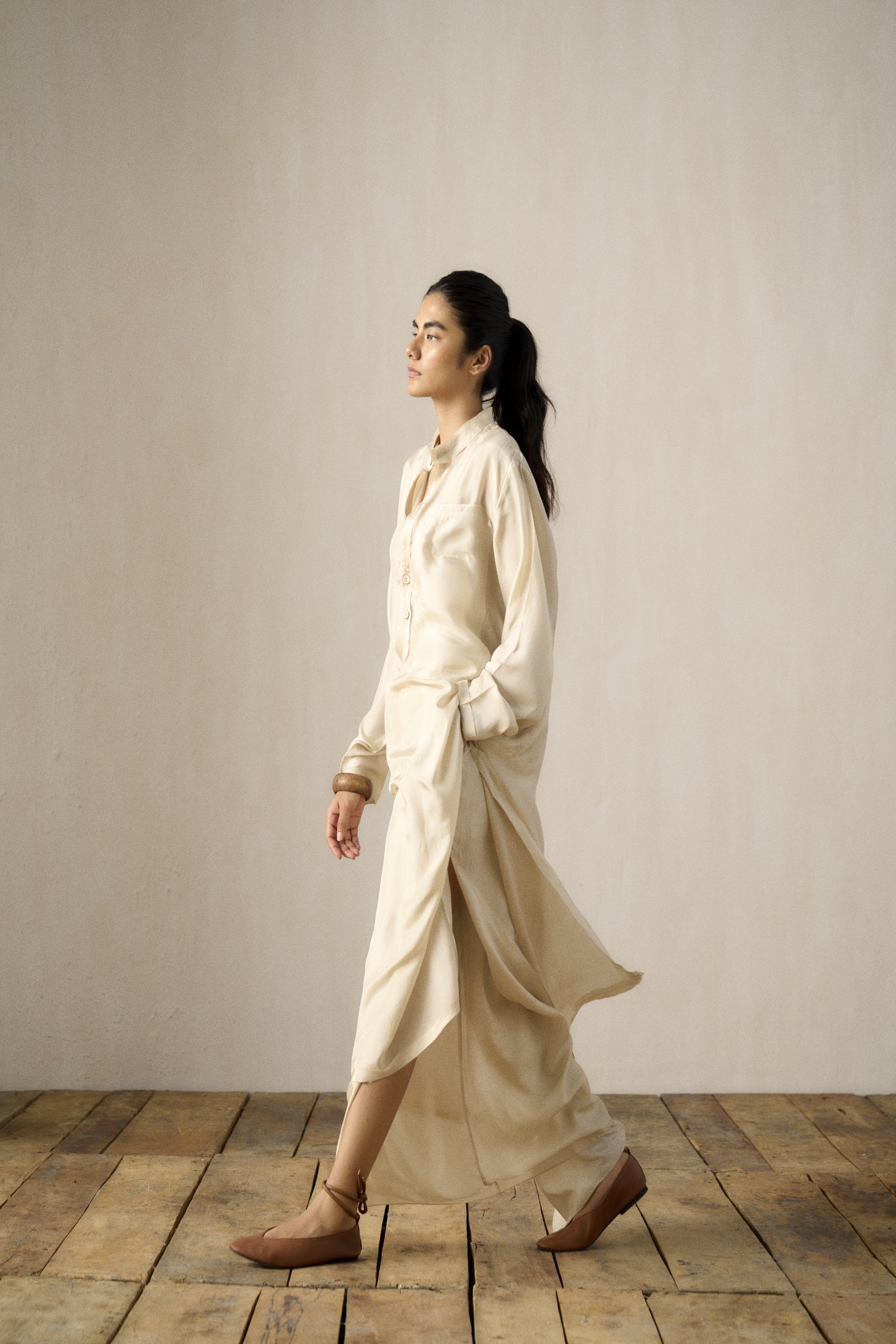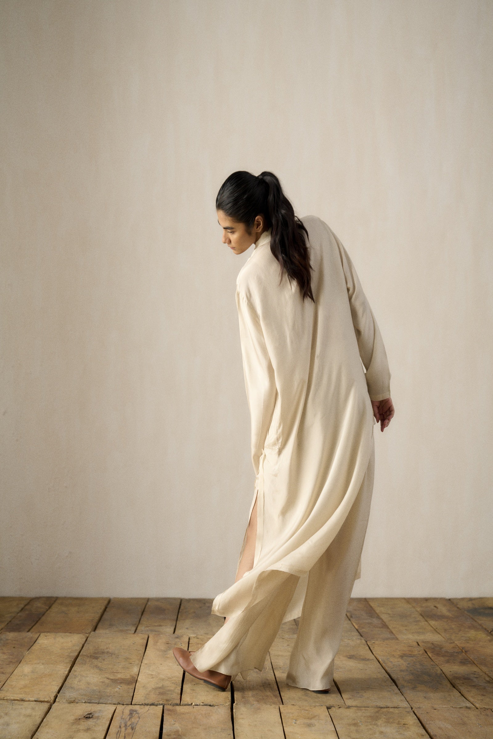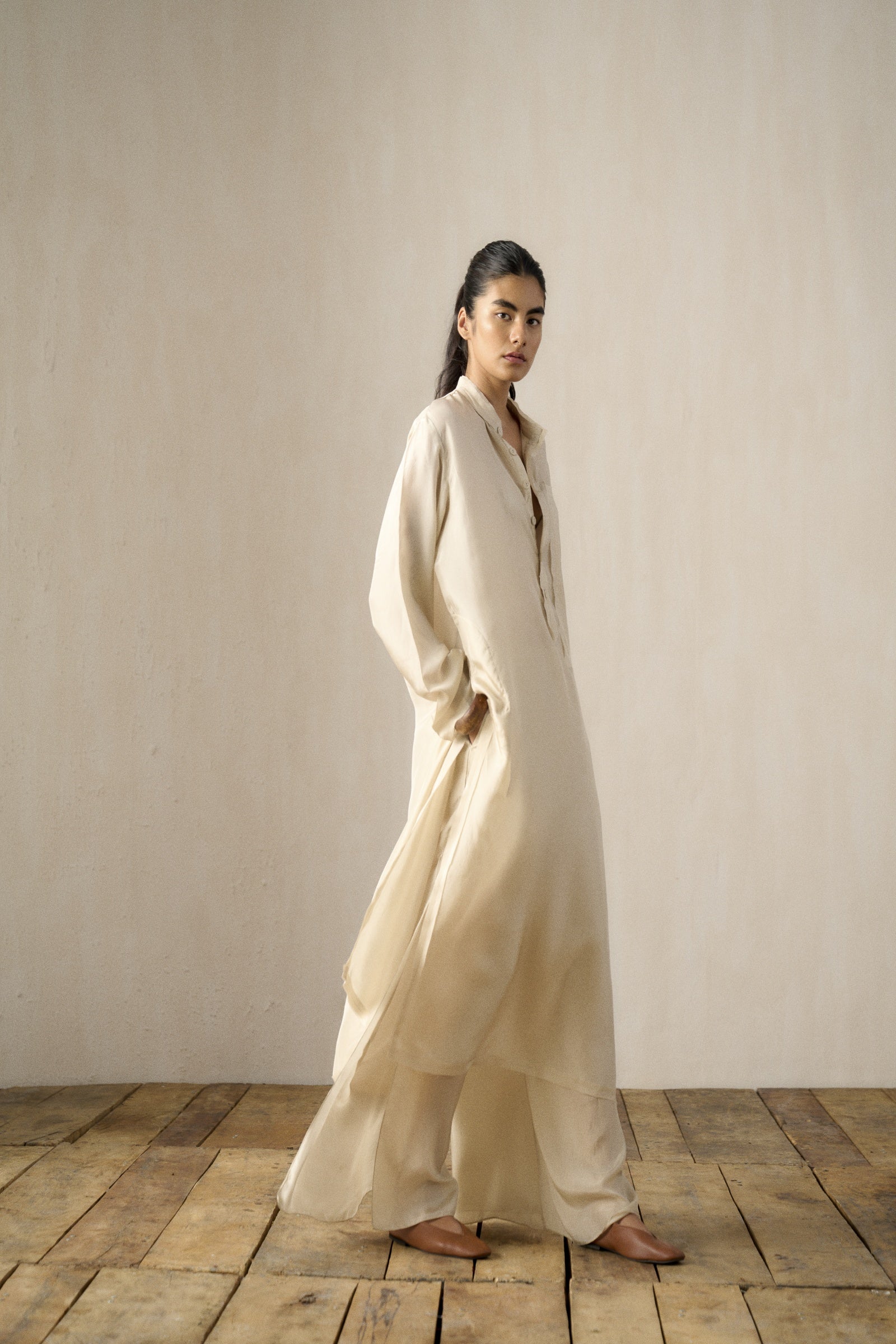 This breezy silk set brings together soft structure and flowing grace. The high-slit kurta with artisanal detailing is paired with flared pants, offering ease of movement and quiet luxury. Designed for everyday elegance that dresses up or down - seamlessly moving from day into night.
