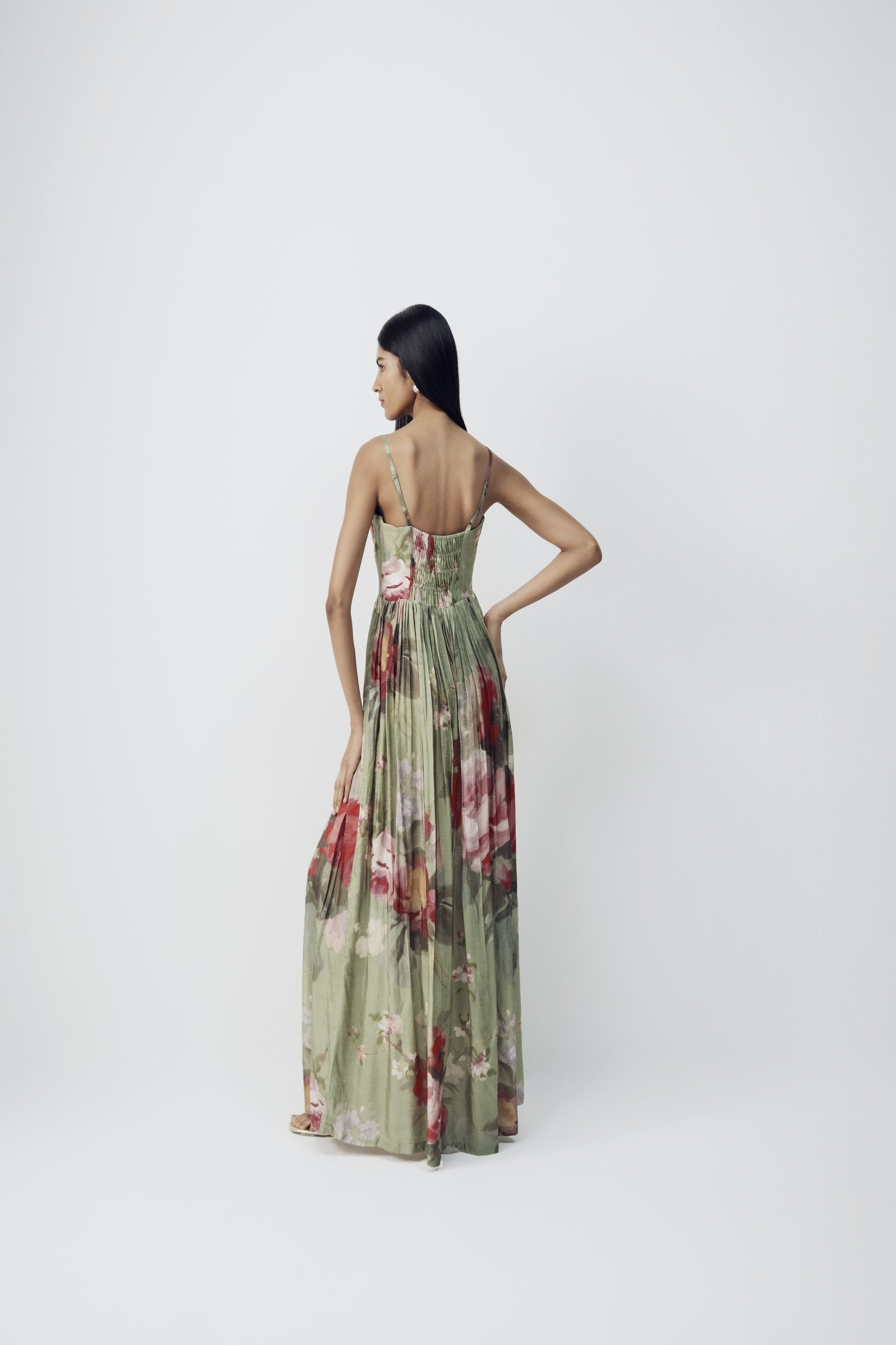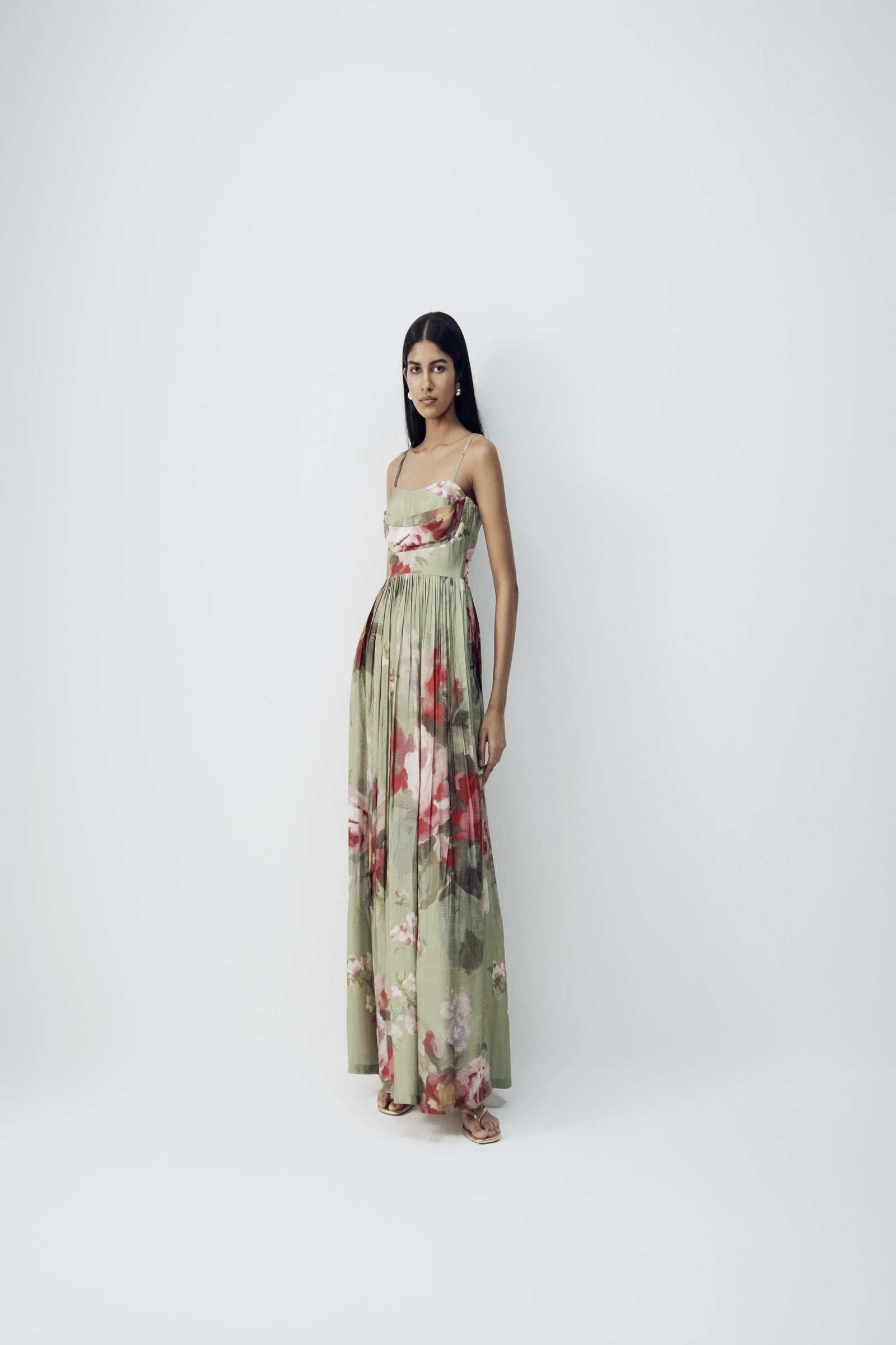 This elegant sage-green maxi dress features a striking oversized hand-painted–inspired floral print in shades of crimson, blush pink, and soft coral, designed with a delicately structured bodice, slim noodle straps, and a flowing gathered skirt with soft pleating and concealed side pockets, creating a feminine, relaxed silhouette that transitions effortlessly from daytime to evening wear; the model is 5'9" and wearing a size small.