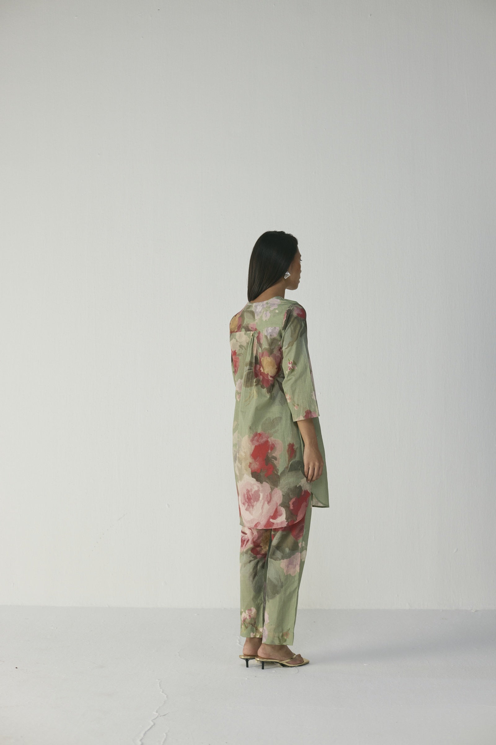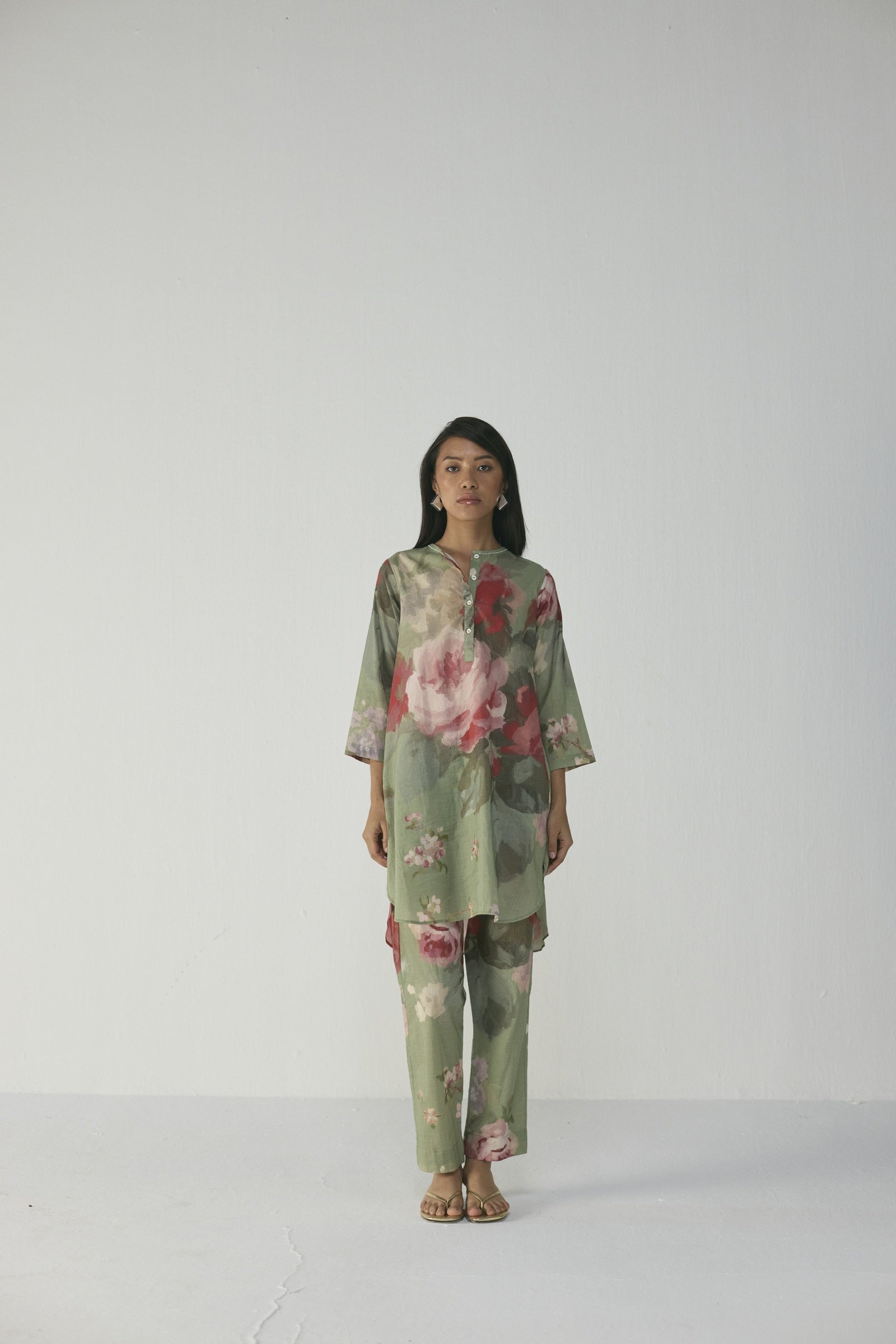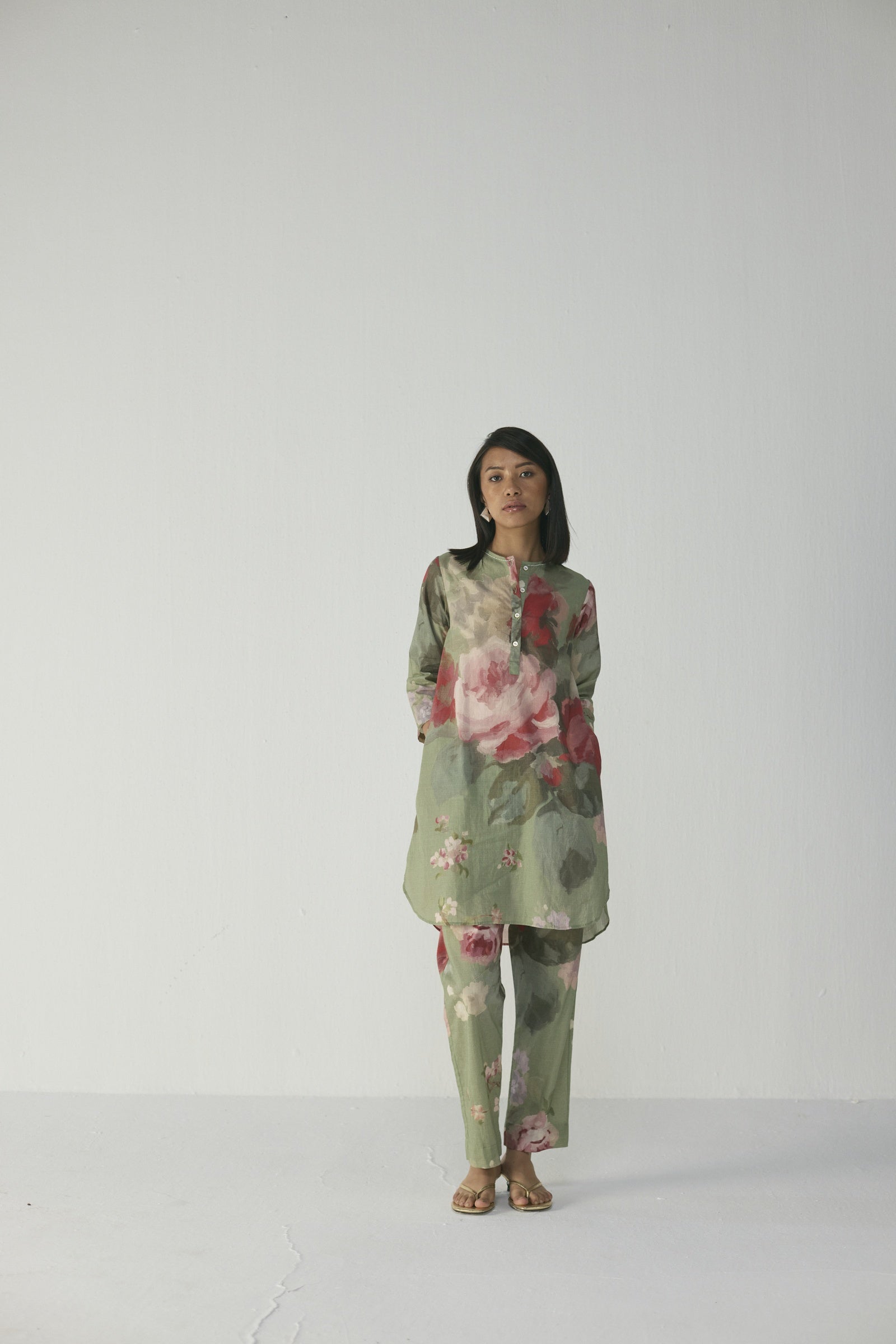 This elegant kurta set features a painterly floral print inspired by hand-painted botanicals, with soft blurred roses in blush pink, deep rose, and creamy ivory set against a calming sage-green base, crafted in a lightweight airy fabric for effortless movement; the straight-fit kurta is designed with a round neckline, hidden placket, full-length sleeves, and a graceful high-low hemline, paired with matching straight-fit trousers for a polished, cohesive look, and the model is 5'9" wearing a size small.