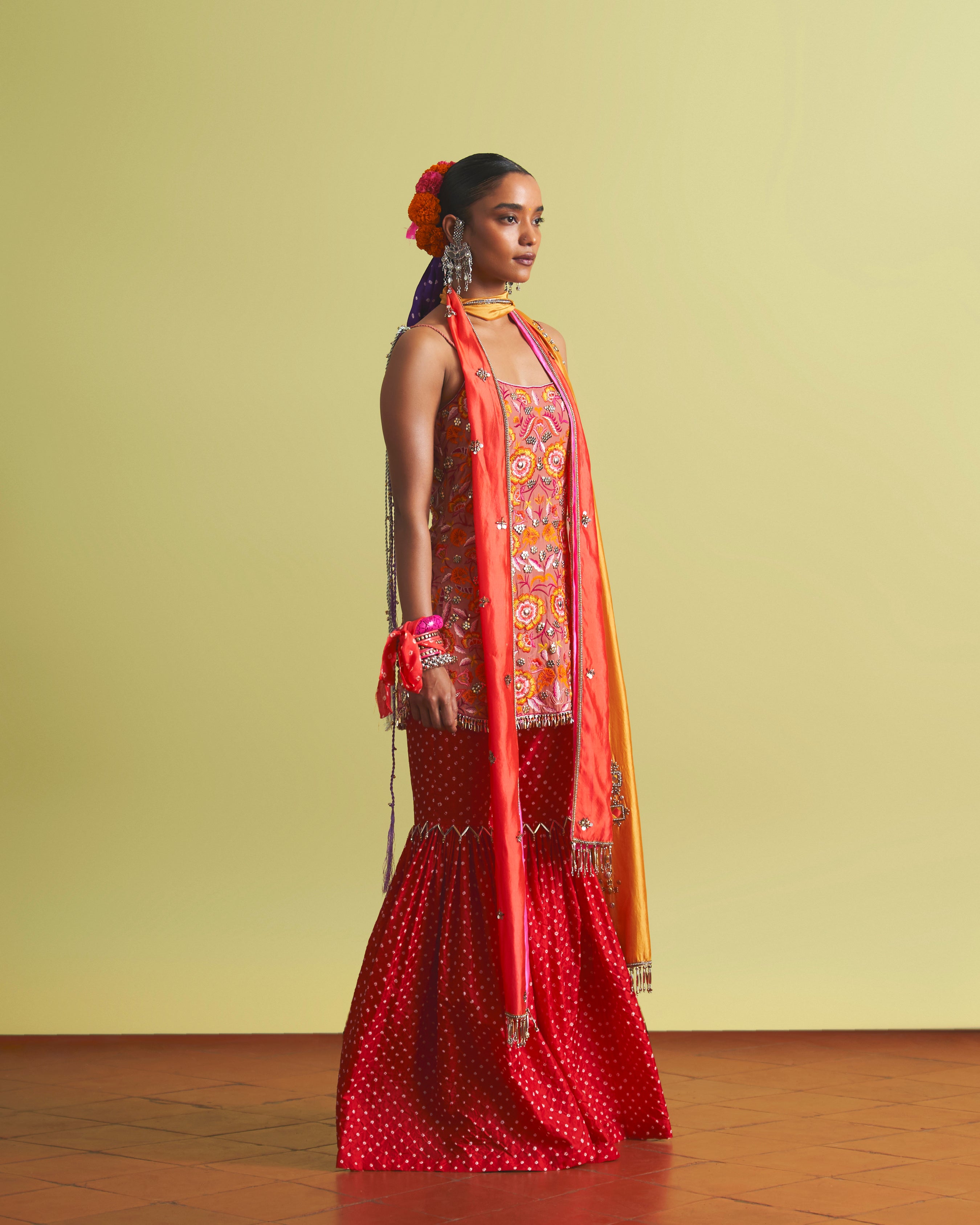This elegant three-piece ensemble features a rose pink threadwork slip crafted in luxurious crepe silk, beautifully paired with a vibrant red bandhani pant in lightweight gajji silk, and completed with your choice of either an orange or marigold stole in delicate silk organza.