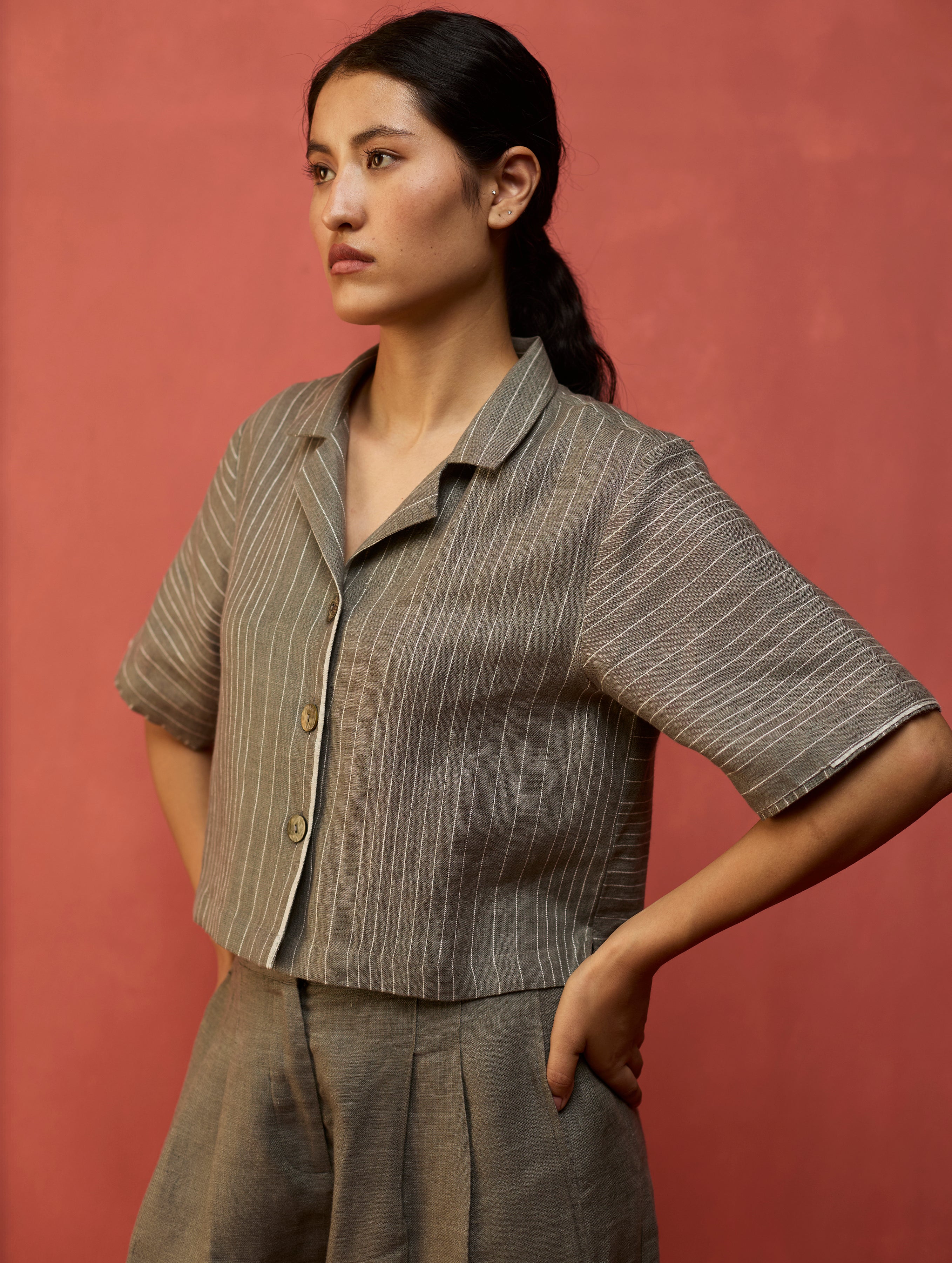 A straight cut, jacket-style top in soft yarn-dyed stripe linen, featuring an open split collar and dual flap pockets. The short sleeves and asymmetric woven pinstripe panels create a modern, architectural edge.
