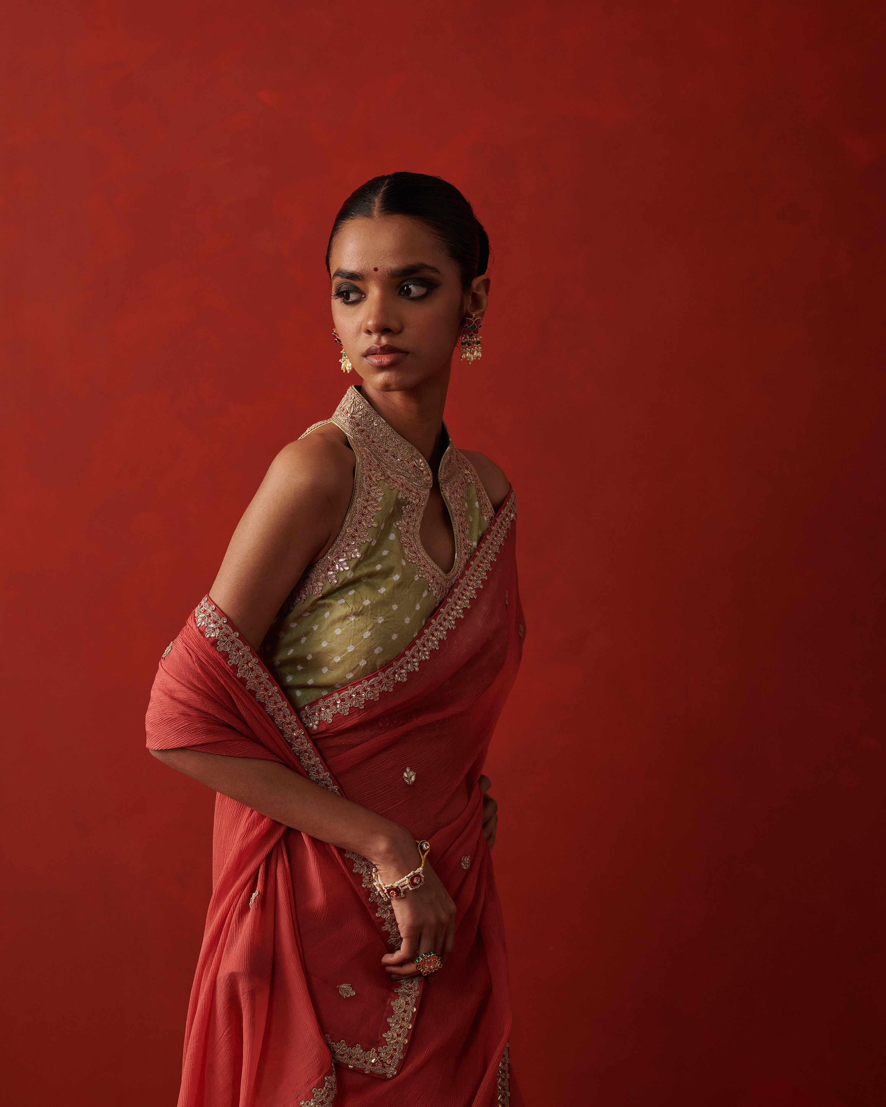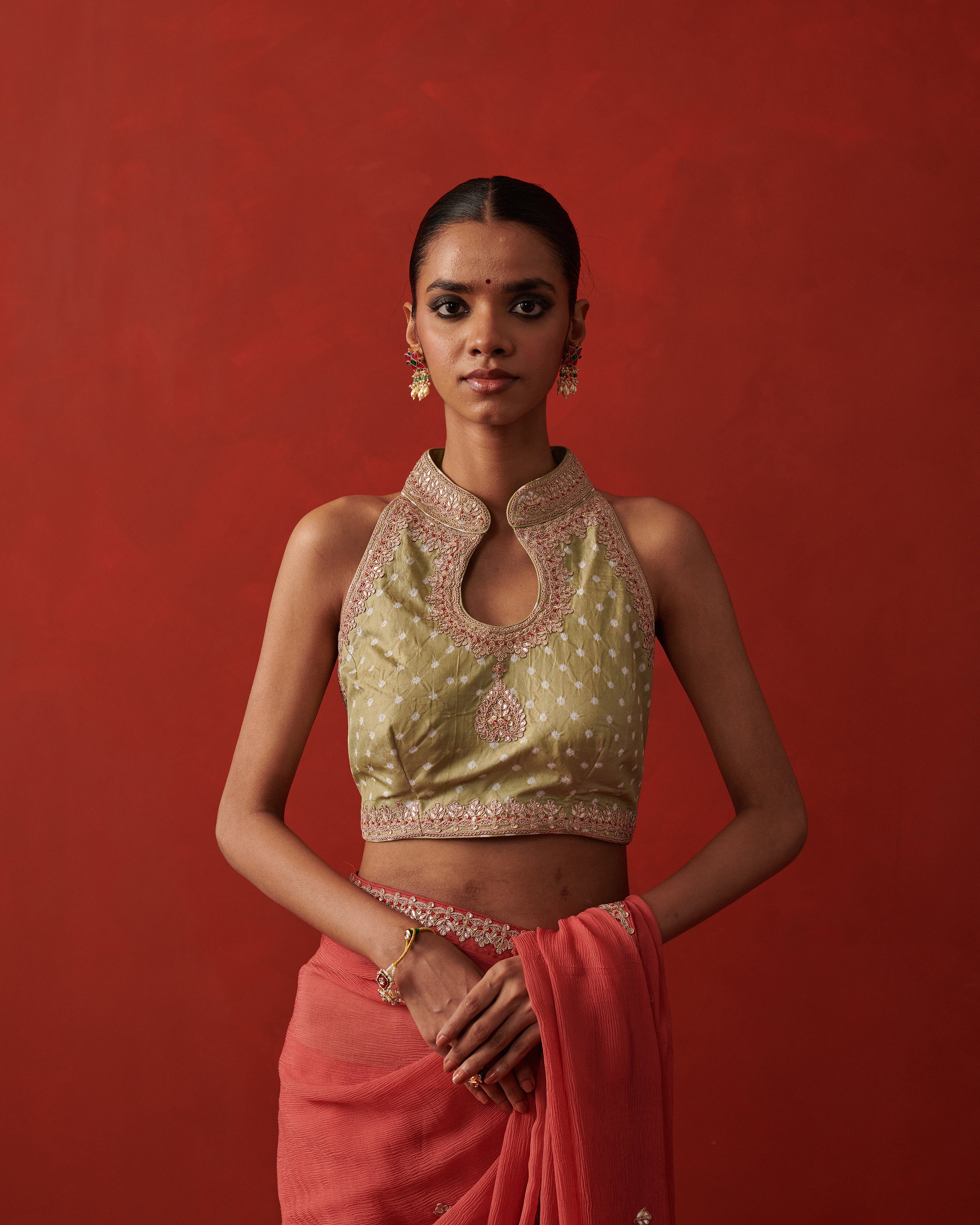 A soft pista green blouse crafted in silk bandhej, ‘Suki’ is detailed with a cutout neckline and halter back. The silhouette is edged with delicate embroidery featuring gota, marodi, and resham threadwork-meticulously placed along the neckline, hem, and back straps. A traditional Rajasthani bandhej base meets a modern cut, creating a timeless yet contemporary look.