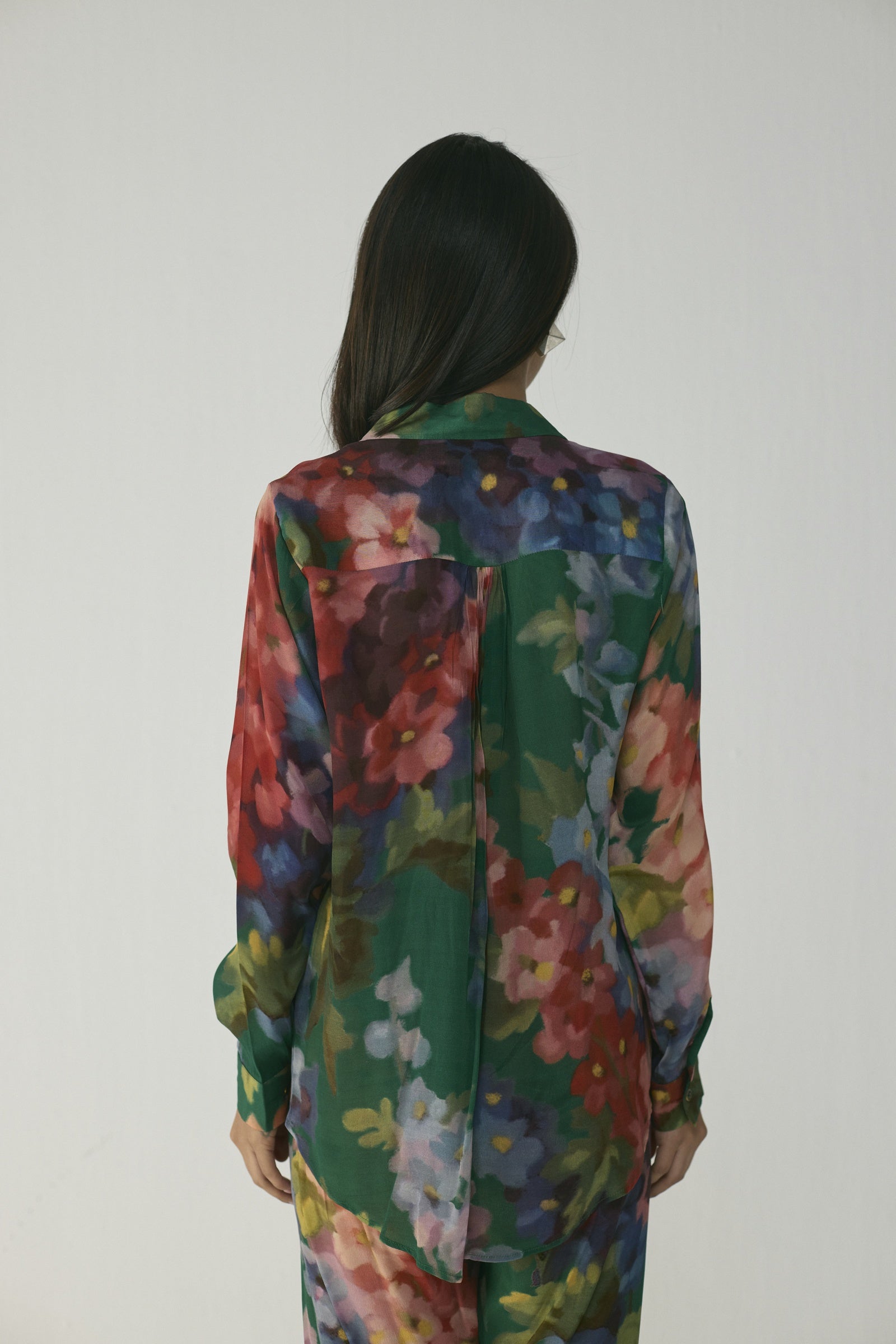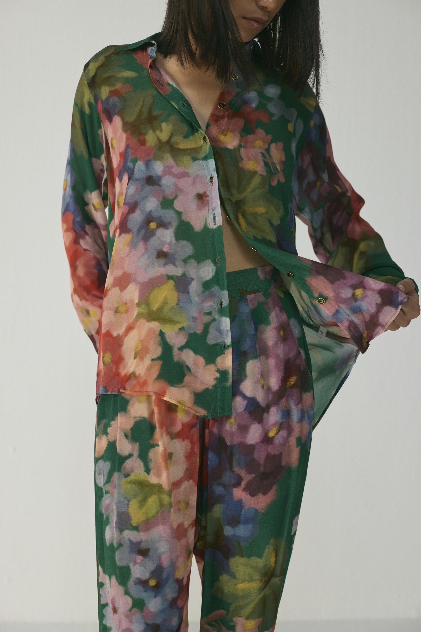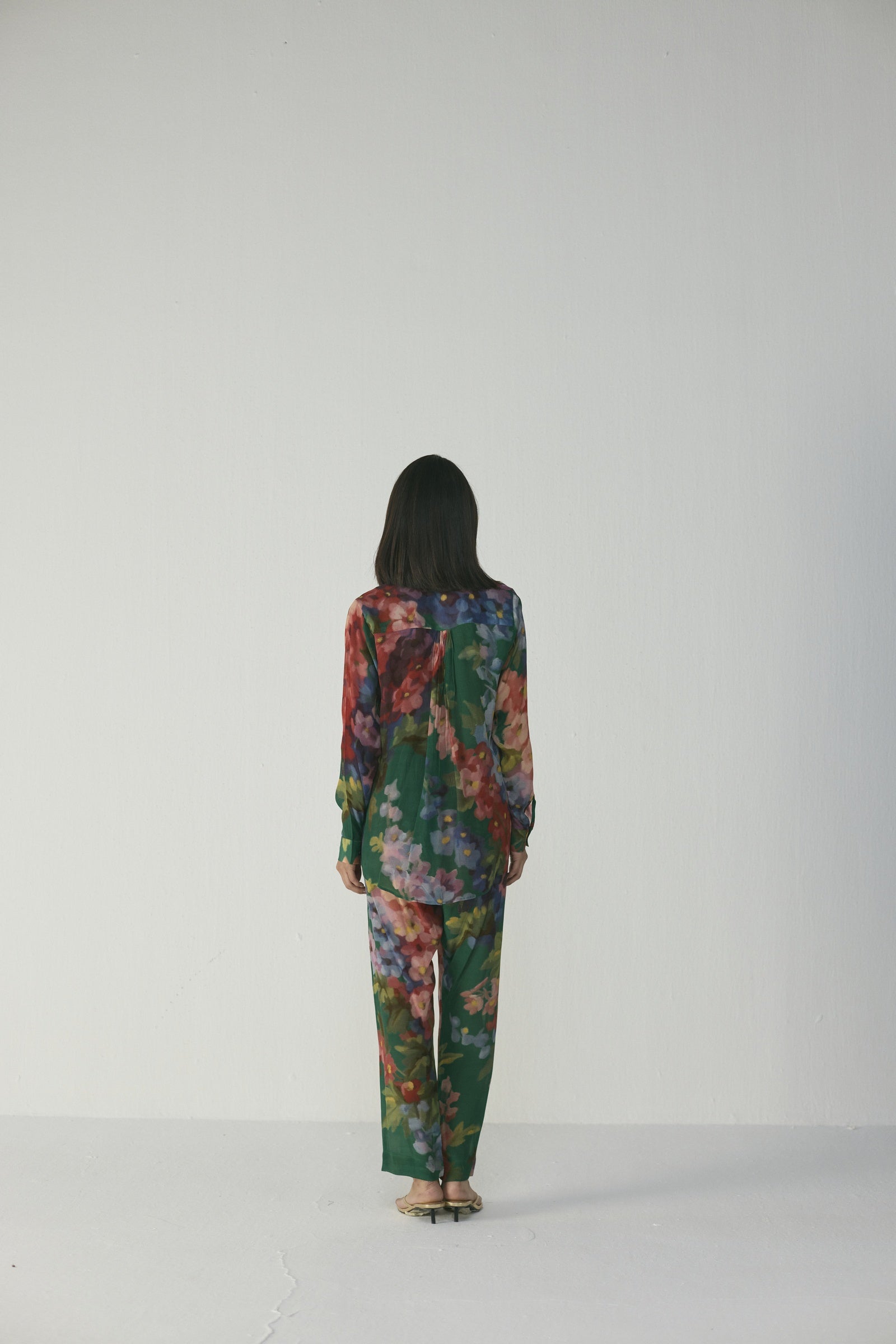 This effortlessly chic co-ord set is crafted in luxurious crepe and features a striking painterly floral print in rich jewel tones, comprising a relaxed button-down shirt with a classic collar, full sleeves, and a button placket, paired with straight-fit trousers with a comfortable waistband and side pockets, offering a fluid and refined silhouette ideal for day events, resort wear, or casual evenings, and can be styled with minimalist gold or statement earrings and strappy sandals for a chic daytime look or heeled mules and a sleek clutch for an elevated evening style, with the option to tuck in the shirt for a structured appearance or leave it untucked for effortless sophistication, as demonstrated by the model who is 5'9" and wearing a size small.