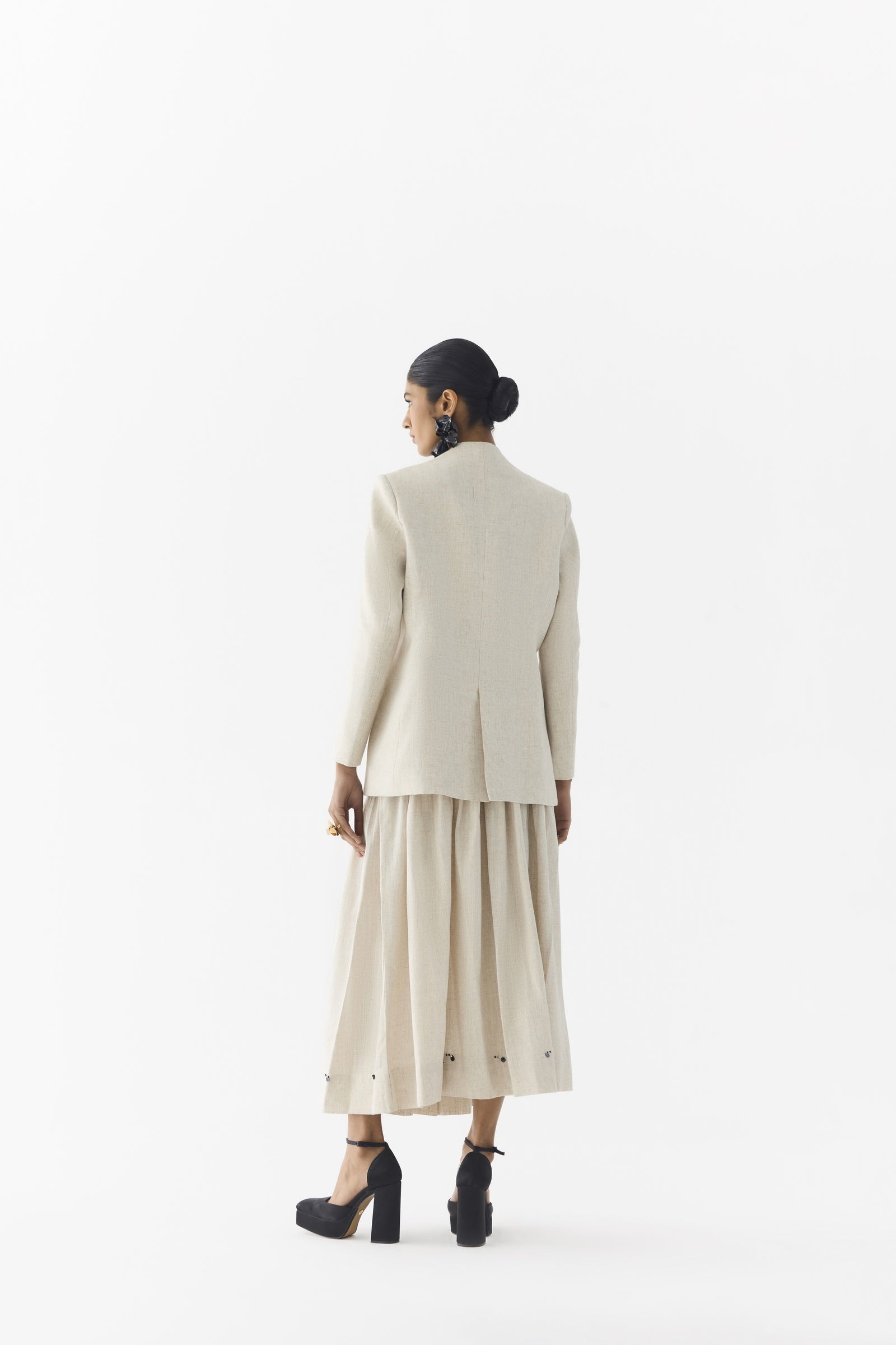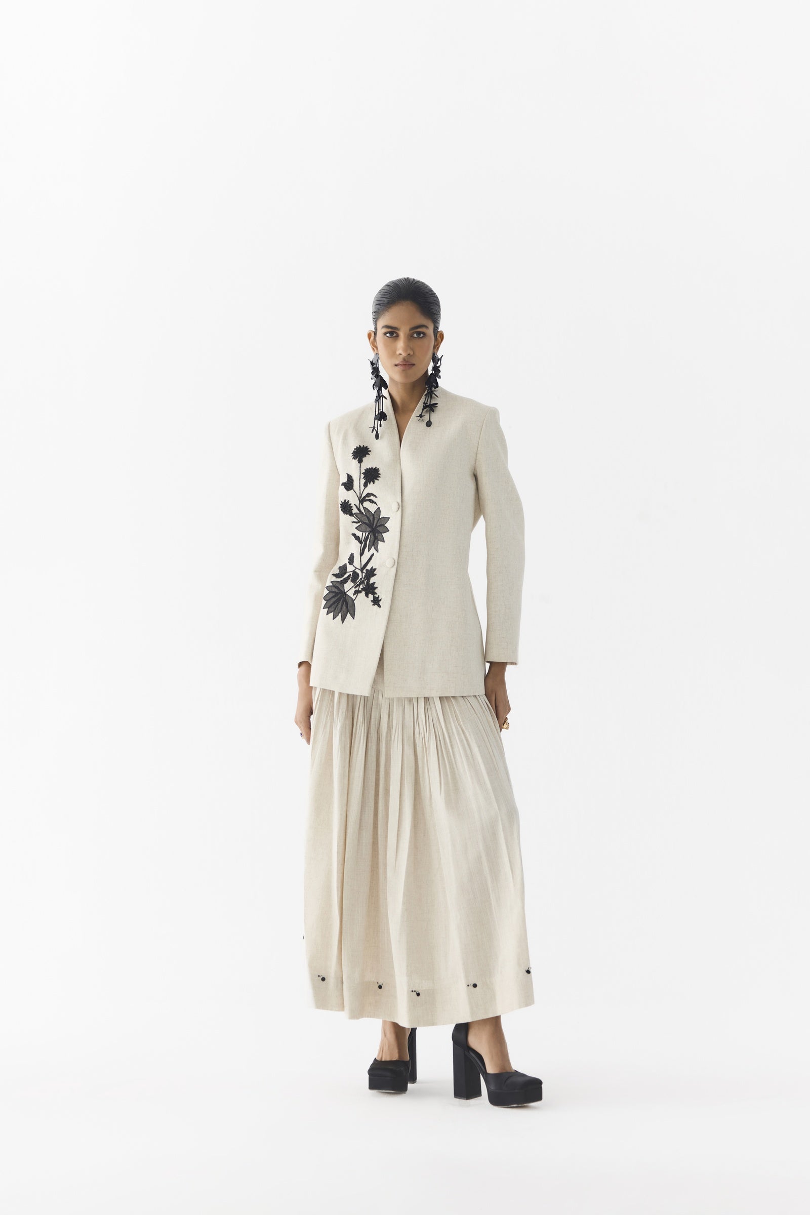 The Tiger Lily Linen Blazer & Skirt, crafted from stunning trans-seasonal viscose linen, form a statement set featuring a fitted blazer with a V-neckline, hand-embroidered organza and bead floral detailing, pockets, and lining, paired with a matching Tiger Lily linen skirt with a side zipper for an elegant look when styled with heels; the model is wearing a size S and is 5'10".