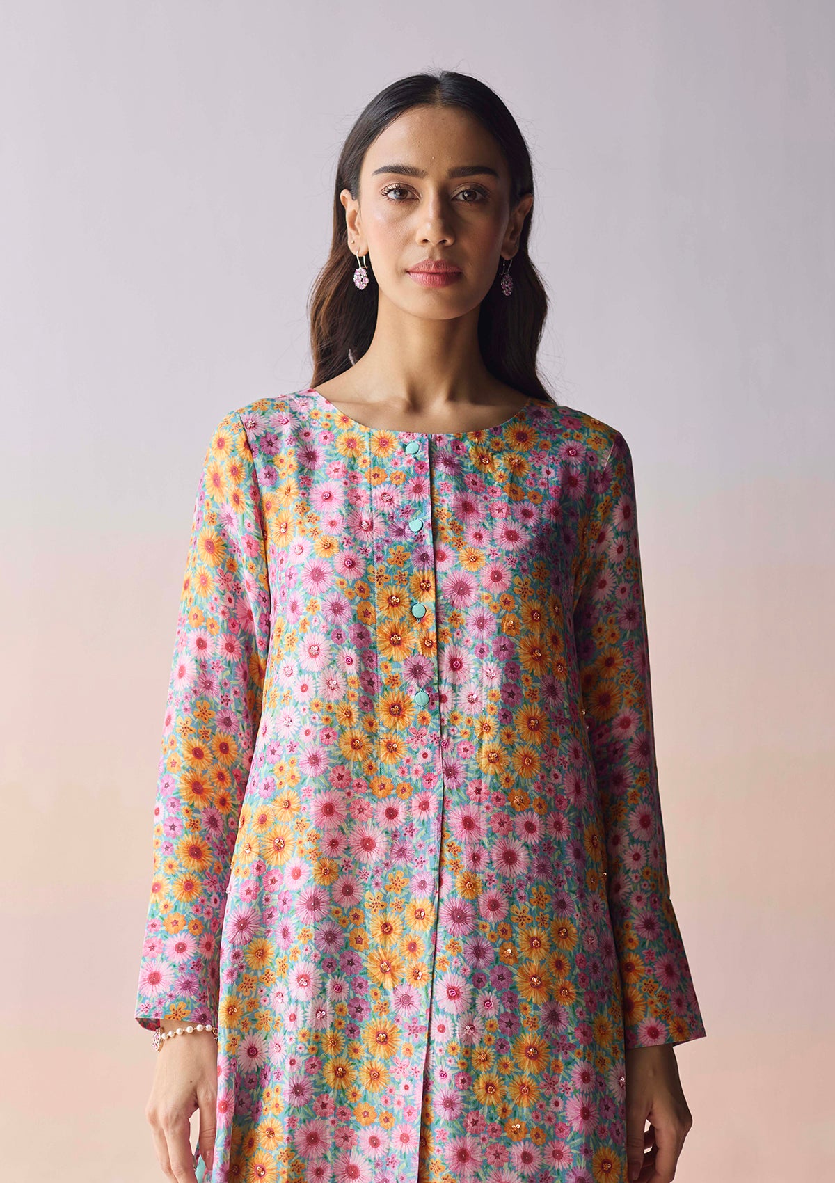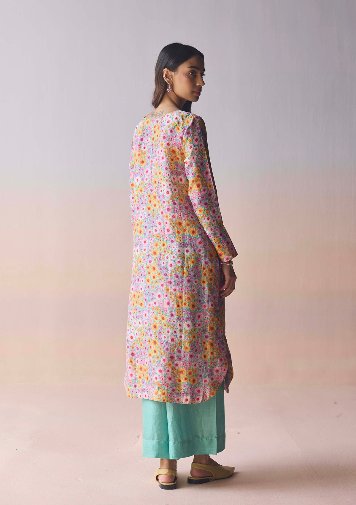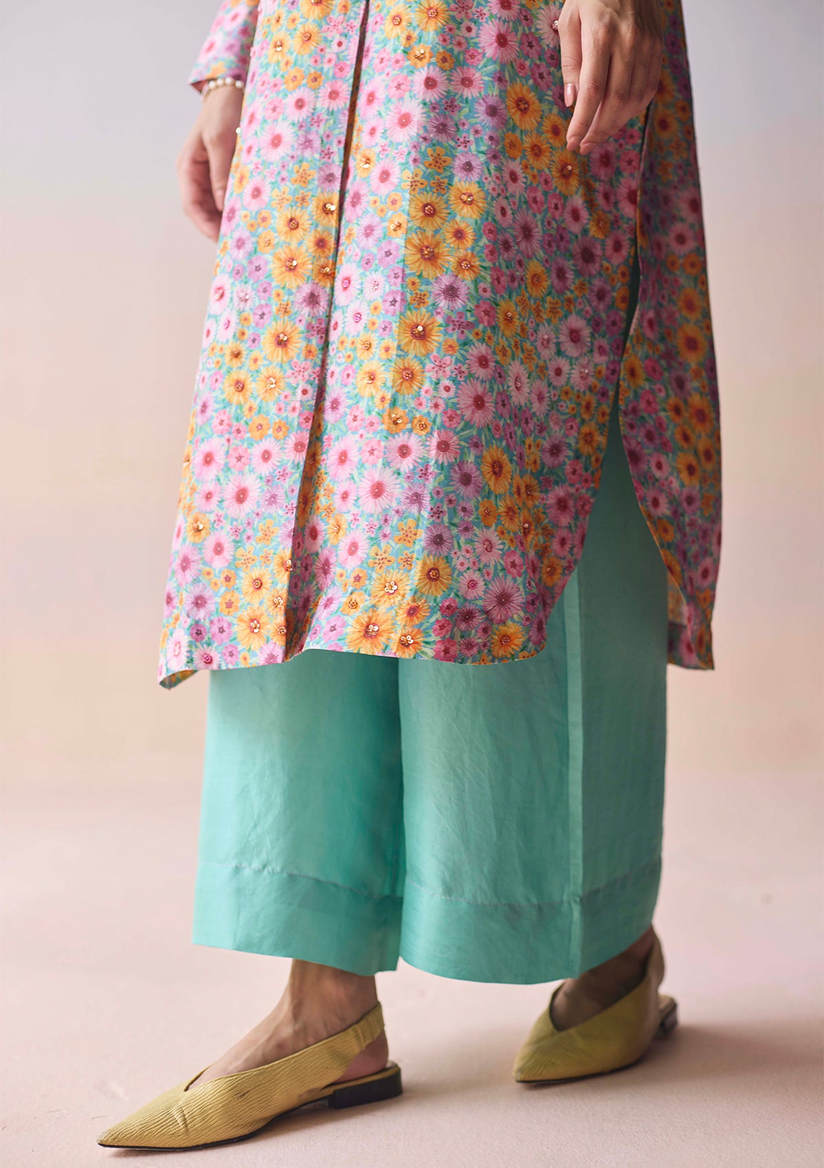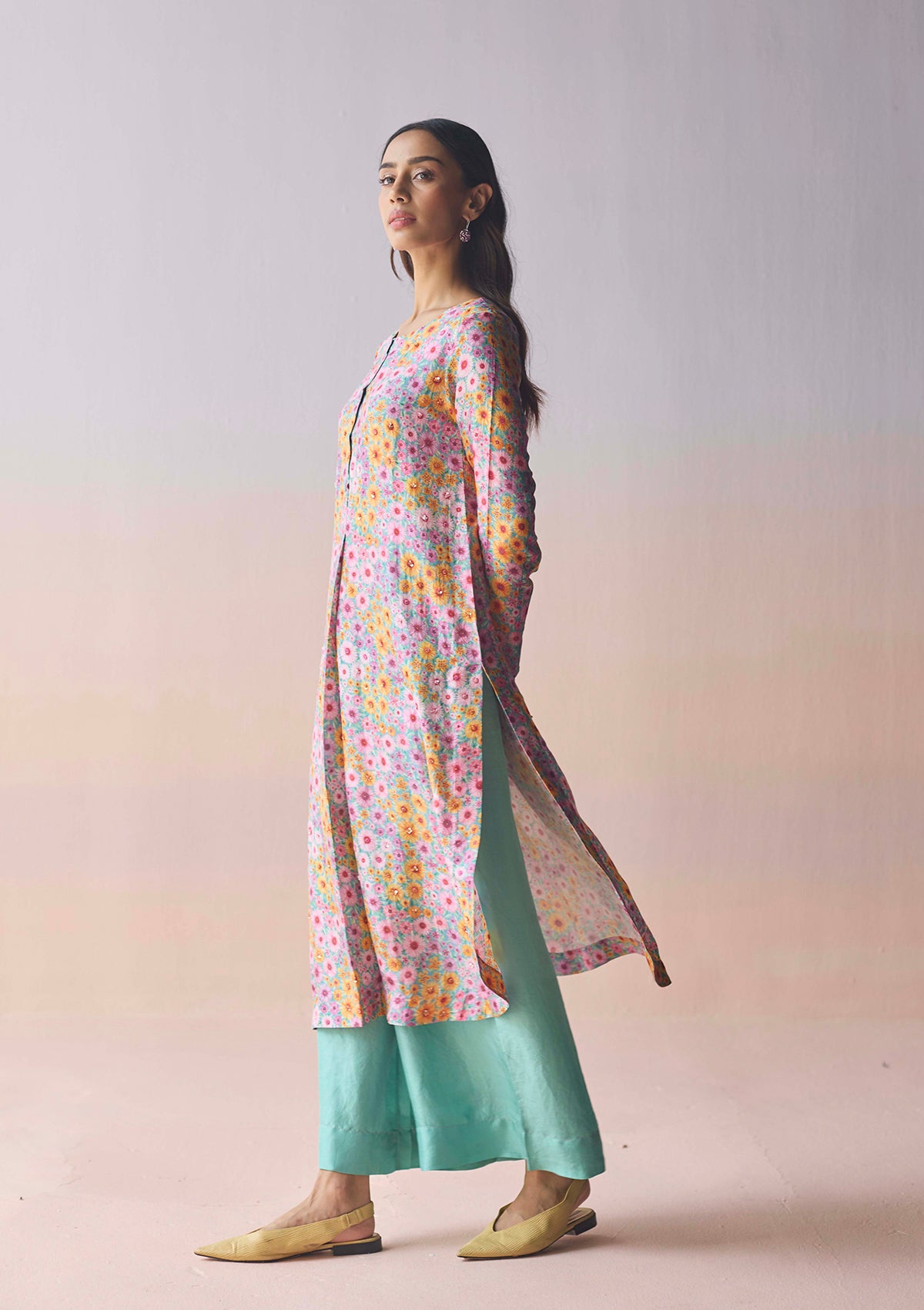 The Wildflower Dawn Kurta Set, blooming in a coral blue hue like a garden touched by first light with a softness that feels quietly radiant and unhurried, is handspun in Malda silk and features a delicate all-over hand-painted floral print, a center-front button opening that adds both detail and ease, buttoned cuffs and a rounded hem that refine its relaxed fit, and wide-bottom pants that complete the set with graceful fluidity; note that the model is 5'7" tall and wearing size XS.