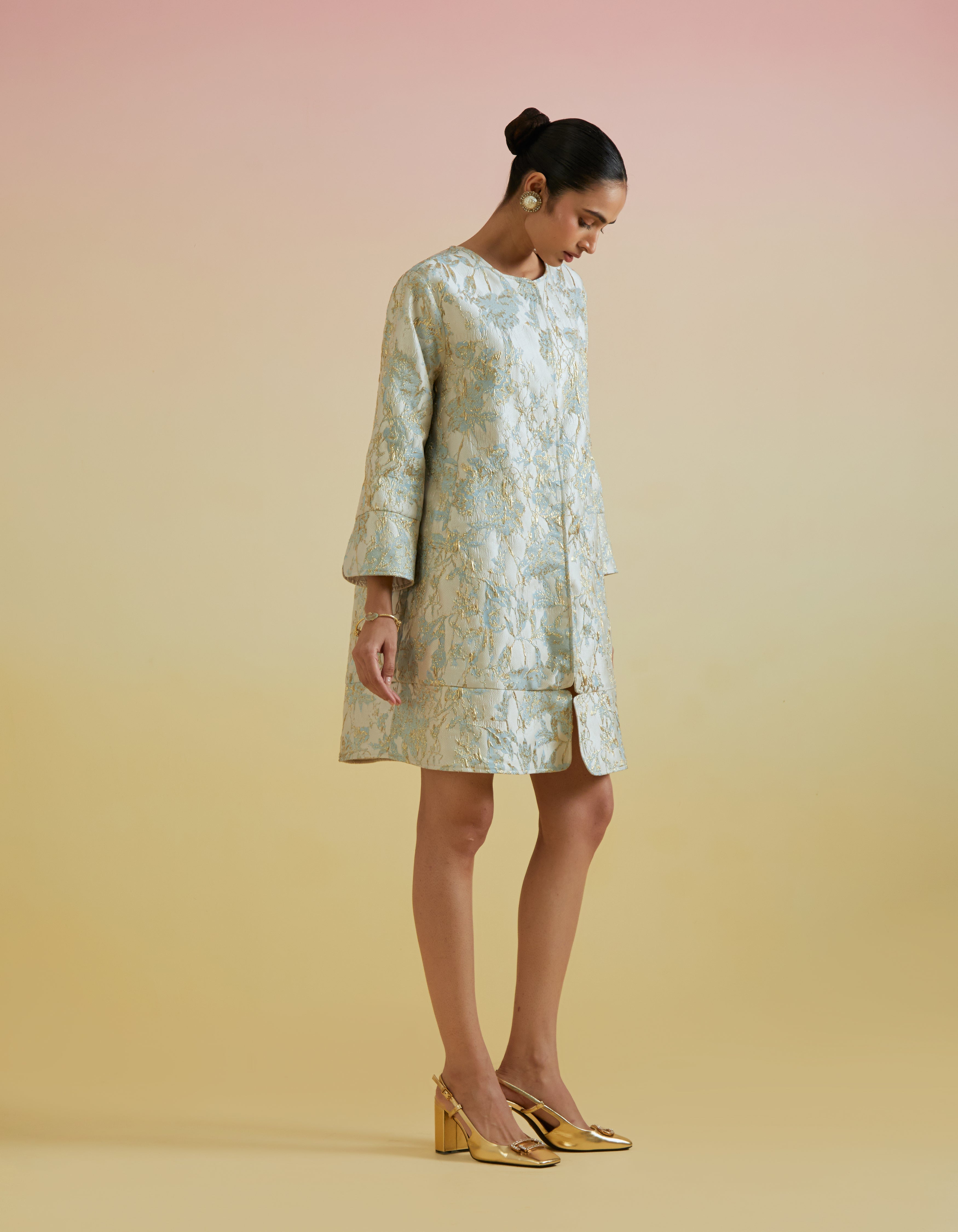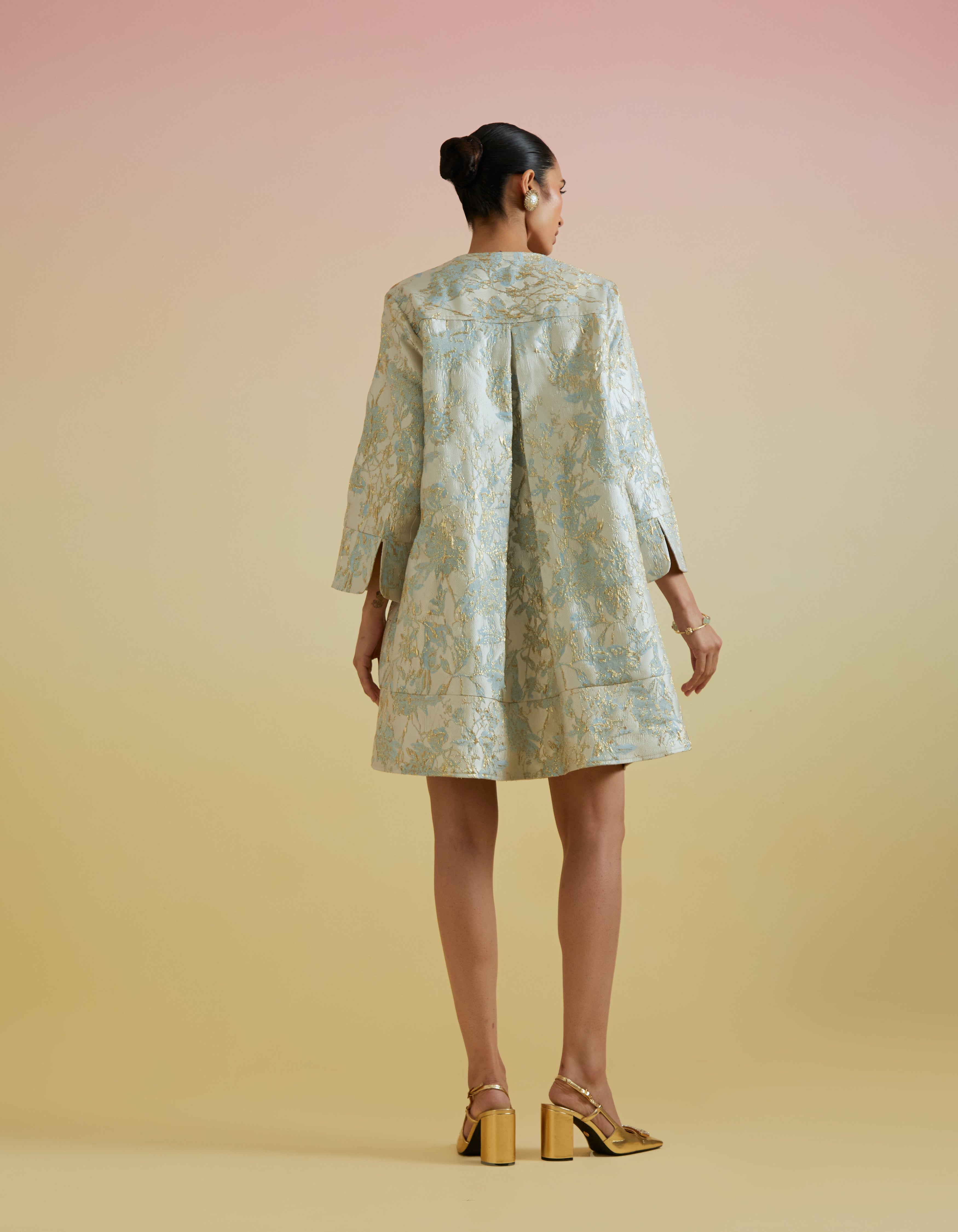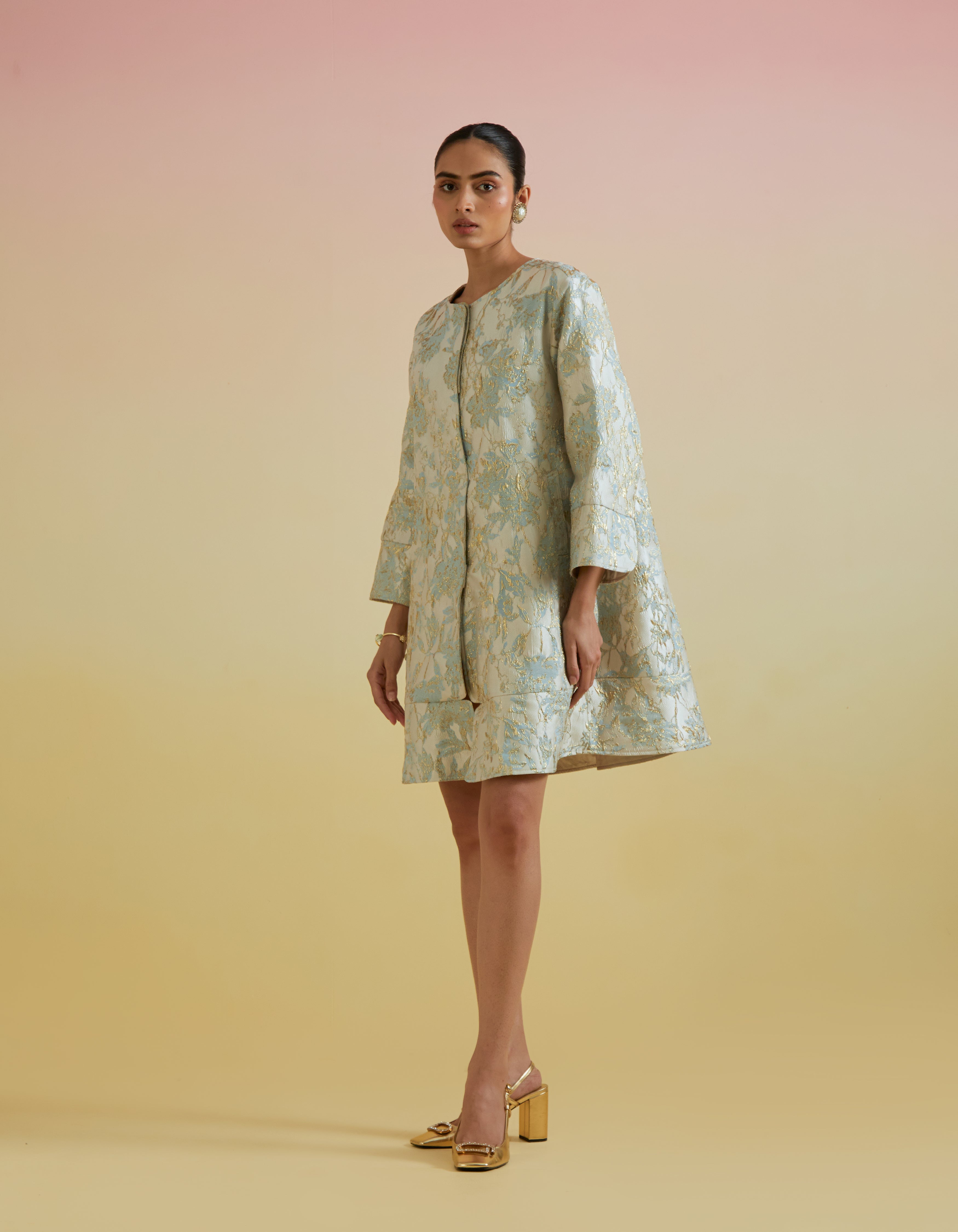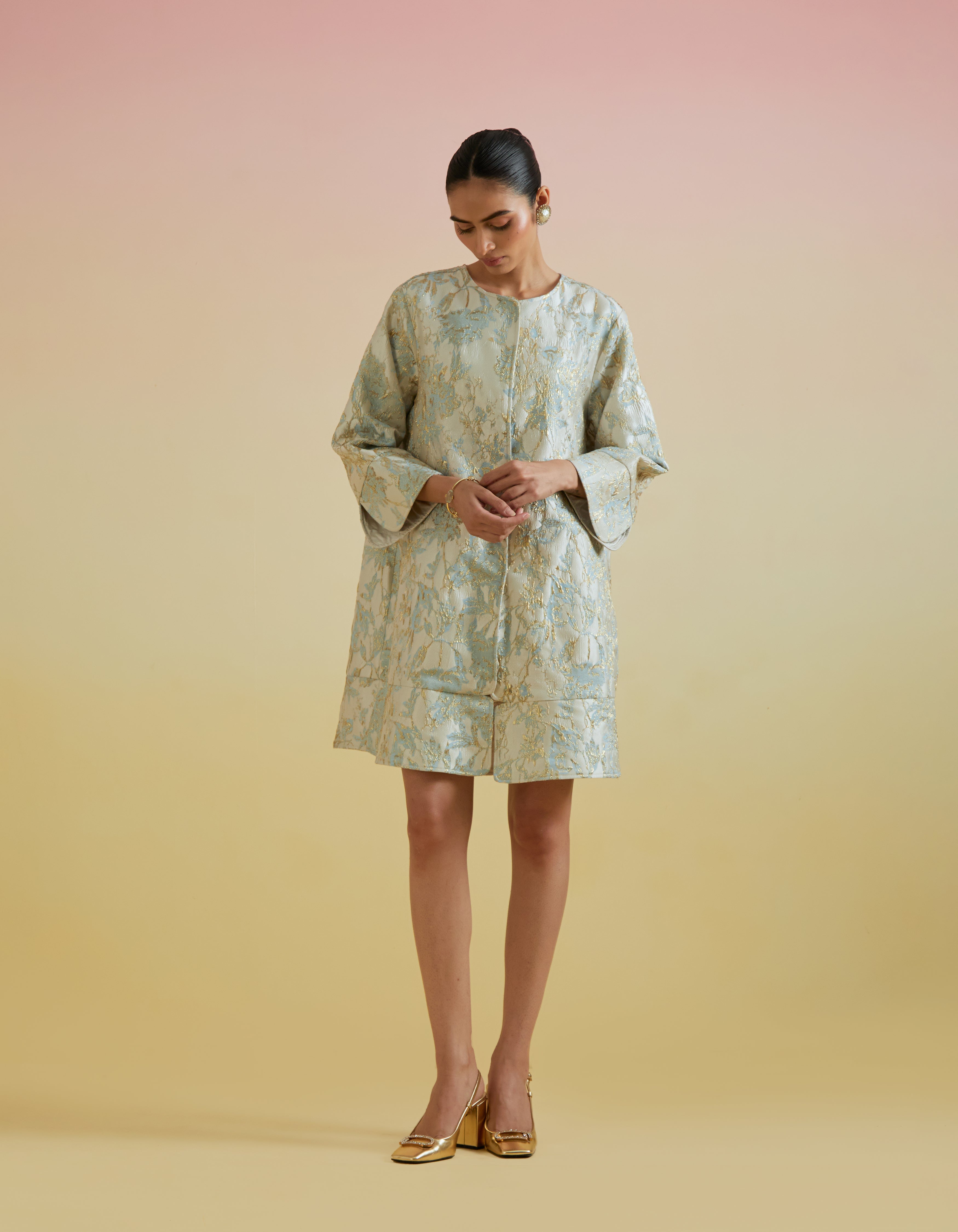 Our Ziva Jacket features a clean round neck , mid-length jacket silhouette that beautifully frames the neckline and enhances the natural shape. The meticulously tailored fit highlights the wearer’s poise, while the subtle textural richness of the brocade adds depth and quiet opulence. Perfect for semi-winter evening occasions, it offers a balance of comfort, elegance, and understated glamour.